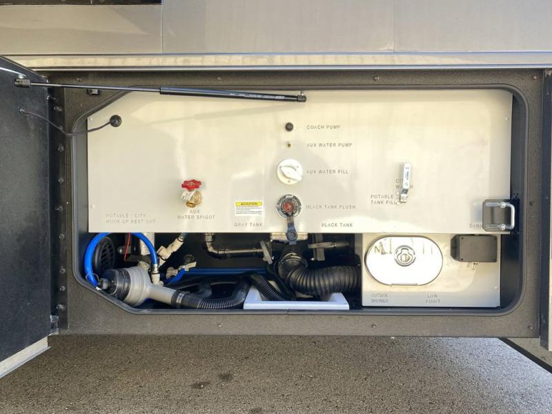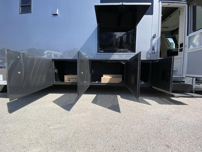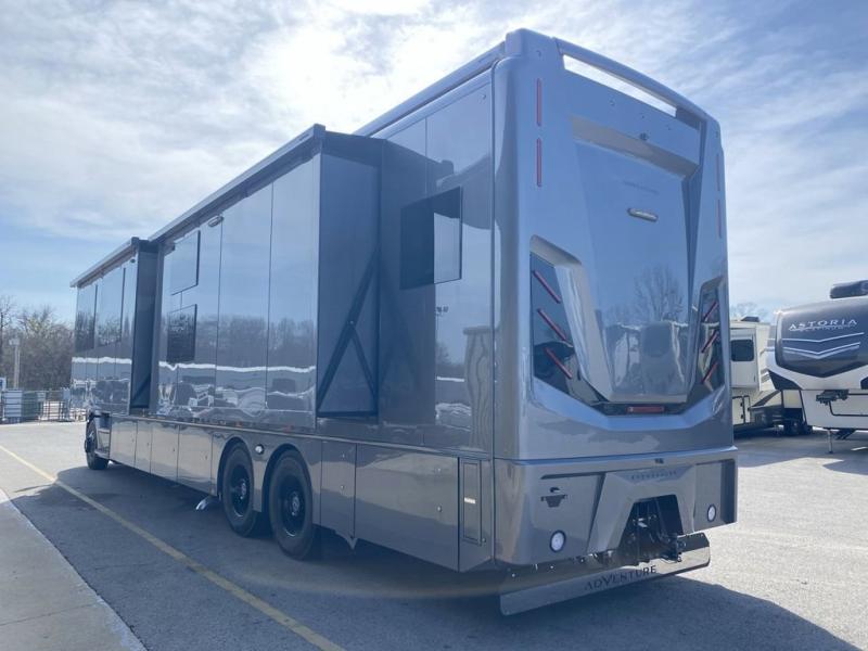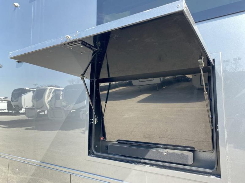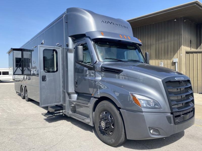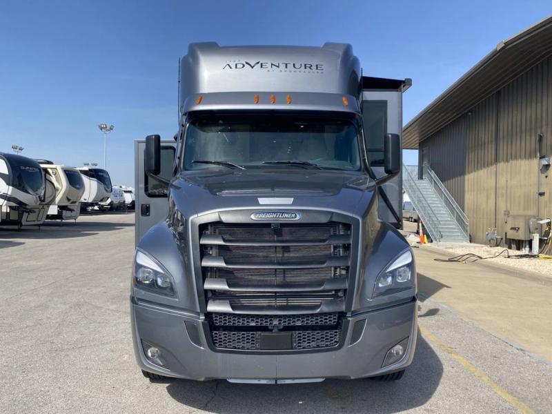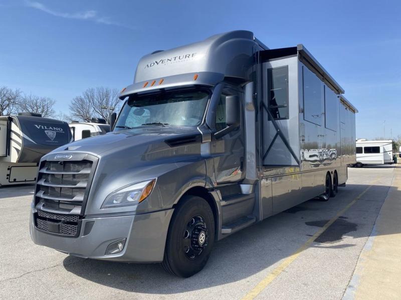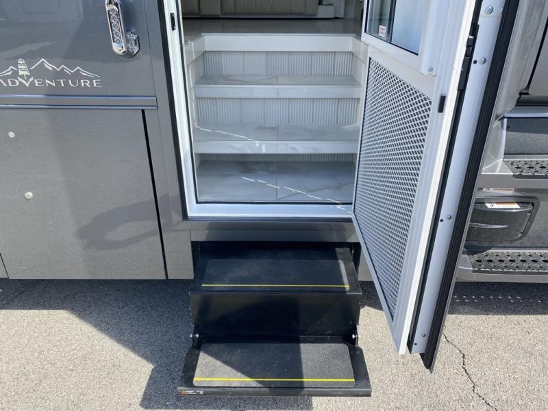 With any Adventure Super C diesel motorhome by ShowHauler, you will find a durable coach made to last thanks to the all-steel cage construction, insulated walls, floors, and ceilings, plus the one-piece 100% walk-on roof! There are lighted storage compartments outside to keep your gear secure, along with a lighted grab handle, and exterior hot/cold shower in the wet bay. You can keep your excursions powered up with the 12.5W Onan diesel generator, 1200W solar package, and Battleborn lithium battery pack. There is also a 360-degree camera/monitor for easy maneuvering and a Firefly Multi-Plex lighting control system for added convenience. You will fall in love with the interior of the Adventure with hardwood cabinets and drawers, porcelain heated tile throughout, Quartz countertops with backsplash in the kitchen, and a tiled shower with a glass door in the bath!