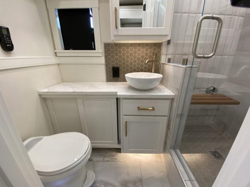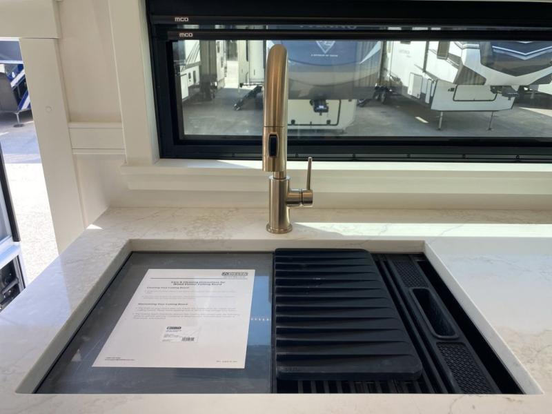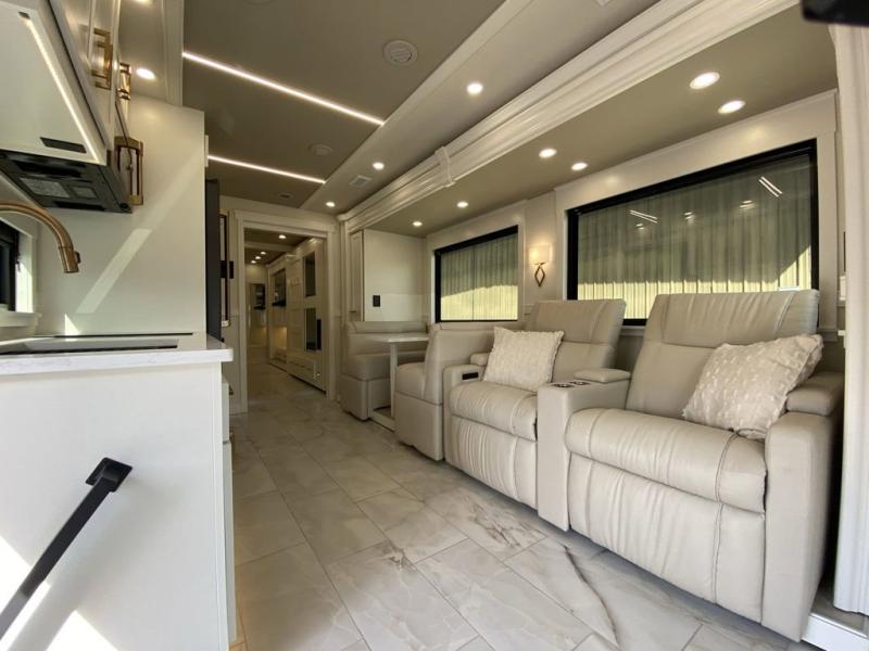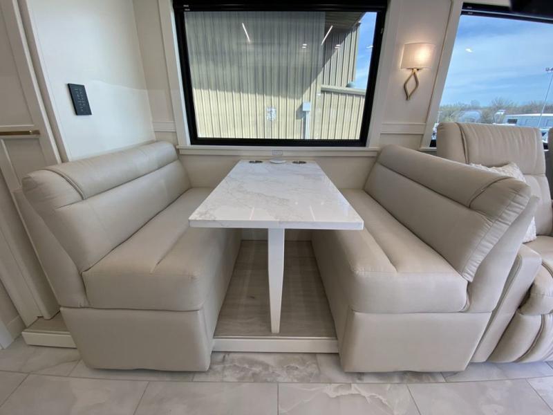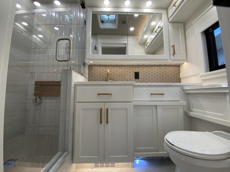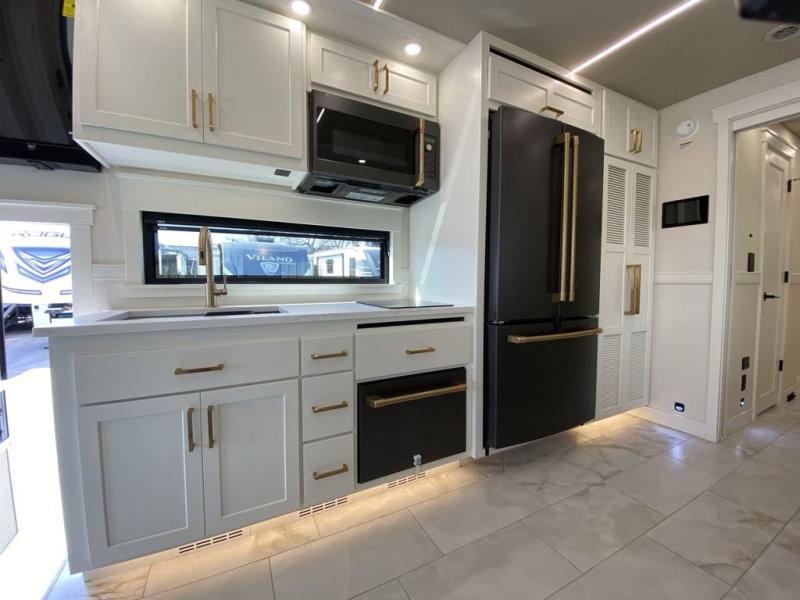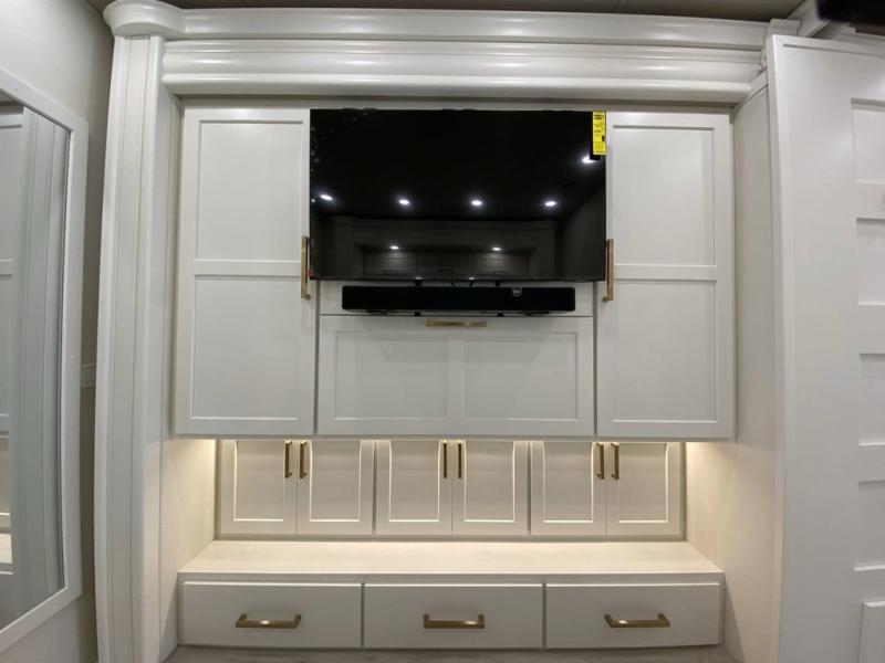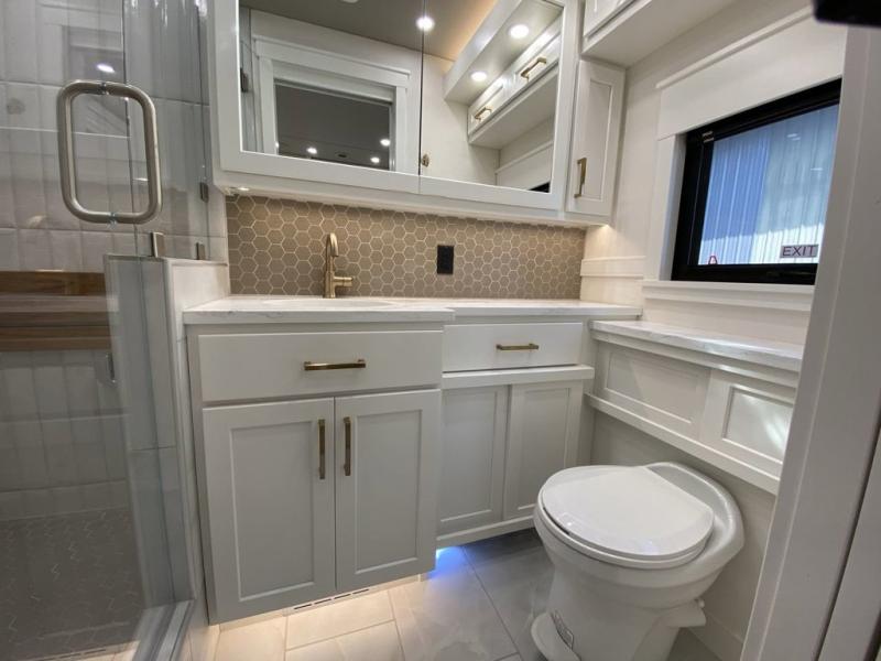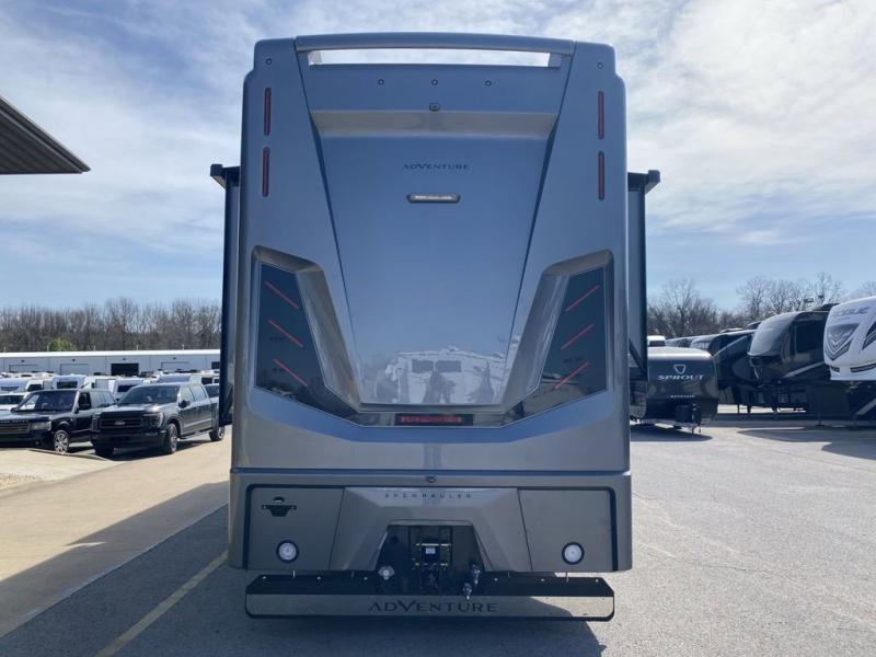 With any Adventure Super C diesel motorhome by ShowHauler, you will find a durable coach made to last thanks to the all-steel cage construction, insulated walls, floors, and ceilings, plus the one-piece 100% walk-on roof! There are lighted storage compartments outside to keep your gear secure, along with a lighted grab handle, and exterior hot/cold shower in the wet bay. You can keep your excursions powered up with the 12.5W Onan diesel generator, 1200W solar package, and Battleborn lithium battery pack. There is also a 360-degree camera/monitor for easy maneuvering and a Firefly Multi-Plex lighting control system for added convenience. You will fall in love with the interior of the Adventure with hardwood cabinets and drawers, porcelain heated tile throughout, Quartz countertops with backsplash in the kitchen, and a tiled shower with a glass door in the bath!