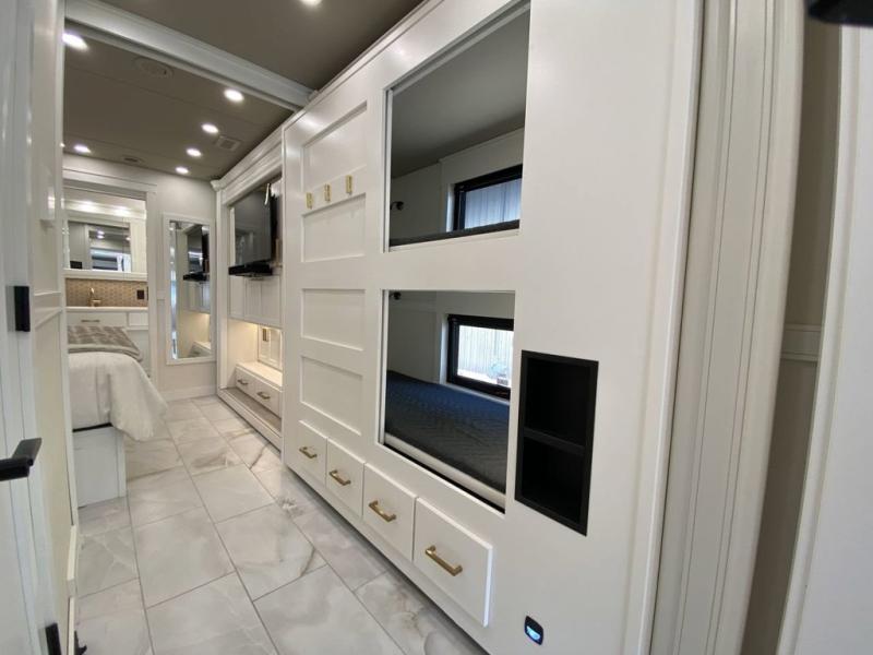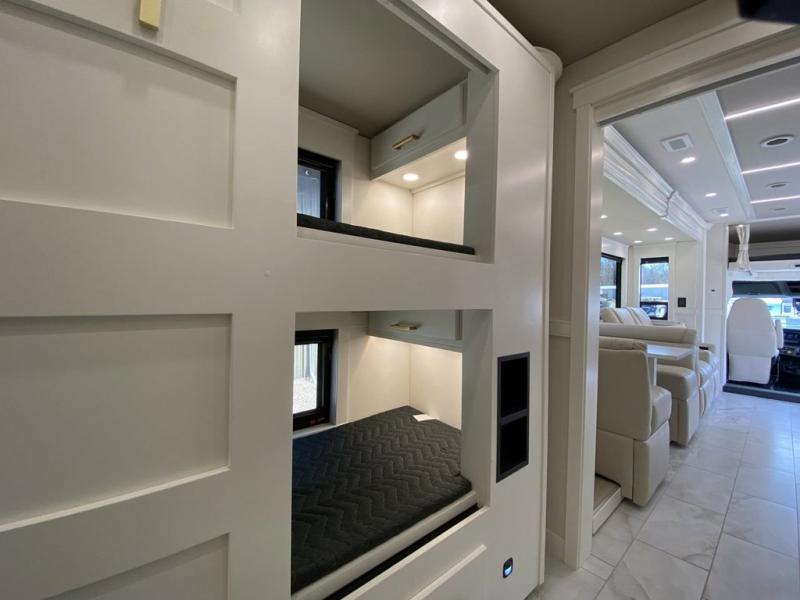 The whole gang will love traveling in this spacious coach that can sleep five thanks to the bunk beds! The front cab also has an option to choose a flip-up bed for more sleeping space, or you can use this area for storage! Not only is there a full bath across from the bunks for easy nighttime use, but there is a second full bath in the back to create a master bedroom. Here, you'll enjoy the mini king bed slide, spacious closet, and 43" LED Smart TV for movies in bed! Once the chef of your group has made dinner on the two-burner induction cooktop or in the convection microwave, you can dine at the booth dinette and maybe play a board game afterwards. There is also Villa theater seating across from a 50" LED Smart TV to watch your favorite shows, although you might just find yourselves outdoors utilizing the exterior TV!