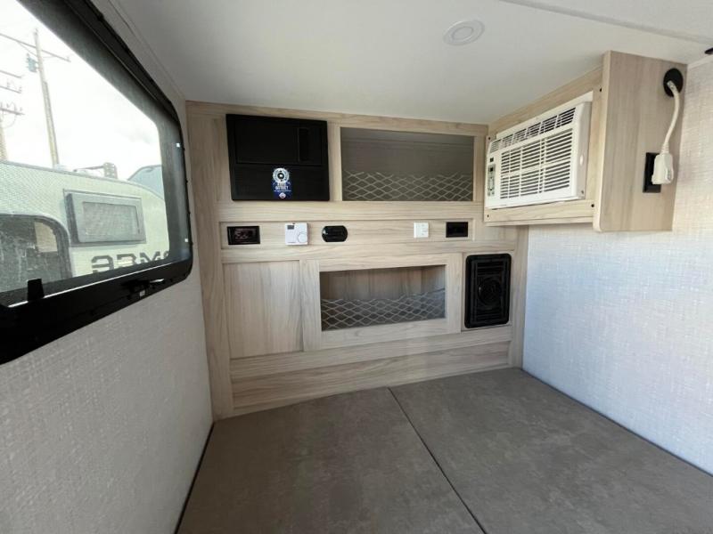 You'll enjoy are more spacious interior in this teardrop trailer, along with dual entry doors so you won't feel like you're climbing on each other to get out in the morning. There is a front countertop with storage space below for your things, and you're sure to sleep great on the 4-inch, deluxe comfort quilted bed mattress. There is also a vent plus a cozy fireplace that will keep you warm. The exterior kitchenette includes a microwave, 12V refrigerator plus a Blackstone Griddle to make your best burgers. This model also includes a 5,000 BTU wall-mounted A/C to help keep you cool during the warmer camping months!
