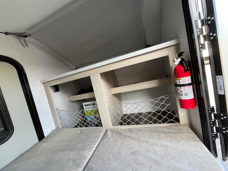 You'll enjoy are more spacious interior in this teardrop trailer, along with dual entry doors so you won't feel like you're climbing on each other to get out in the morning. There is a front countertop with storage space below for your things, and you're sure to sleep great on the 4-inch, deluxe comfort quilted bed mattress. There is also a vent plus a cozy fireplace that will keep you warm. The exterior kitchenette includes a microwave, 12V refrigerator plus a Blackstone Griddle to make your best burgers. This model also includes a 5,000 BTU wall-mounted A/C to help keep you cool during the warmer camping months!