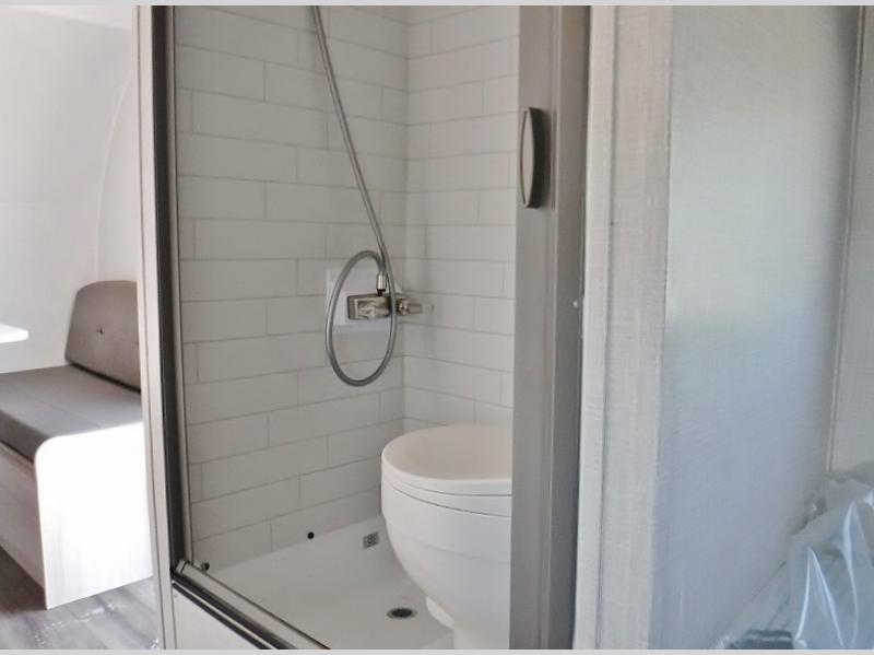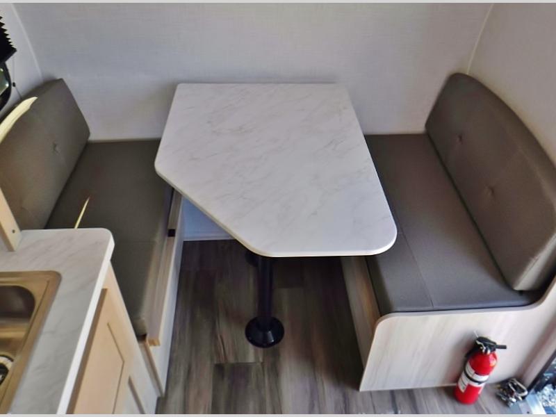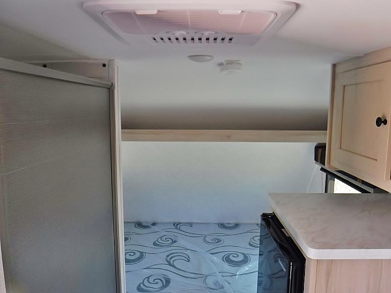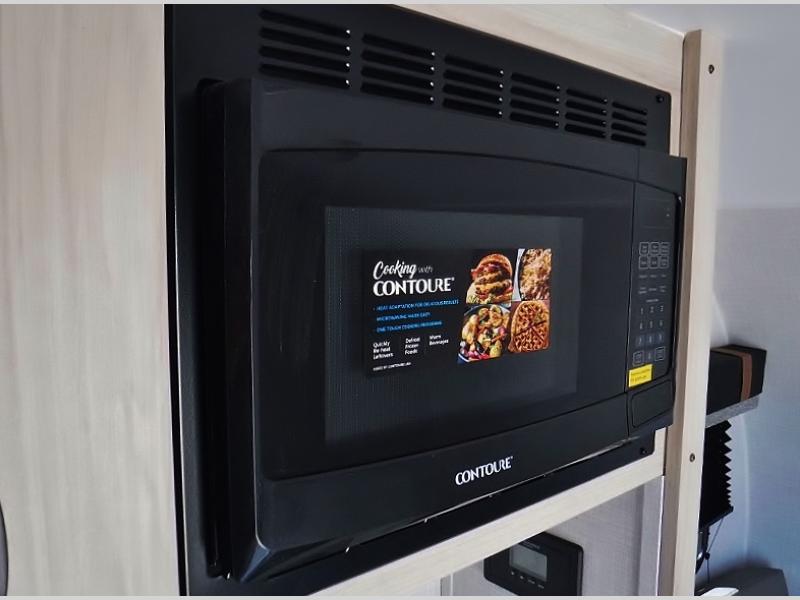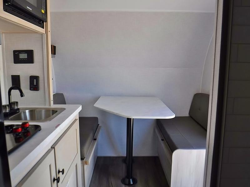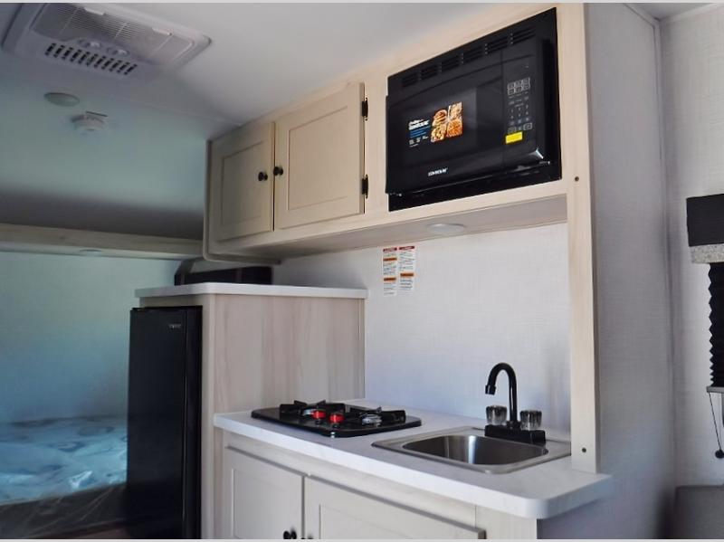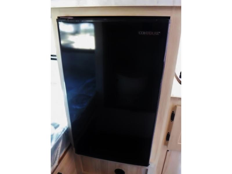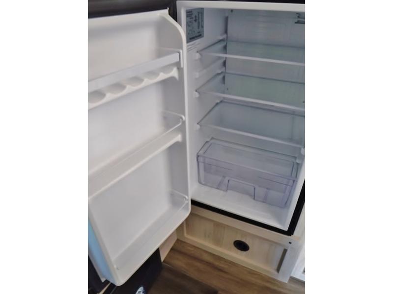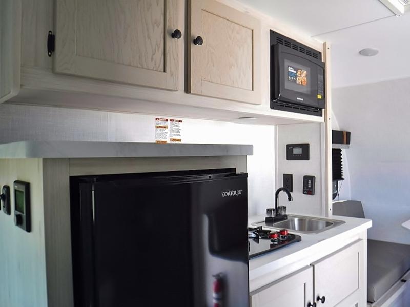 If you're looking for a little more space and comfort, this trailer may just be the one for you! The queen bed in the back will provide a great night's rest after exploring all day, and the overhead shelf will let you organize your books and belongings. You can freshen up in the wet bath with an integrated shower and toilet, then start breakfast on the two burner cooktop. There is also a microwave oven for instant oatmeal and a 3.3 cu. ft. Super Chill 12V refrigerator where milk can be stored.