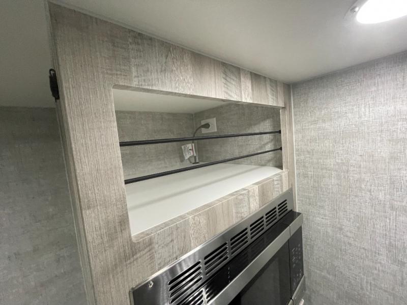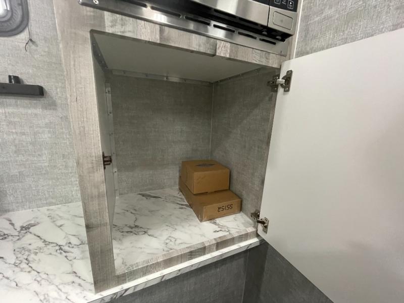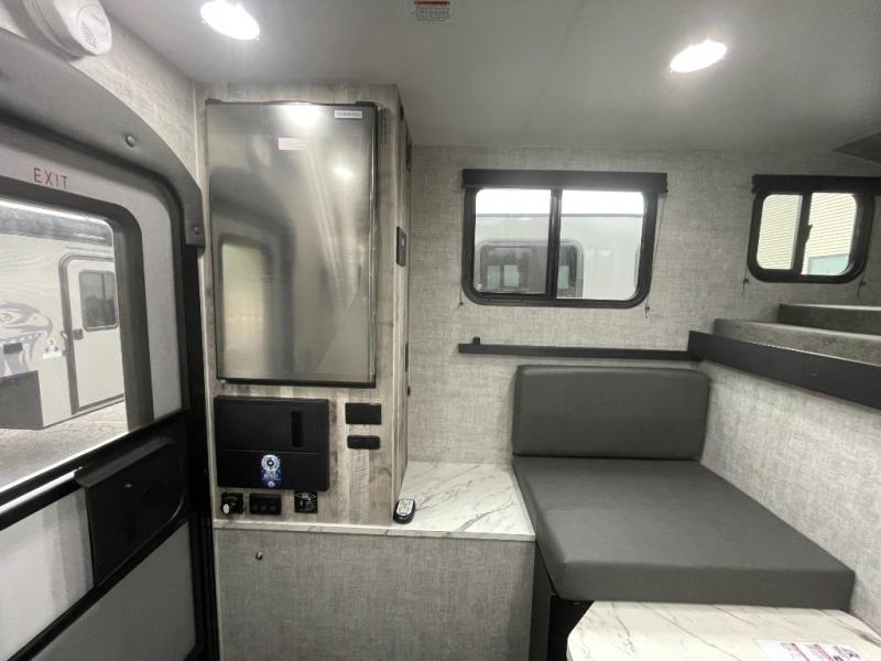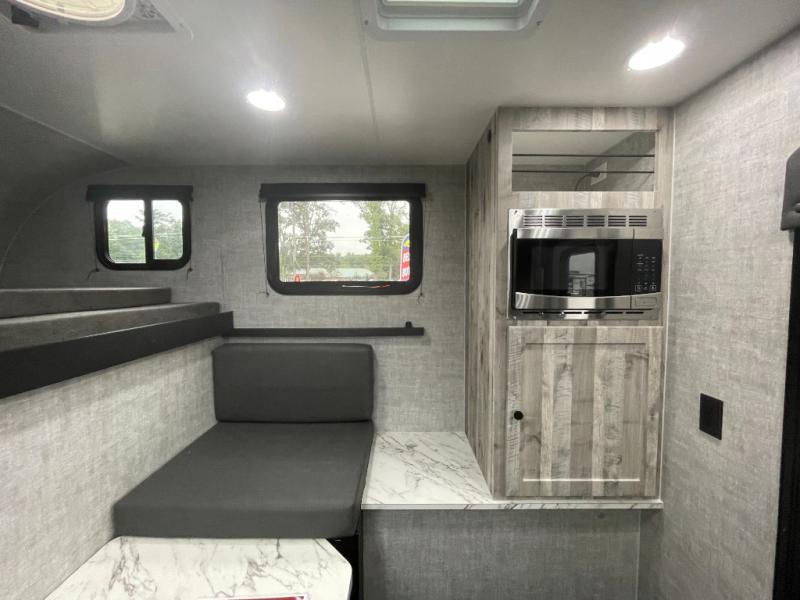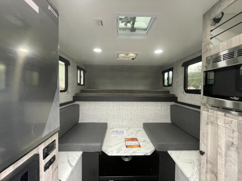 Head to your favorite destinations in this truck camper! The cab over bed will have you feeling recharged and ready to go each morning, plus the 30" wide dinette can also convert into an extra sleeping space. And if you want an extra 80" in length, choose the optional North/South pull-out bed in place of the cab over bed! The countertop space on either side of the camper will make it easier to prepare your delicious meals and the optional microwave would come in handy on those days when you only have time to reheat leftovers. With the large wardrobe cabinet, there is space for hanging clothes and next to it is a portable toilet. If you want extra perks then you can add options like a Truma furnace, a roof air conditioner, and a solar panel roof system to go off the grid!