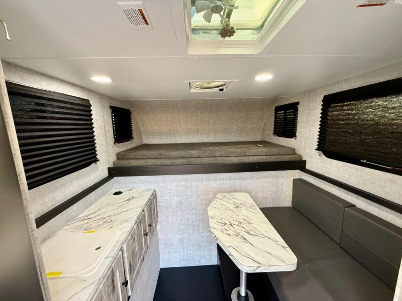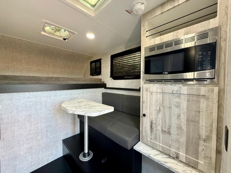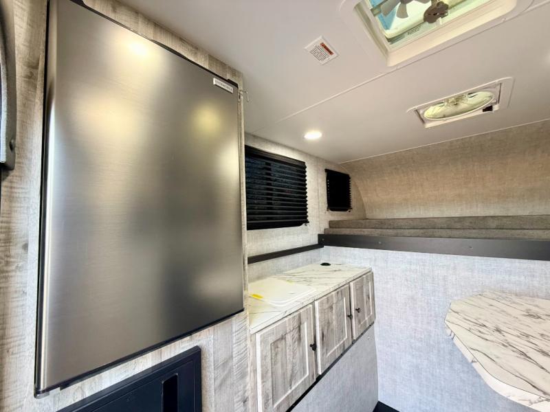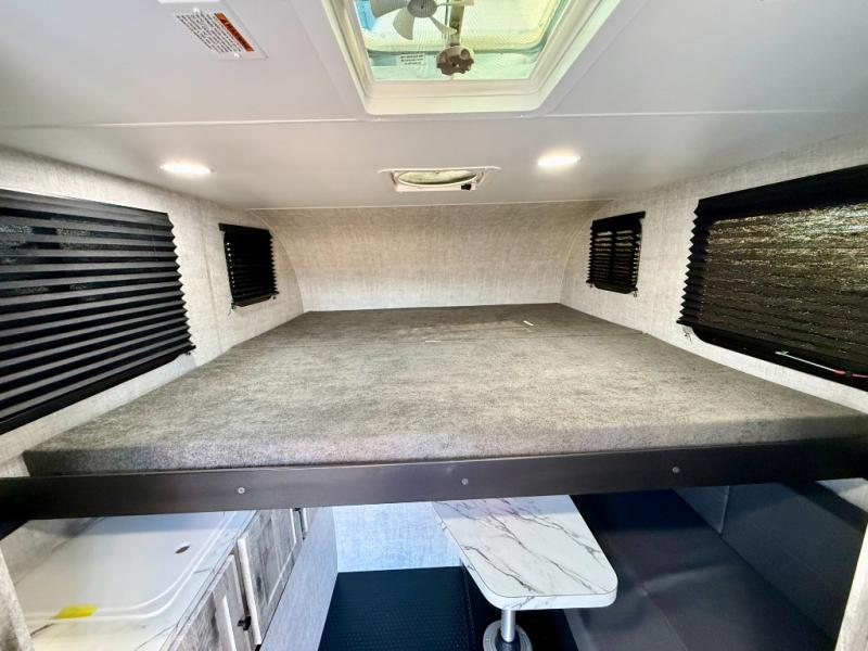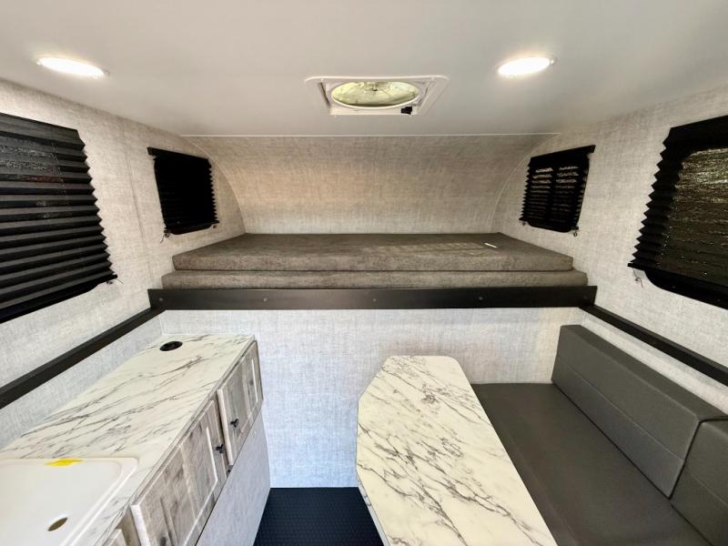 You can explore in complete comfort with this truck camper on your back! There is a comfortable 45" x 80" bunk up front to sleep on, or you can choose the optional 80" x 81" pull-out North/South bed. A two person dinette with a bench seat and fold-away table provides a place to enjoy your meal after it's been prepared on the two burner electric cooktop. There is also a 12V refrigerator that comes standard and an optional microwave oven if you want meals on the go. The portable cooktop can also be taken outside for added convenience, and the dinette can be converted for additional sleeping space for a guest. You can even add an optional commode to make camping trips that much easier!
