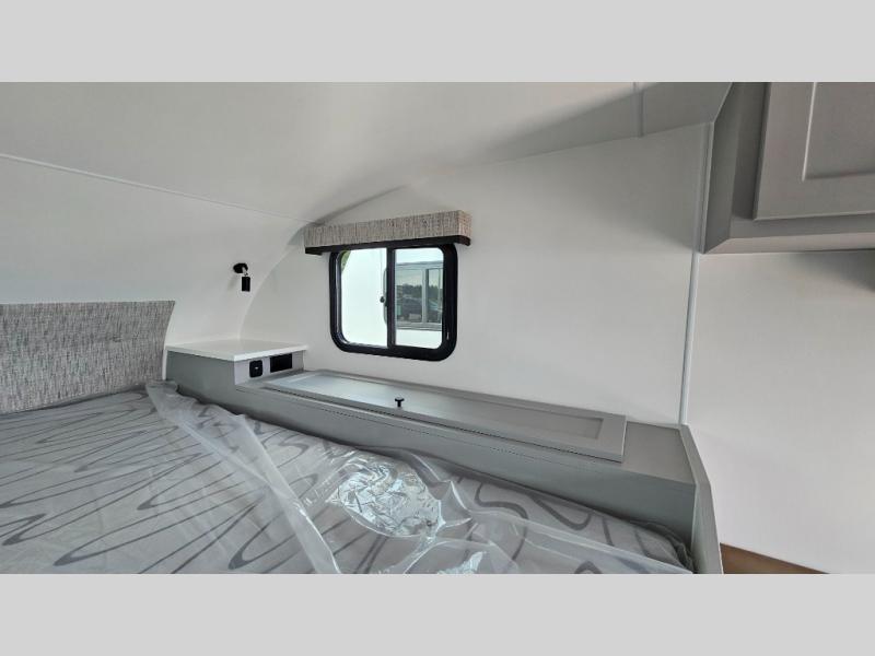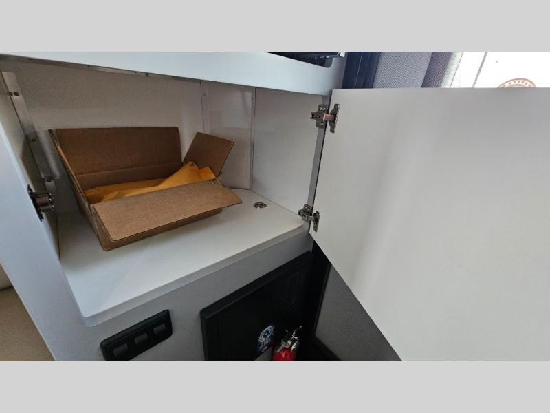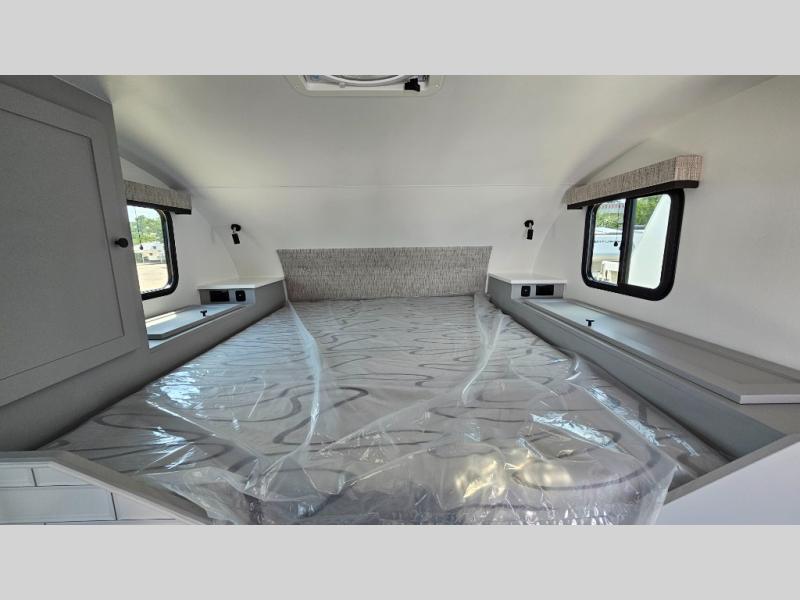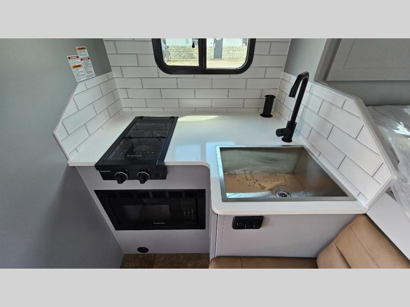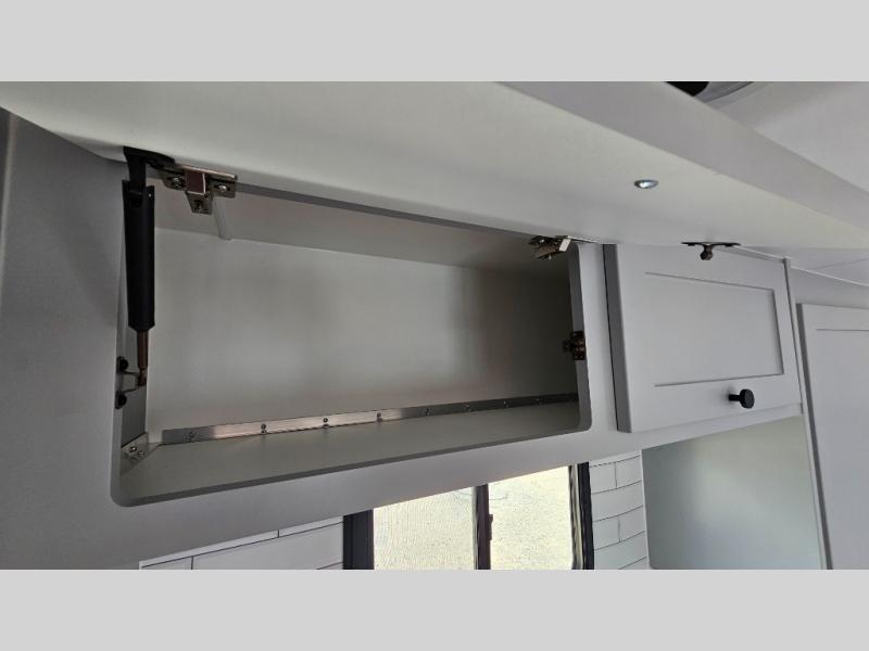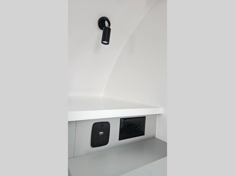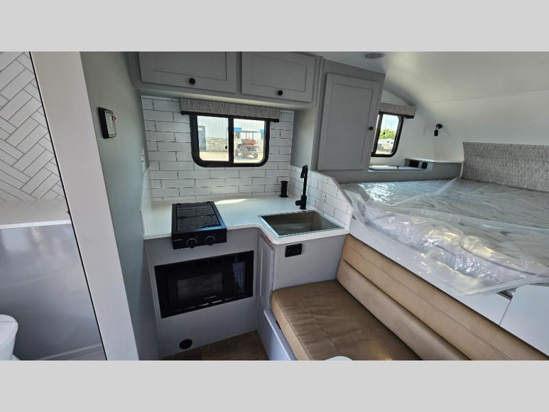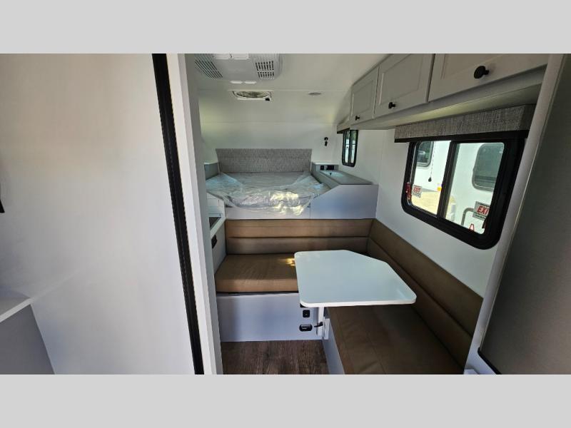 Like all Soaring Eagle Campers, the AERIE is constructed of all welded, tubular aluminum and composites, and features a fully enclosed and heated basement design; TRUMA Combi high-efficiency furnace/water heater; electric jacks, spacious bathroom/shower with plenty of room to maneuver (40”x40”); 12V refrigerator, nice size kitchen area with 2 burner cooktop range, microwave/convection/air fryer oven, and loads of storage. The open floorplan makes the AERIE feel like a much larger camper which is enhanced by automotive grade foam in the faux leather covered dinette seating and residential quality queen bed mattress with memory foam top. The permanent North/South bed has dual nightstands with built-in chargers/outlets; lots of storage space along the side of each bed, and more – ALL STANDARD in the base price tag!