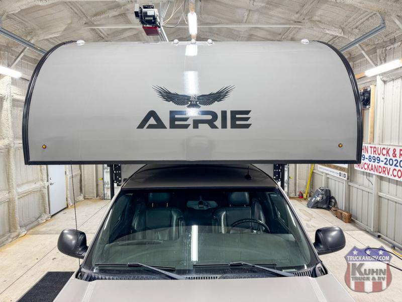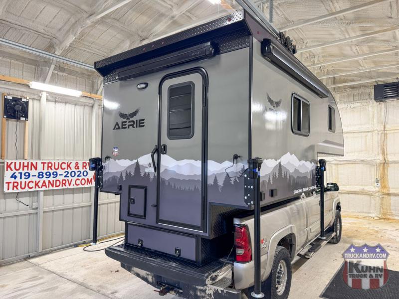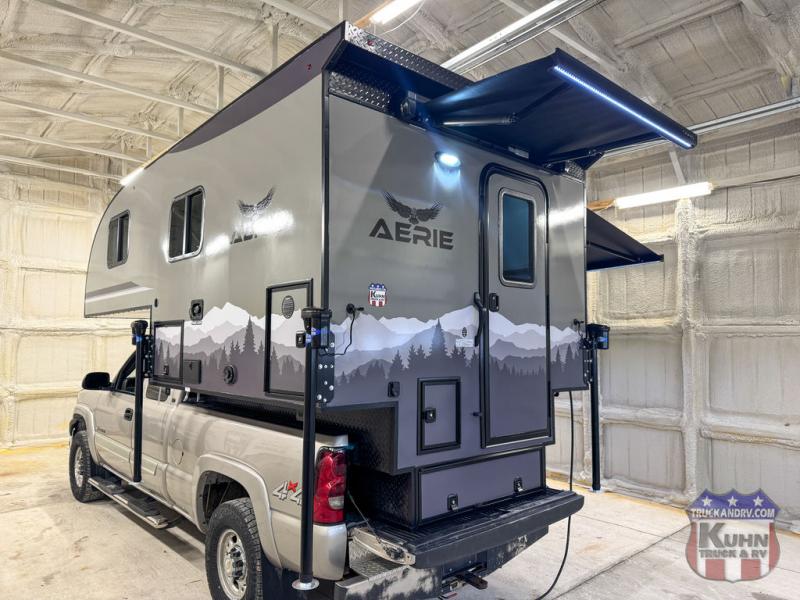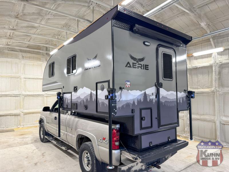 The AERIE truck camper by Soaring Eagle is engineered and constructed to stand the test of time with its welded, tubular aluminum and composites and no wood throughout! This truck camper is designed for 3/4 ton and one-ton trucks and can fit an 8' bed with the tailgate closed. This allows you to use your own rear-view camera/sensors plus built-in steps that your truck may have. You'll also appreciate the fully enclosed and heated basement design for the best installation in its class, electric jacks for easy set-up, and a 20 lb. LP tank with a gauge. The interior of the AERIE will have you feeling right at home with its open floorplan, spacious bath, functional kitchen, and generous storage spaces!