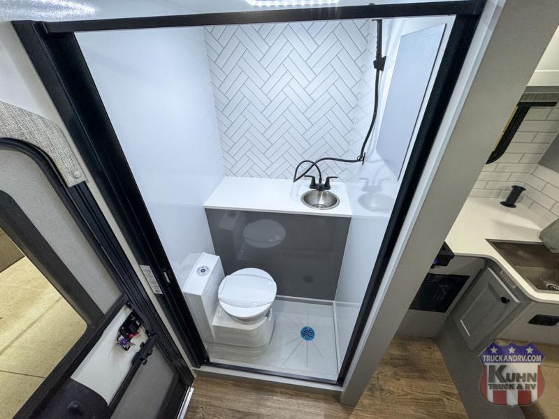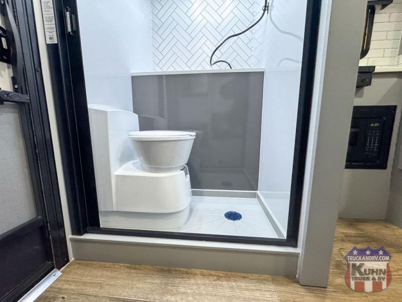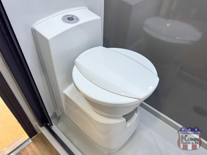 Spacious 40" x 40" wet bath with a ceramic cassette toilet and privacy door