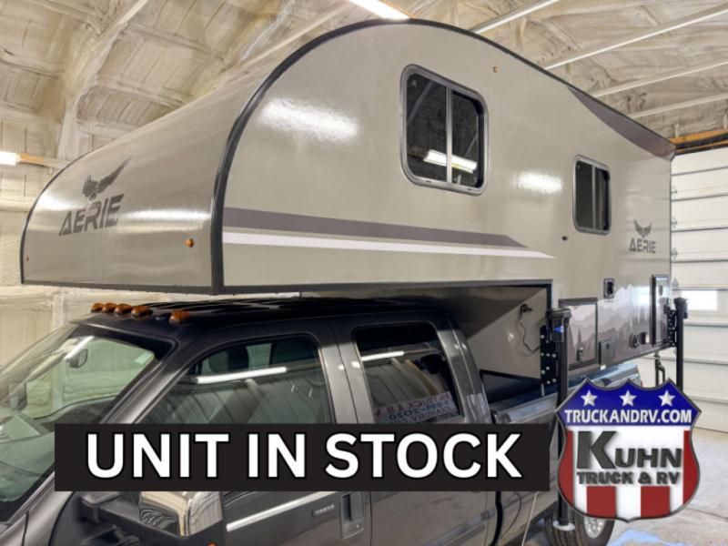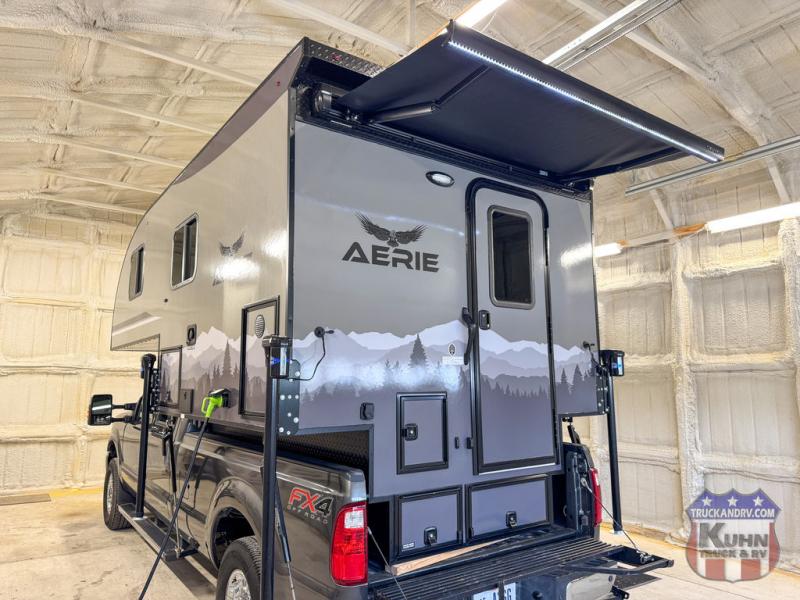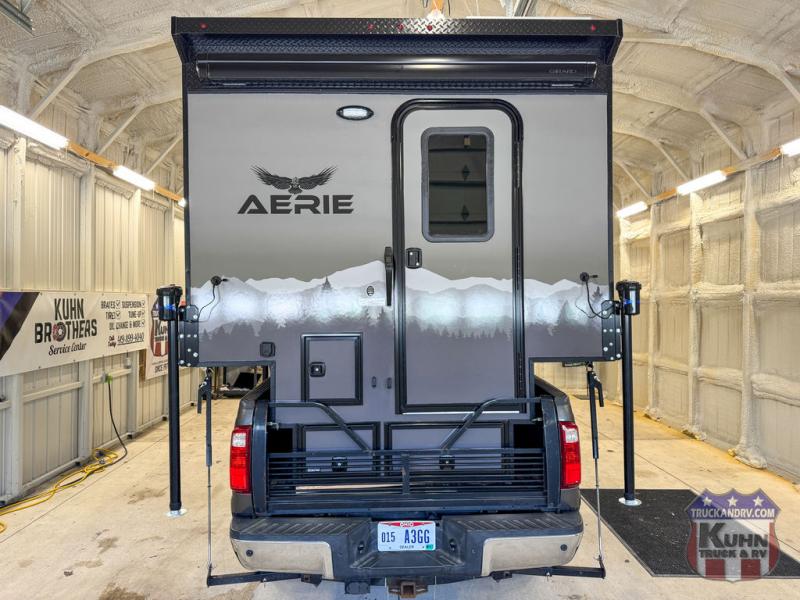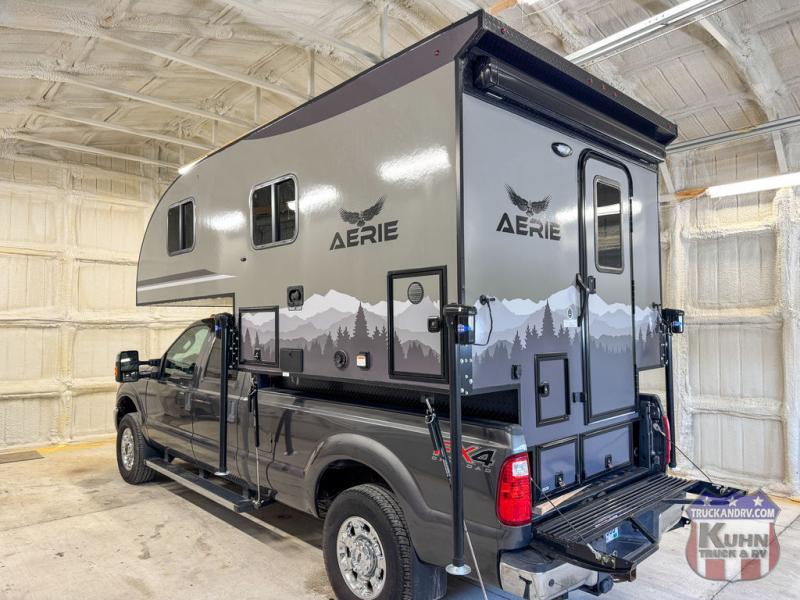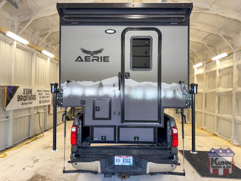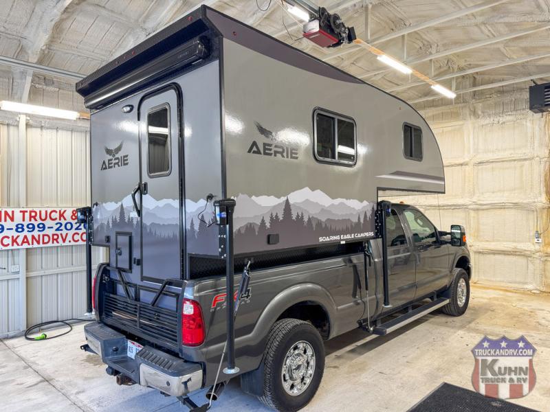 The AERIE truck camper by Soaring Eagle is engineered and constructed to stand the test of time with its welded, tubular aluminum and composites and no wood throughout! This truck camper is designed for 3/4 ton and one-ton trucks and can fit an 8' bed with the tailgate closed. This allows you to use your own rear-view camera/sensors plus built-in steps that your truck may have. You'll also appreciate the fully enclosed and heated basement design for the best installation in its class, electric jacks for easy set-up, and a 20 lb. LP tank with a gauge. The interior of the AERIE will have you feeling right at home with its open floorplan, spacious bath, functional kitchen, and generous storage spaces!