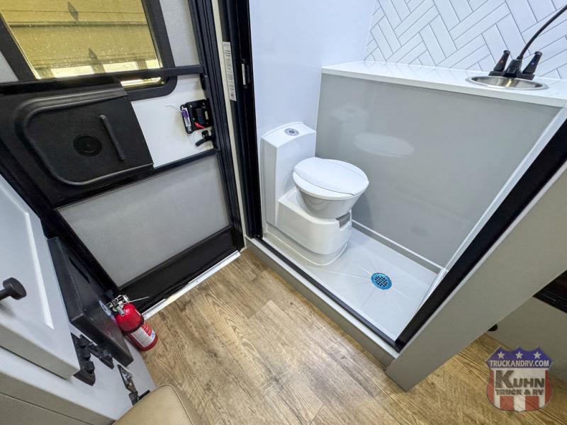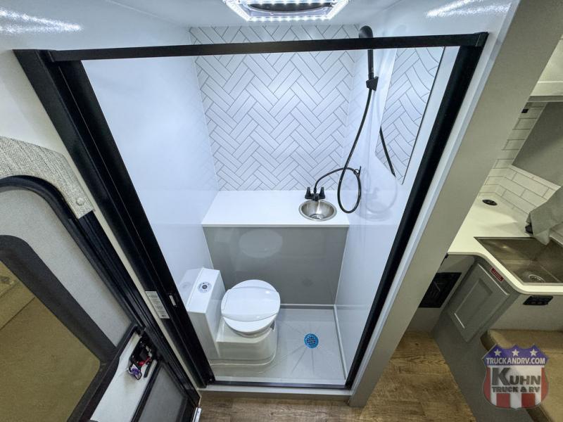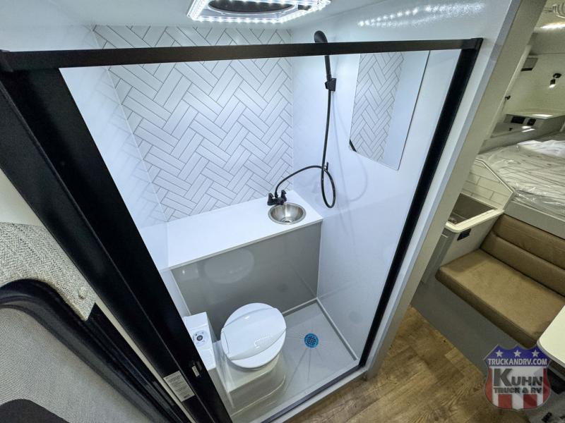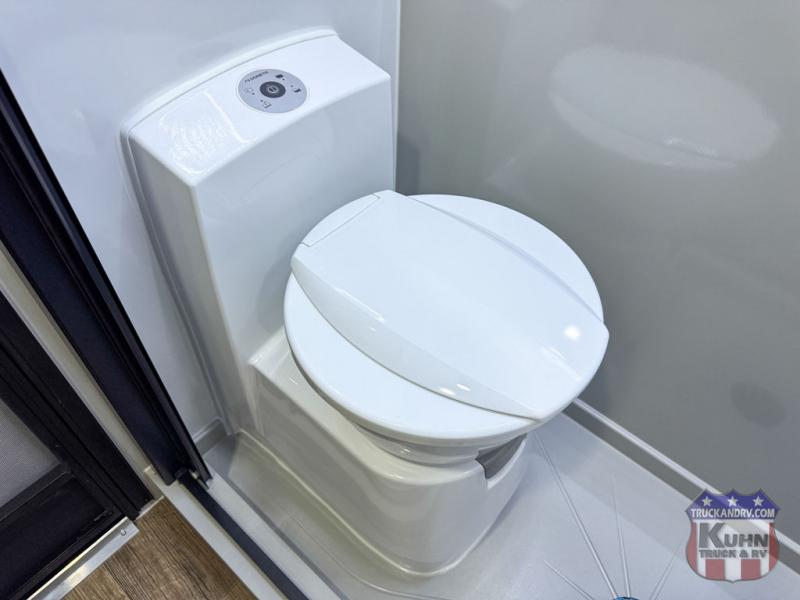 Spacious 40" x 40" wet bath with a ceramic cassette toilet and privacy door