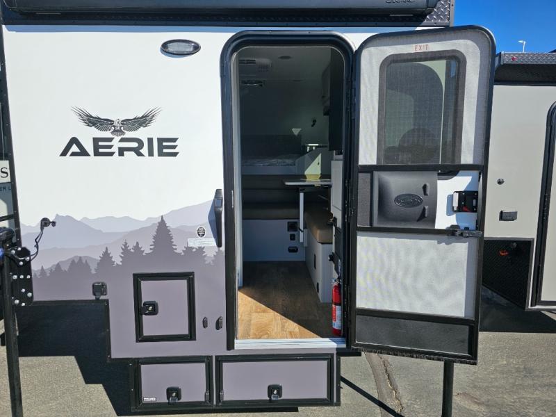 The AERIE truck camper by Soaring Eagle is engineered and constructed to stand the test of time with its welded, tubular aluminum and composites and no wood throughout! This truck camper is designed for 3/4 ton and one-ton trucks and can fit an 8' bed with the tailgate closed. This allows you to use your own rear-view camera/sensors plus built-in steps that your truck may have. You'll also appreciate the fully enclosed and heated basement design for the best installation in its class, electric jacks for easy set-up, and a 20 lb. LP tank with a gauge. The interior of the AERIE will have you feeling right at home with its open floorplan, spacious bath, functional kitchen, and generous storage spaces!