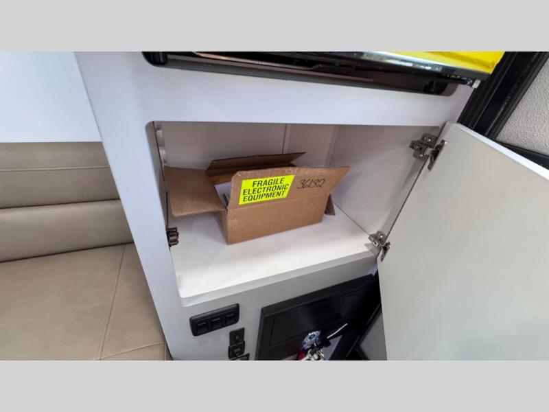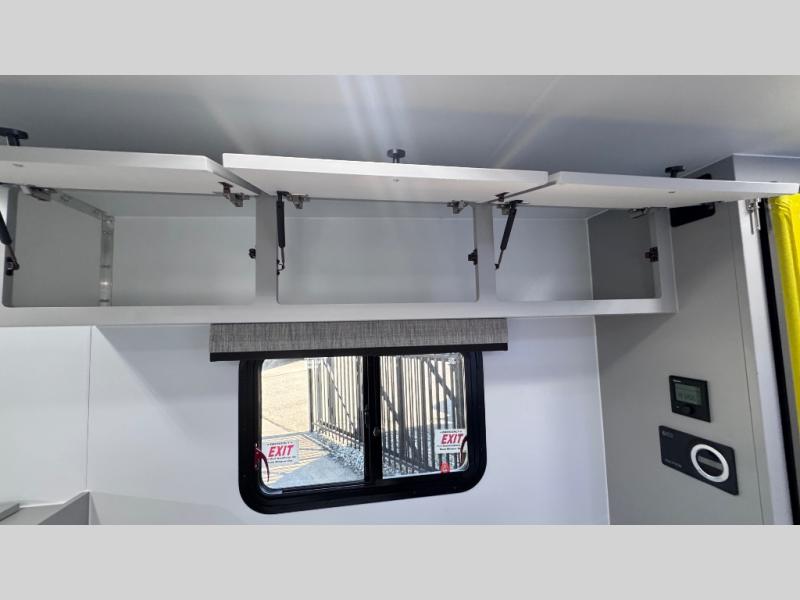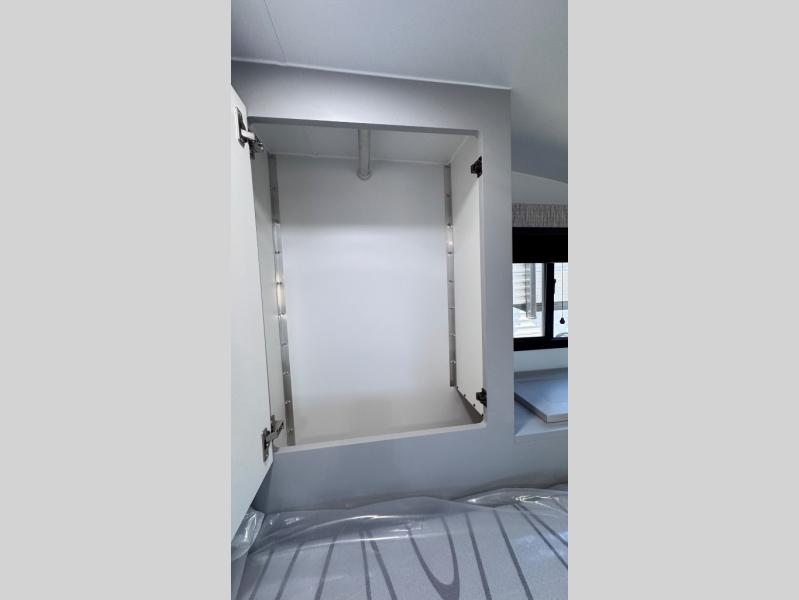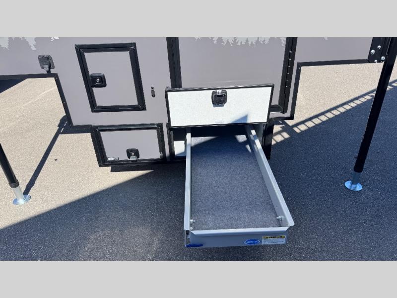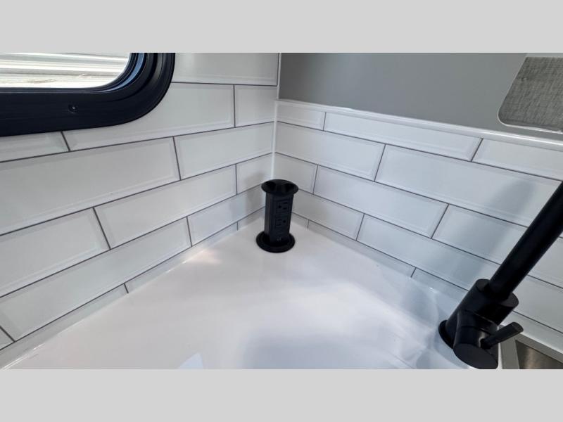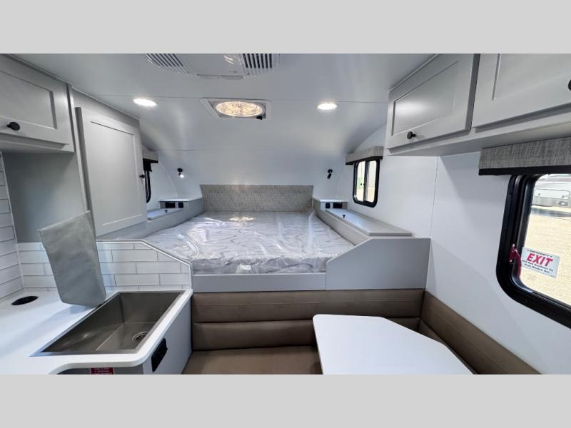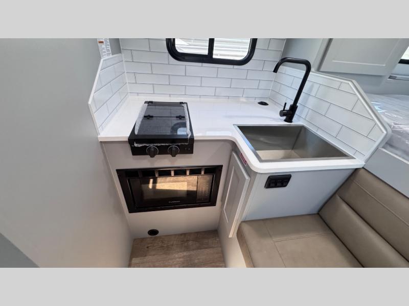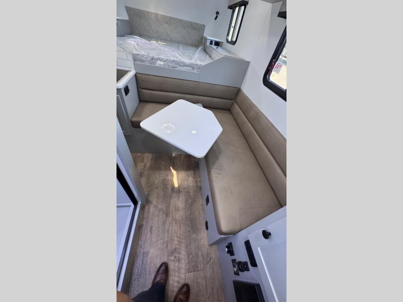 Like all Soaring Eagle Campers, the AERIE is constructed of all welded, tubular aluminum and composites, and features a fully enclosed and heated basement design; TRUMA Combi high-efficiency furnace/water heater; electric jacks, spacious bathroom/shower with plenty of room to maneuver (40”x40”); 12V refrigerator, nice size kitchen area with 2 burner cooktop range, microwave/convection/air fryer oven, and loads of storage. The open floorplan makes the AERIE feel like a much larger camper which is enhanced by automotive grade foam in the faux leather covered dinette seating and residential quality queen bed mattress with memory foam top. The permanent North/South bed has dual nightstands with built-in chargers/outlets; lots of storage space along the side of each bed, and more – ALL STANDARD in the base price tag!