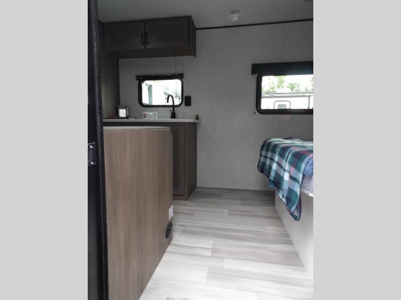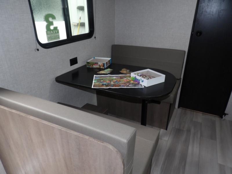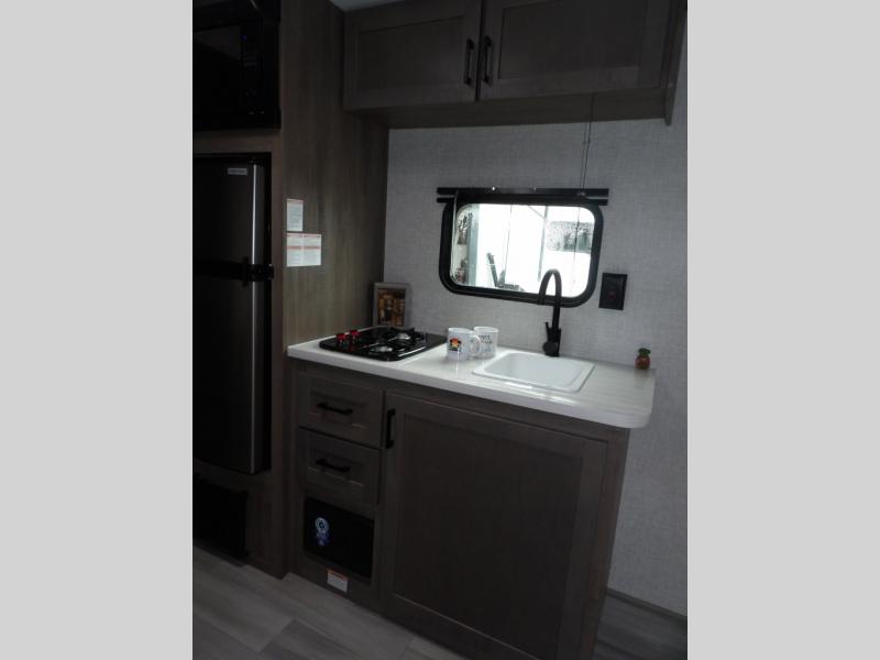 This cozy single axle travel trailer can sleep three people comfortably thanks to the front walk-around queen bed and the booth dinette. There is a full rear bath with a foot flush toilet, a powered bath vent, plus a bath wardrobe for clean towels and toiletries. The full kitchen is complete with a two burner cooktop, a microwave oven, and a refrigerator to keep your perishables fresh. Start camping today at your favorite campground!