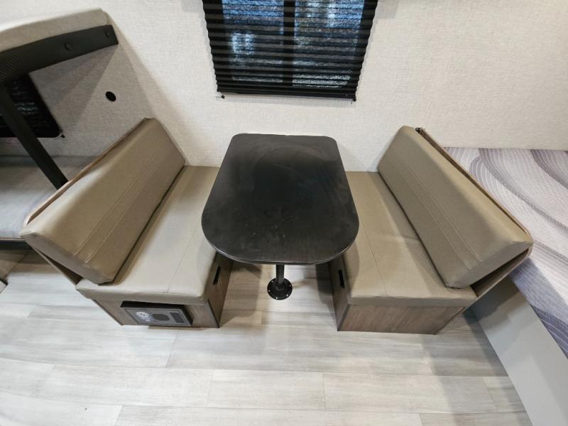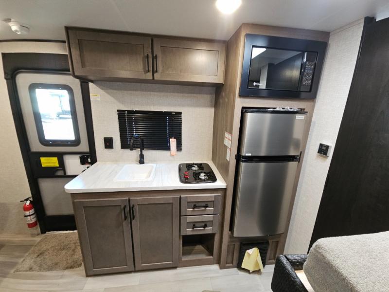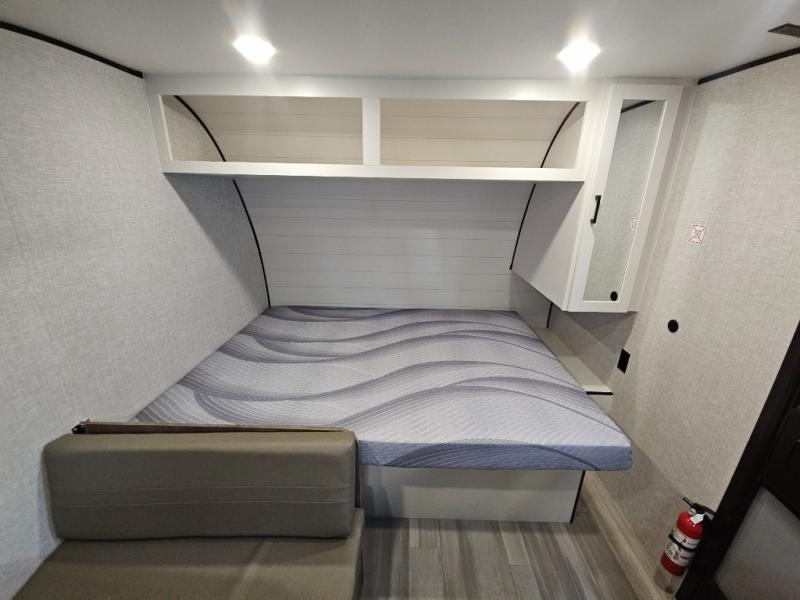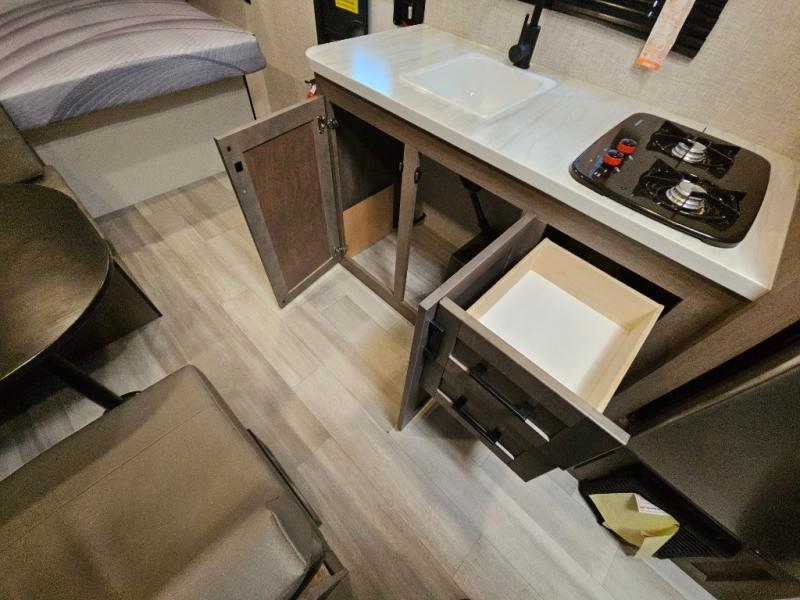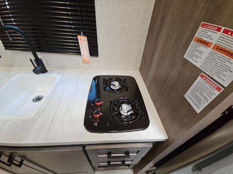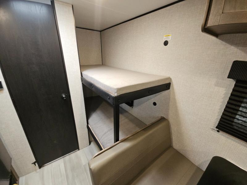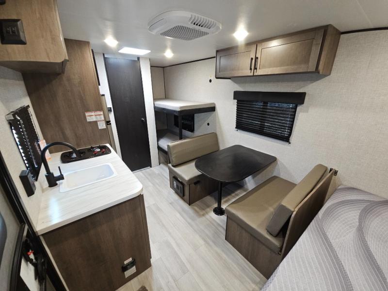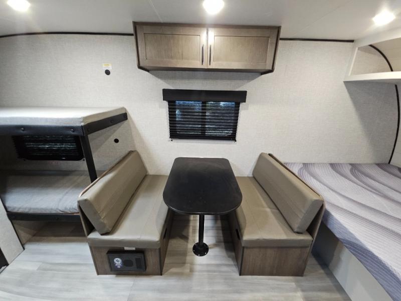 This simple, yet cozy travel trailer is perfect for all your outdoor excursions. You can unload the exterior storage when you get to camp, then head inside to make lunch on the two burner cooktop or microwave oven. A 12V refrigerator will keep your perishables fresh, and a booth dinette will provide dining space. Everyone can take turns freshening up in the private bath that includes a tub/shower and a toilet, and the little ones are sure to love the bunk beds!