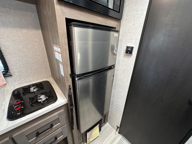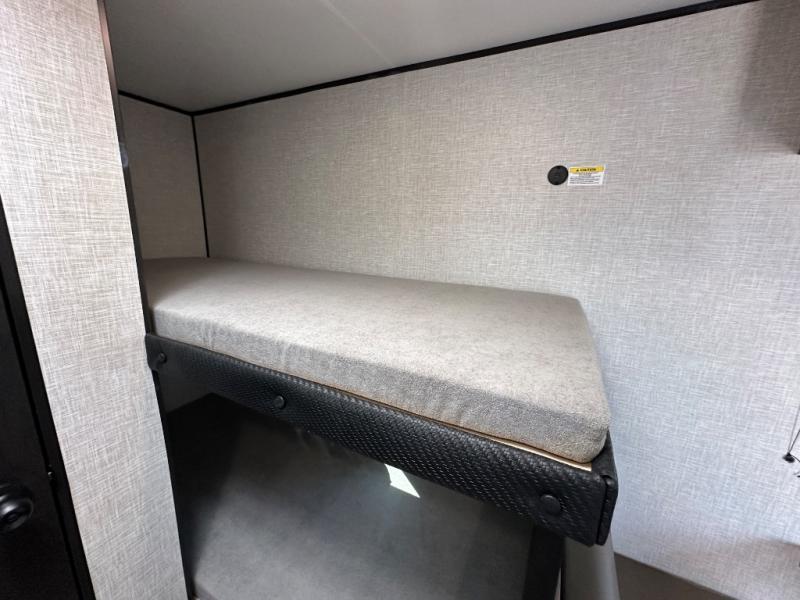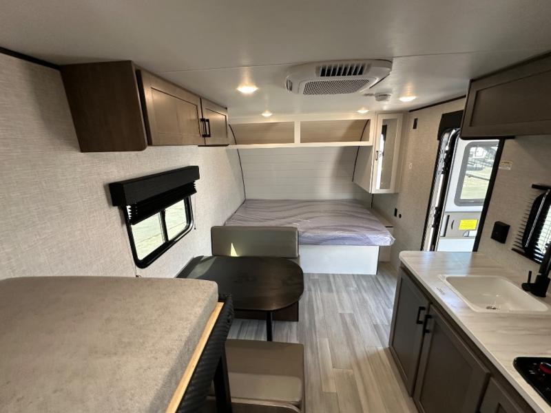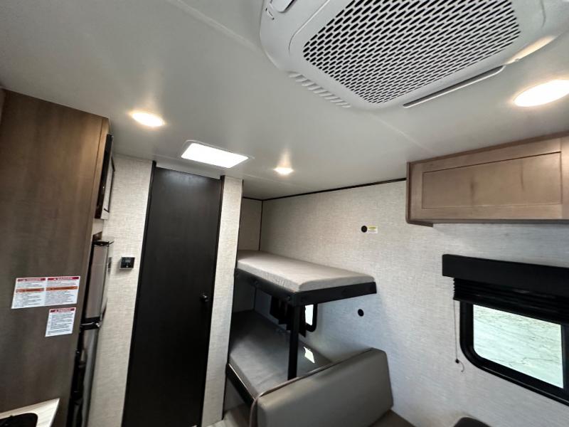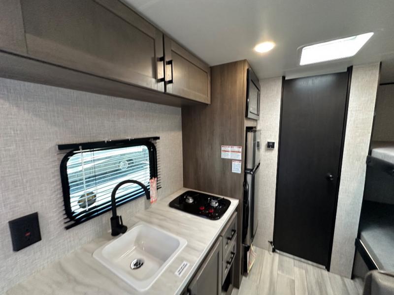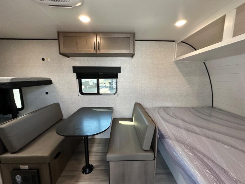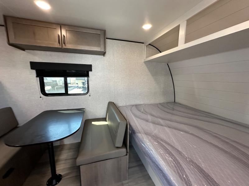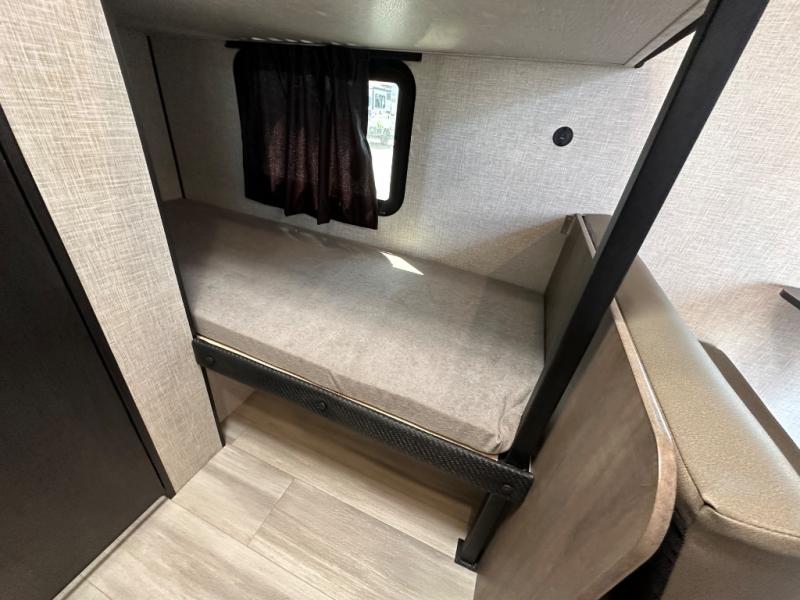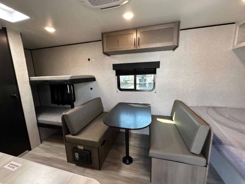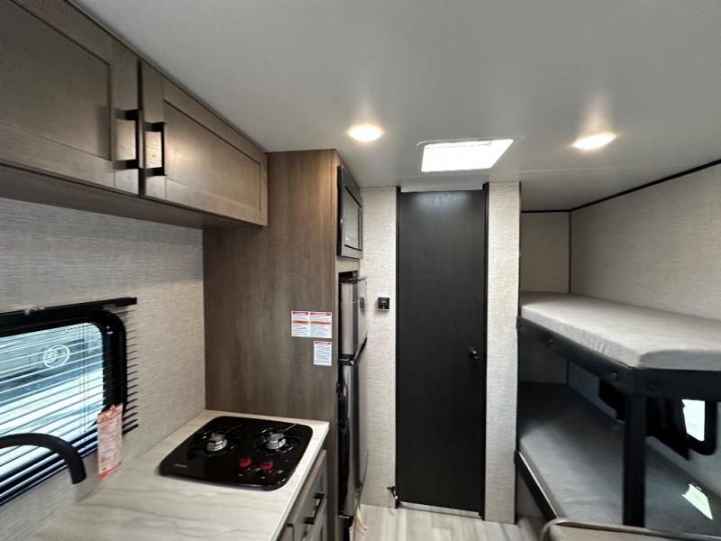 This simple, yet cozy travel trailer is perfect for all your outdoor excursions. You can unload the exterior storage when you get to camp, then head inside to make lunch on the two burner cooktop or microwave oven. A 12V refrigerator will keep your perishables fresh, and a booth dinette will provide dining space. Everyone can take turns freshening up in the private bath that includes a tub/shower and a toilet, and the little ones are sure to love the bunk beds!