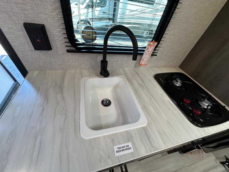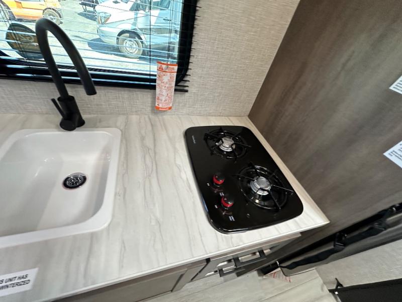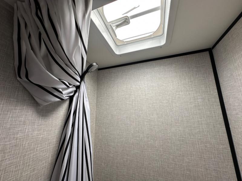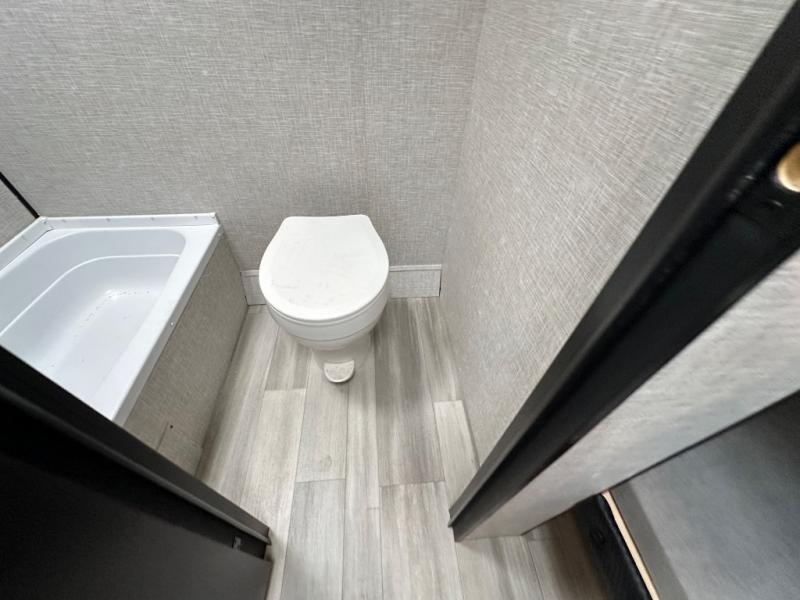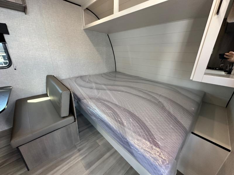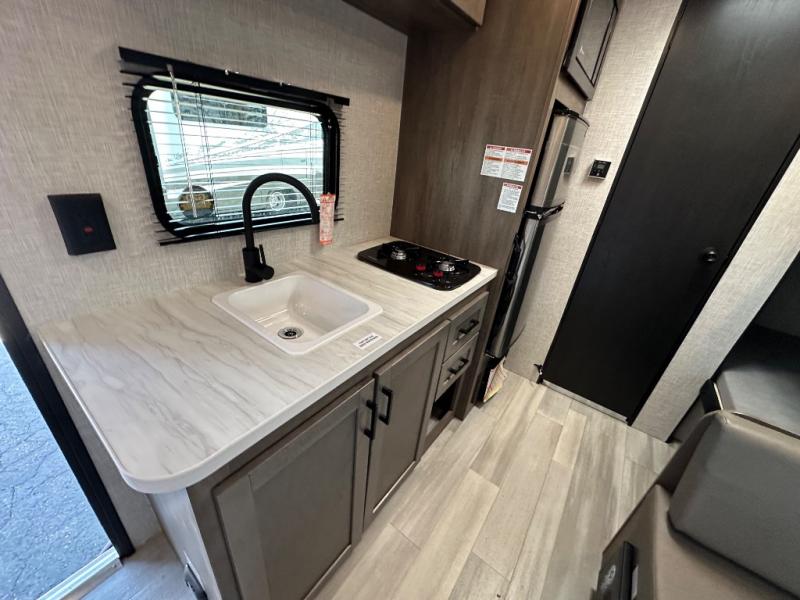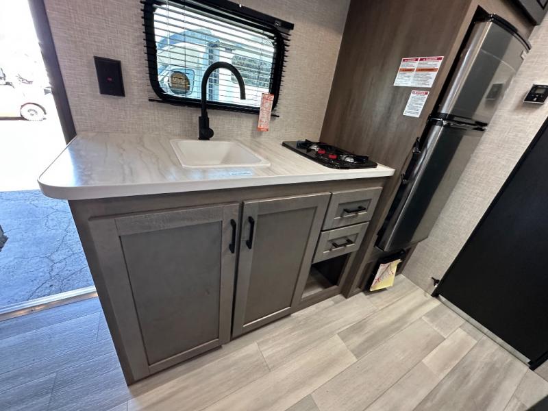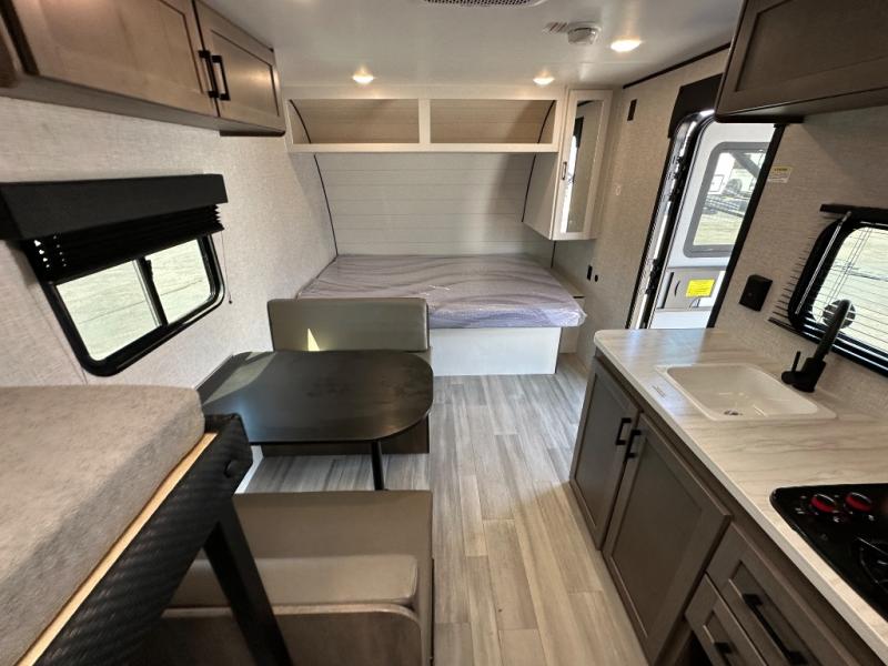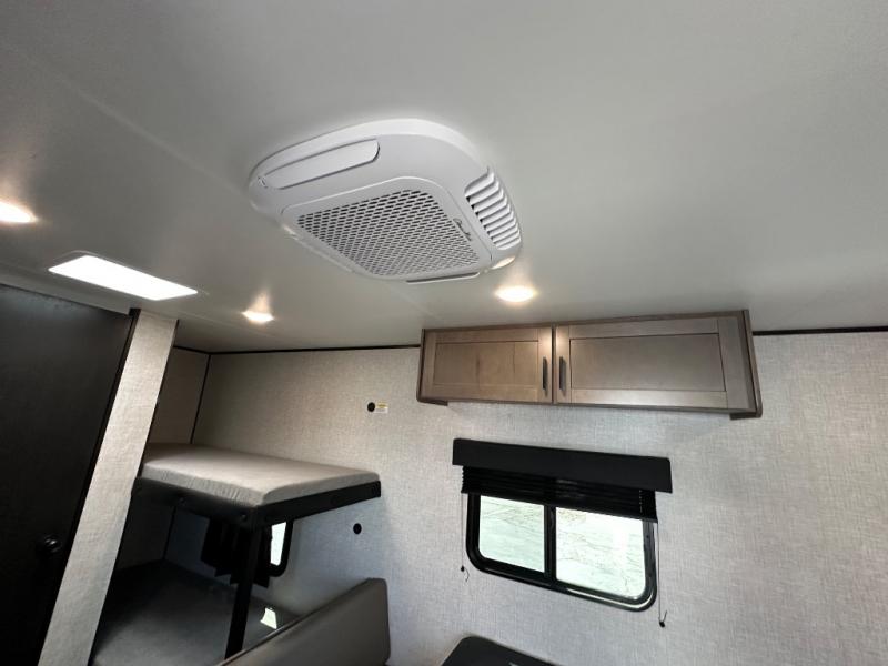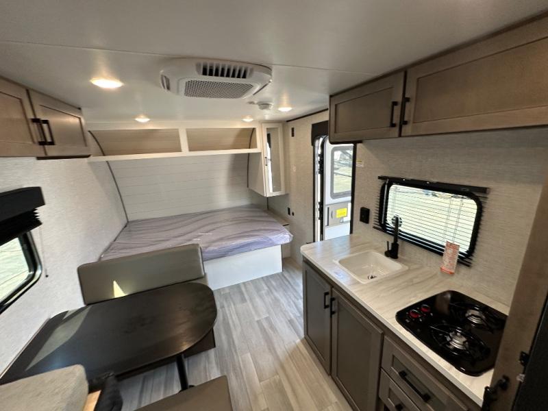 This simple, yet cozy travel trailer is perfect for all your outdoor excursions. You can unload the exterior storage when you get to camp, then head inside to make lunch on the two burner cooktop or microwave oven. A 12V refrigerator will keep your perishables fresh, and a booth dinette will provide dining space. Everyone can take turns freshening up in the private bath that includes a tub/shower and a toilet, and the little ones are sure to love the bunk beds!