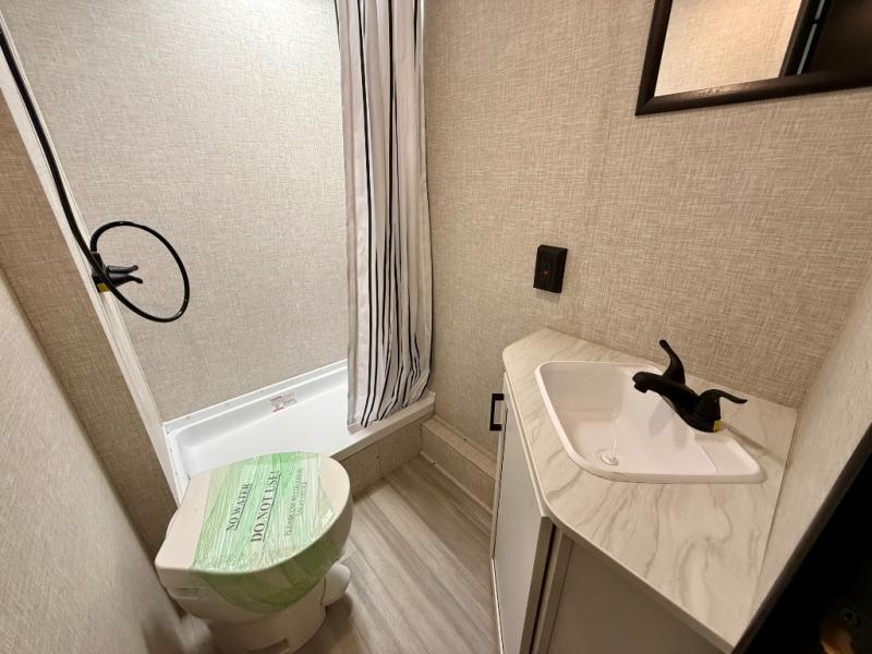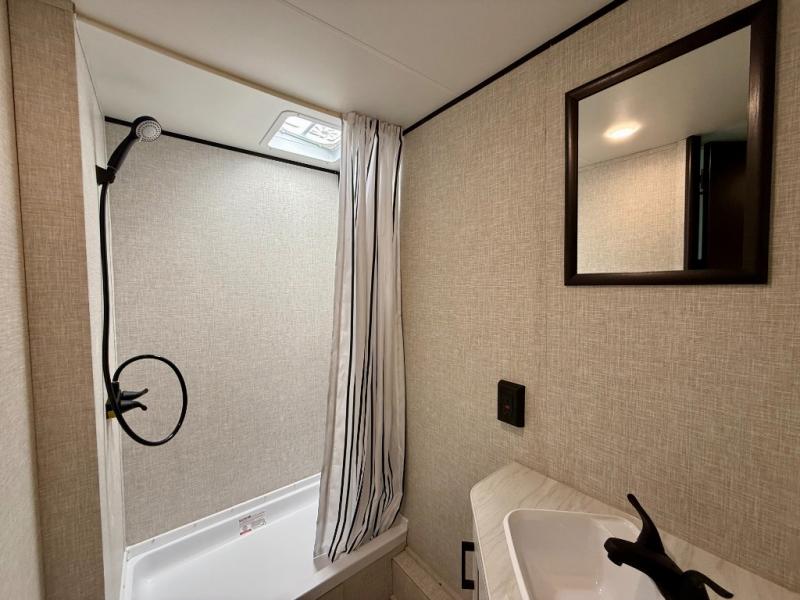 Load up the whole family and head to your favorite campground in this travel trailer! It offers versatility with the front 60" x 76" Murphy bed which transforms into a sofa for seating during the day. There is also a set of double-size bunk beds for the kids to sleep on and the U-shaped dinette can transform into an extra sleeping space when you're not using it to enjoy a meal prepared with the two burner range with a glass cover. You could even prepare your meals out in the great outdoors with the outside kitchen. Wash the sand out of your hair each night in the rear corner bathroom with the tub/shower too!