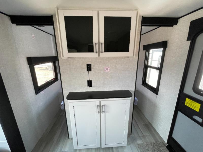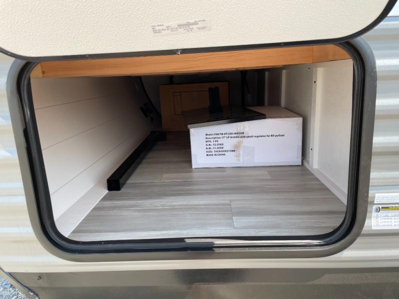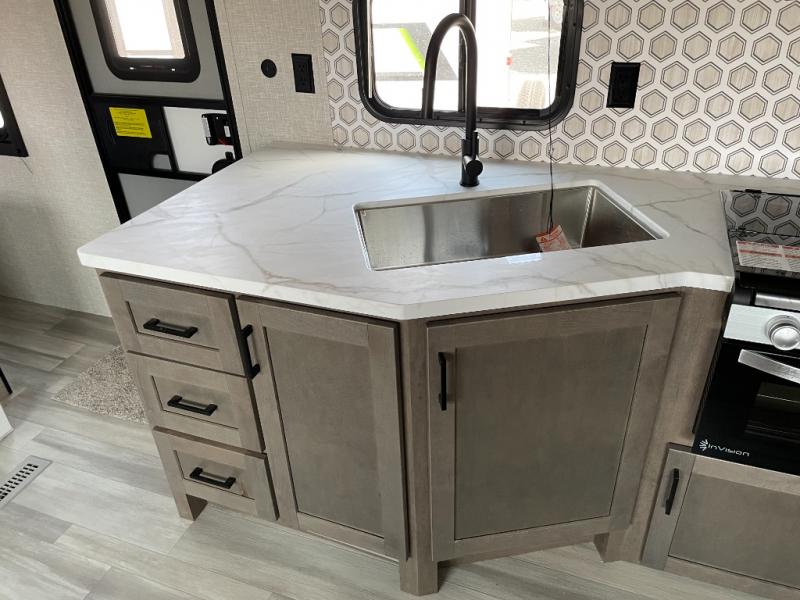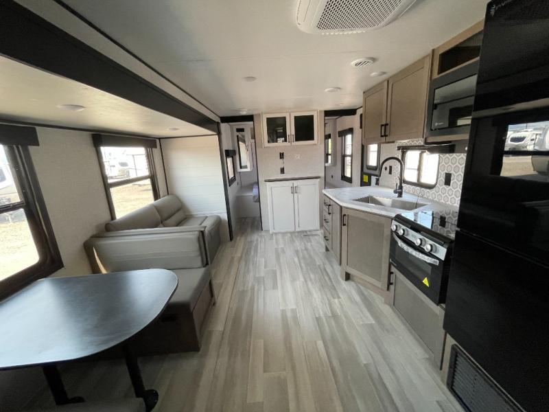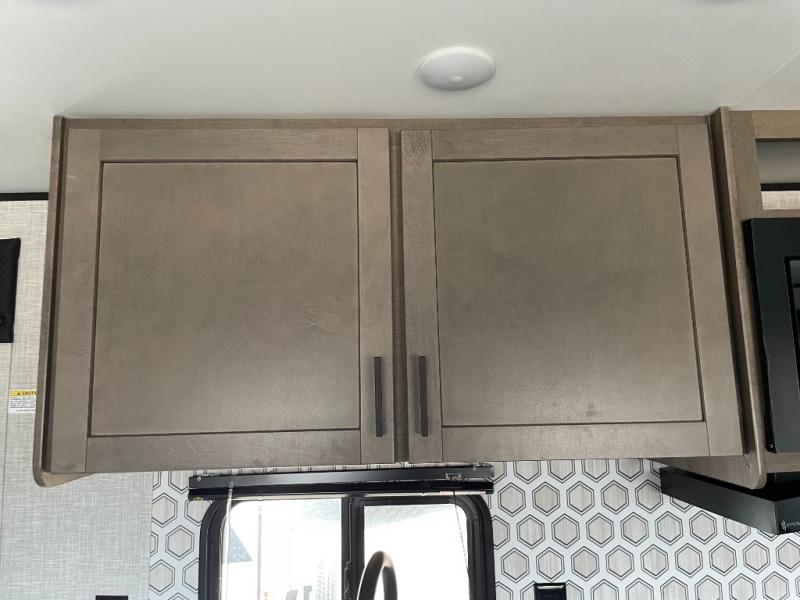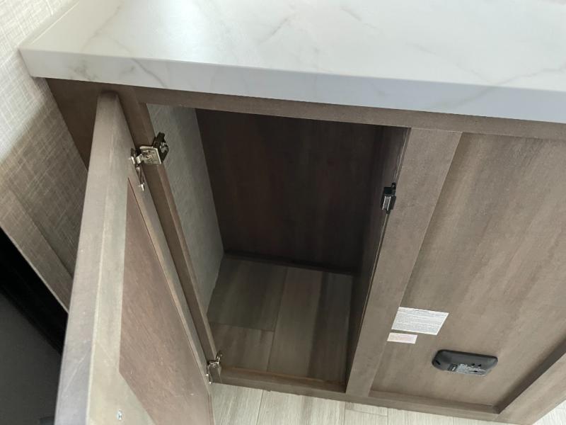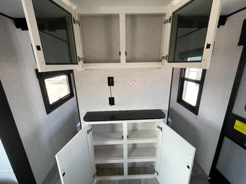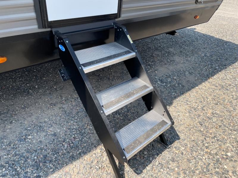 Enjoy camping at local RV spots or even national parks in this dual axle trailer that offers a large slide with a jackknife sofa and booth dinette. There is a full bathroom to get cleaned up in with extra counter space for toiletries, and the kitchen provides a three burner range with glass cover, a 17" oven and a pantry to hold all the goodies. You can enter the front bedroom from each side of the entertainment center giving you your own side, and there are dual wardrobes plus a shelf overhead. And don't forget about the 16' power awning with LED lighting, the exterior storage for your outdoor gear and the outside kitchen including an outdoor griddle and a refrigerator. You might even like to add a few options, take a look at the list!