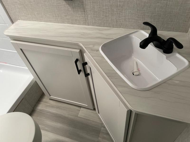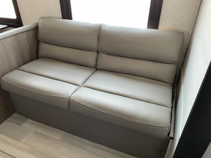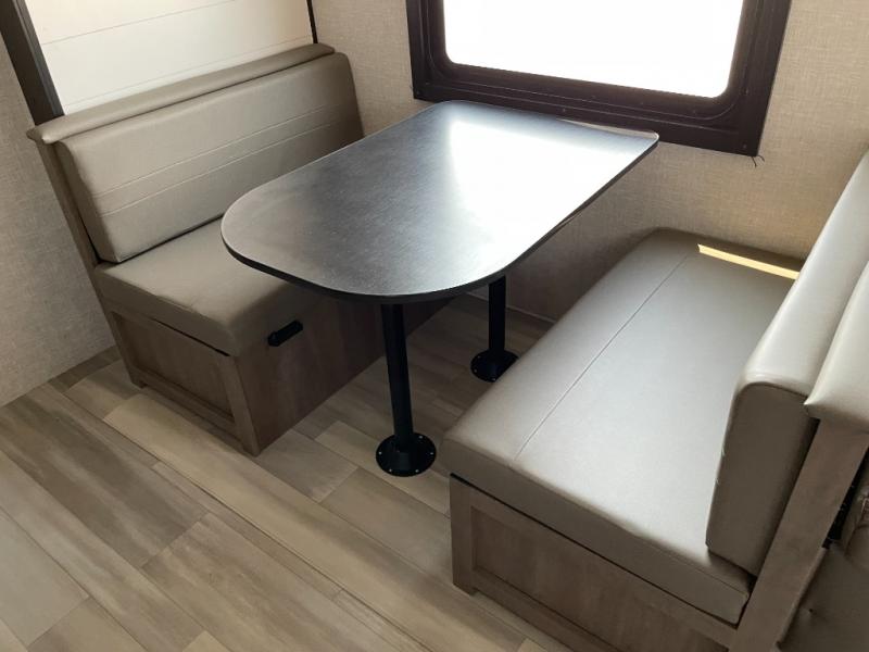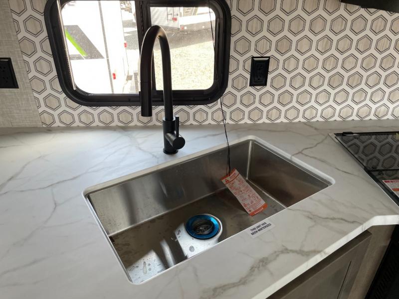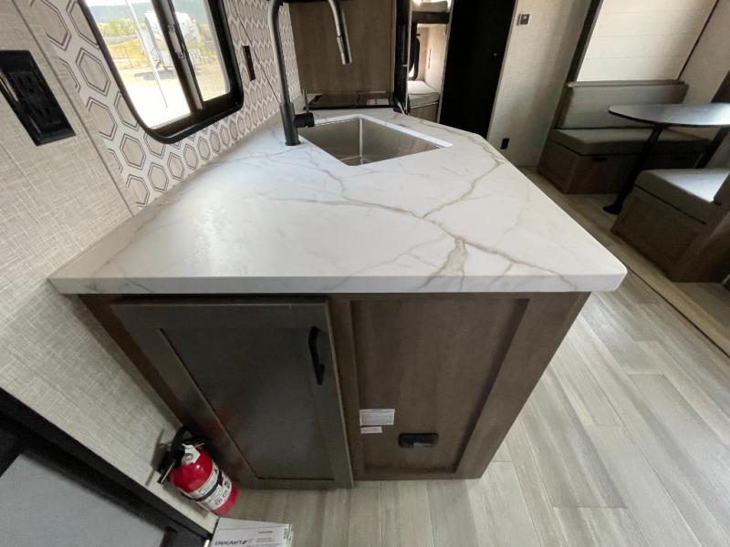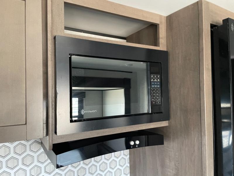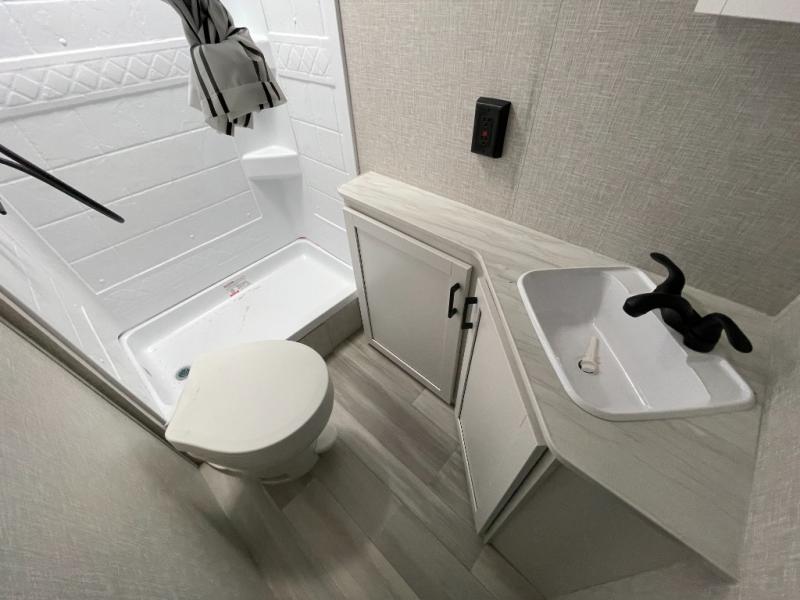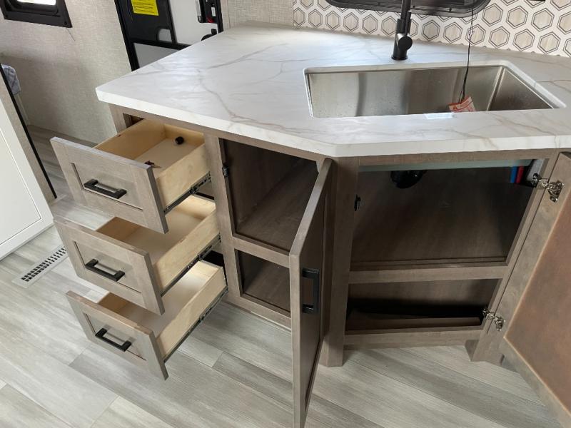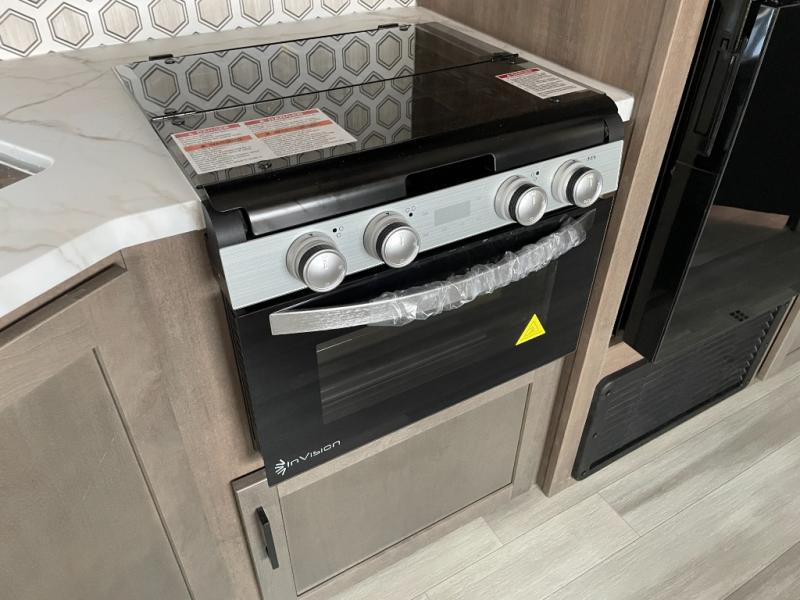 Enjoy camping at local RV spots or even national parks in this dual axle trailer that offers a large slide with a jackknife sofa and booth dinette. There is a full bathroom to get cleaned up in with extra counter space for toiletries, and the kitchen provides a three burner range with glass cover, a 17" oven and a pantry to hold all the goodies. You can enter the front bedroom from each side of the entertainment center giving you your own side, and there are dual wardrobes plus a shelf overhead. And don't forget about the 16' power awning with LED lighting, the exterior storage for your outdoor gear and the outside kitchen including an outdoor griddle and a refrigerator. You might even like to add a few options, take a look at the list!