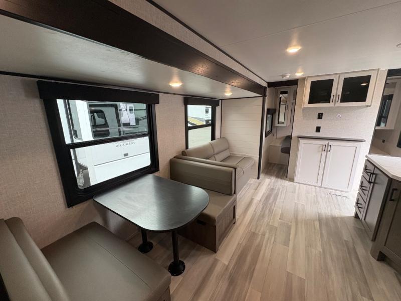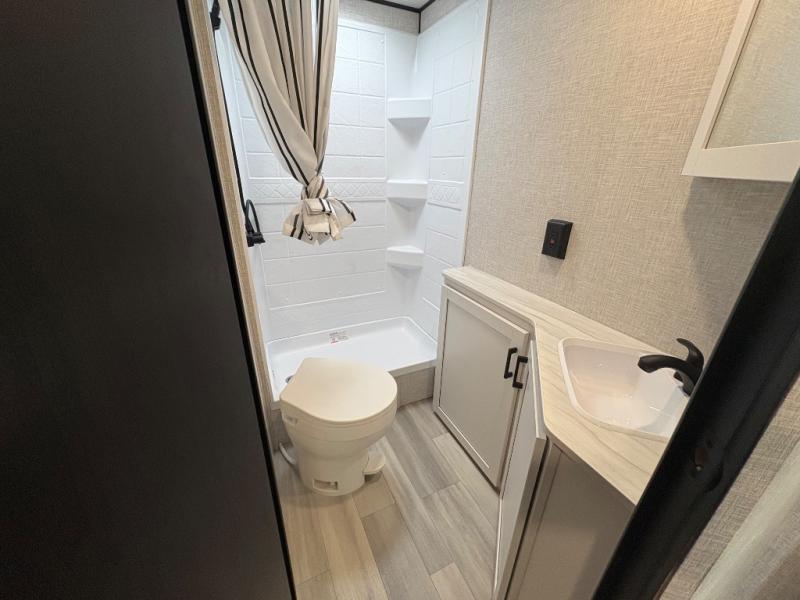 Enjoy camping at local RV spots or even national parks in this dual axle trailer that offers a large slide with a jackknife sofa and booth dinette. There is a full bathroom to get cleaned up in with extra counter space for toiletries, and the kitchen provides a three burner range with glass cover, a 17" oven and a pantry to hold all the goodies. You can enter the front bedroom from each side of the entertainment center giving you your own side, and there are dual wardrobes plus a shelf overhead. And don't forget about the 16' power awning with LED lighting, the exterior storage for your outdoor gear and the outside kitchen including an outdoor griddle and a refrigerator. You might even like to add a few options, take a look at the list!