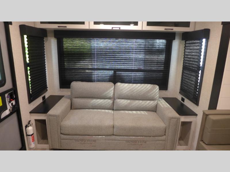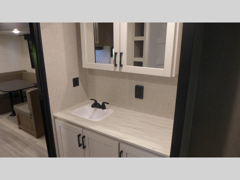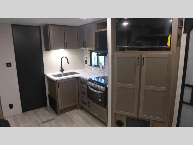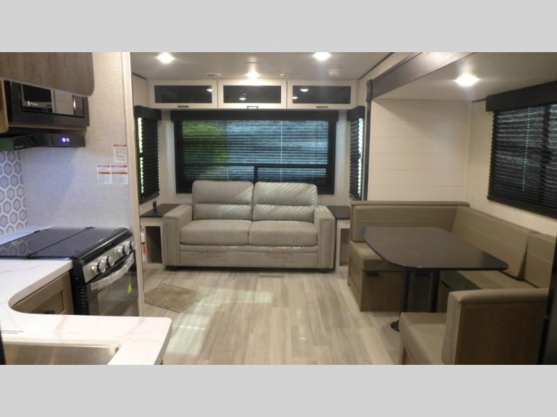 Easily hitch up this dual axle trailer and head out to the campgrounds to enjoy a long weekend or week-long vacation with your favorite person! You might even like to invite a few friends to stay the night on the furniture that doubles as extra sleeping space. The single slide offers more interior floor space to move from the main entry to the walk-through bathroom which offers extra counter space for toiletries, and linen storage for your towels and such. The front bedroom provides a walk-around bed, windows, dual wardrobes and the second entry into the trailer. The cook will love the L-shaped kitchen area, the 17" oven and the three burner range with glass cover. And the exterior offers a 19' power awning to relax under when outside.