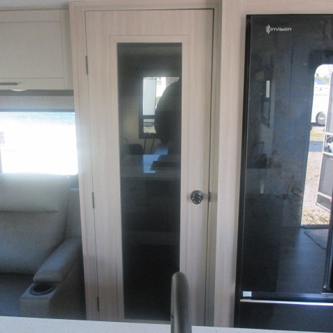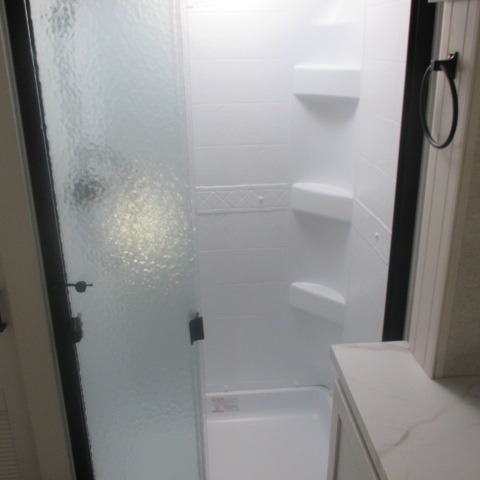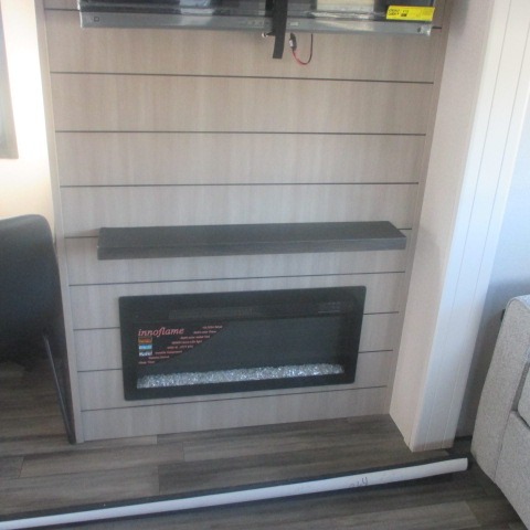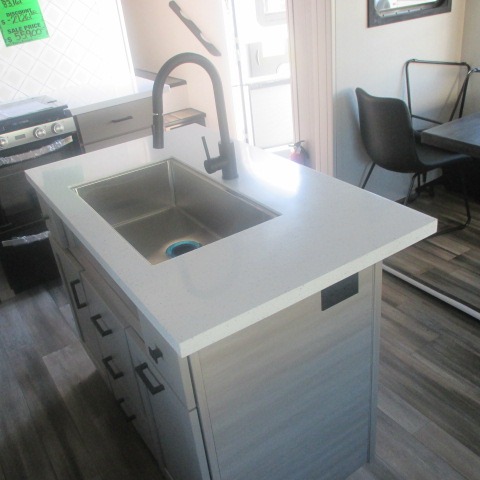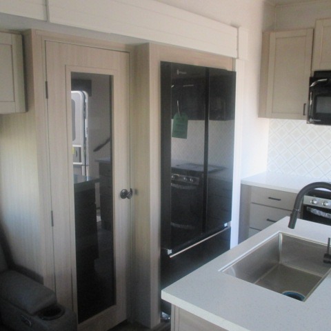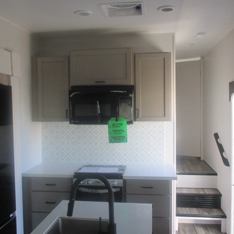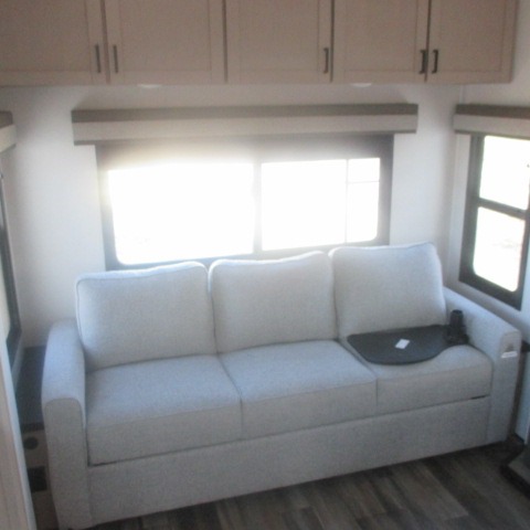 You'll have lots of fun in this fifth wheel! Enjoy the most comfortable living room with a tri-fold sofa, theater seats, and an entertainment center with fireplace. A center kitchen island allows an easy flow between the rooms, while the dining table and chairs provide additional seating. A 17-cu. ft. refrigerator has plenty of room for all your food, and there's a large pantry as well. The full bath includes a shower and has dual entry doors so you can access it from the hall or the bedroom. A spacious wardrobe also includes washer and dryer prep if you choose to add these appliances. Outside you'll find an outside kitchen with a sink, refrigerator, and a griddle, plus there's a quick connect LP hookup to add a grill easily.