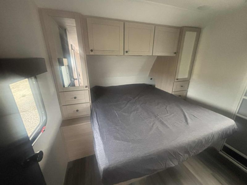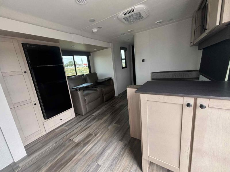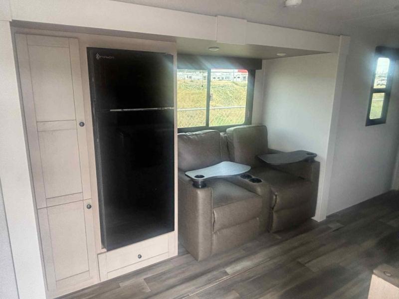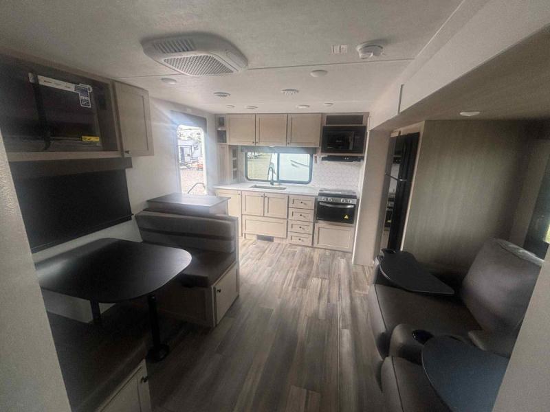 It is easy to enter and exit this travel trailer with the dual entry doors! One of the entrances leads directly into the front private bedroom which has a queen bed with wardrobes on either side, and the other entrance leads into the rear kitchen where you can prepare your best home cooked meals. Enjoy your meals at the booth dinette then play a card game or relax on the tri-fold sofa. Rinse the sand out of your hair with the shower in the full bathroom and keep your towel close by with the linen closet. Enjoy your beautiful scenery rain or shine as you relax in a chair underneath the 21' power awning!
