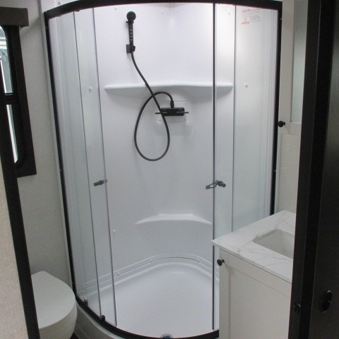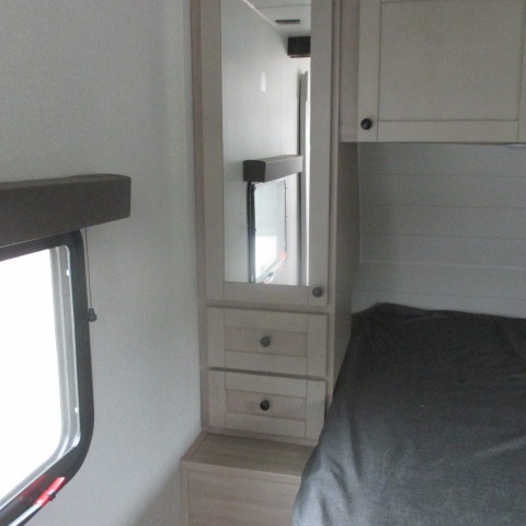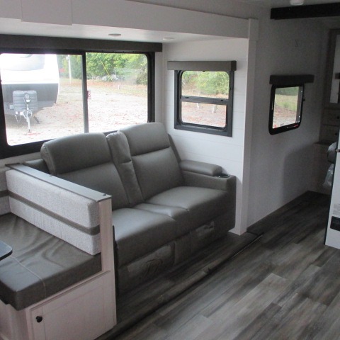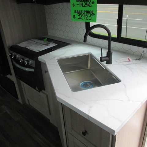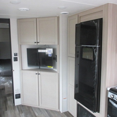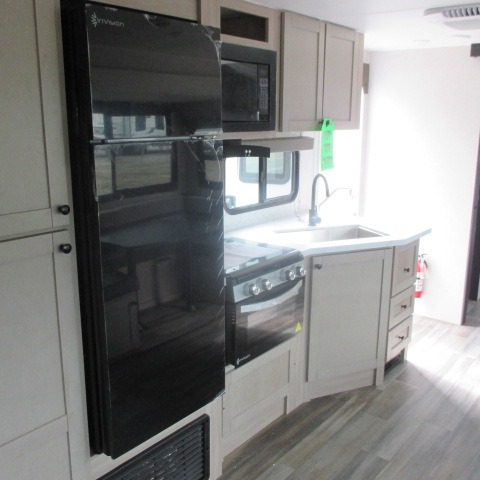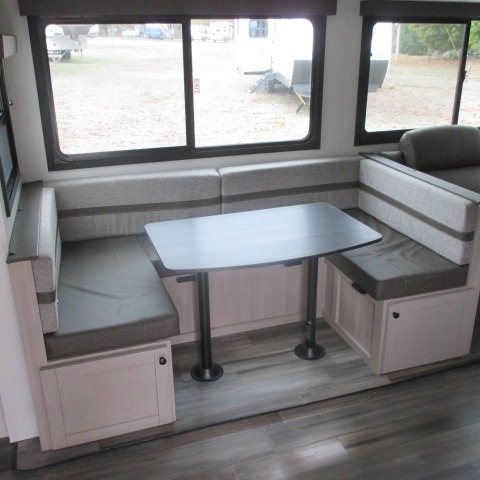 Convenience, space, and lots of camping amenities are wrapped up in this Super Lite so you can enjoy outdoor activities and inside comfort each day you are camping! There is a spacious rear bathroom that includes a walk-in closet, dual entry doors for a smooth flow of traffic in and out especially when your friends joined you, and a large slide with furniture giving you more interior floor space. The cook will have full amenities to feed everyone including a 10 cu. ft. 12V refrigerator to store the cold items, a single basin stainless steel under-mount kitchen sink, and everyone can play games at the U-shaped dinette or outside under the 20' power awning. And at night, you will have a queen bed with storage under the bed as well as beside wardrobes, USB ports and electrical outlets to keep everything charged, and a second entry into the trailer.