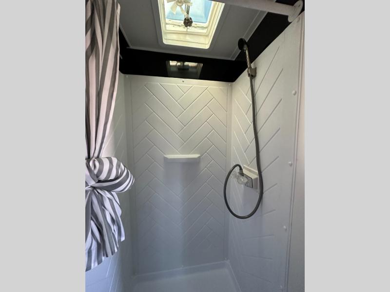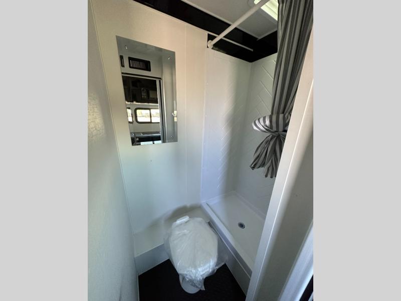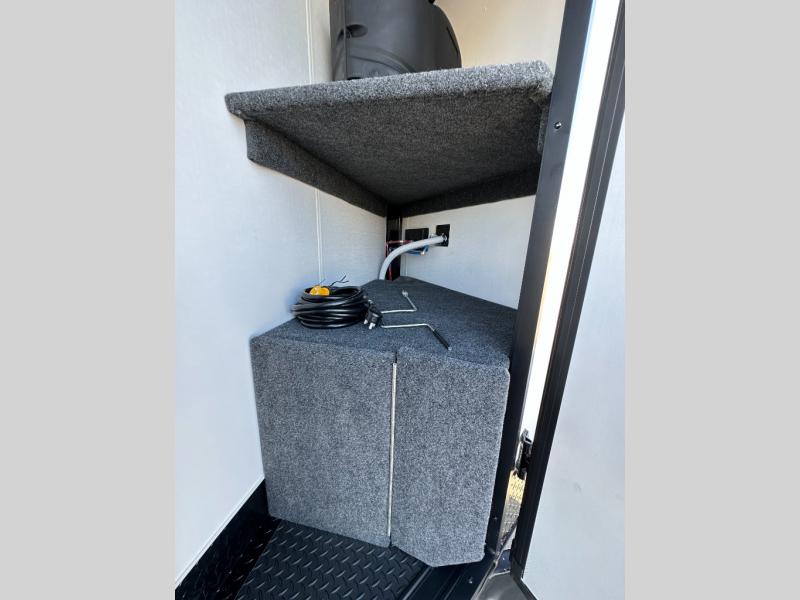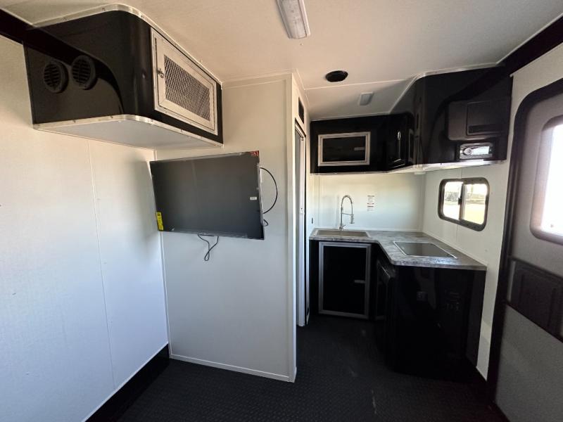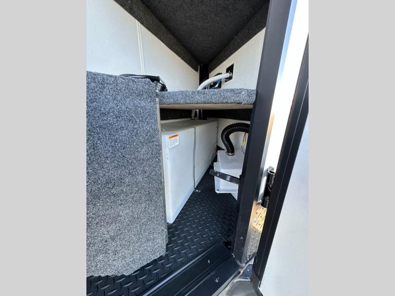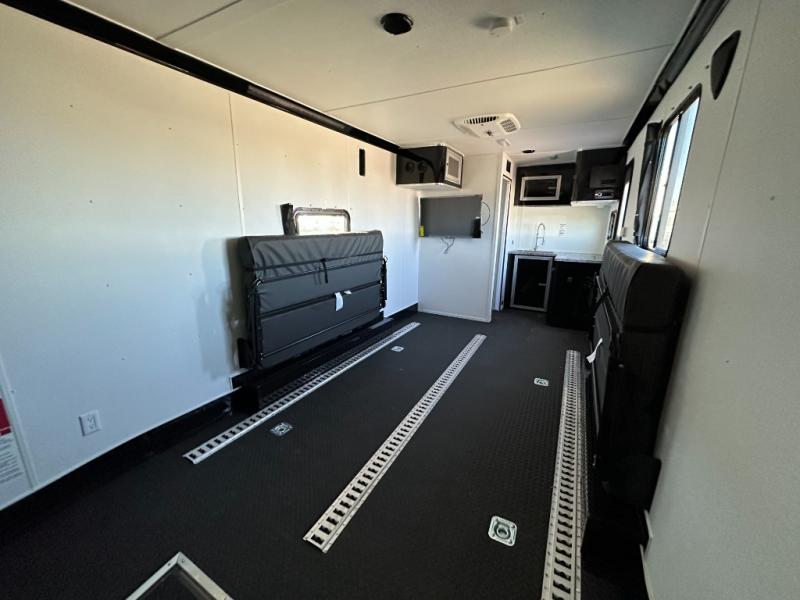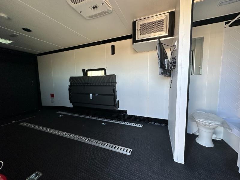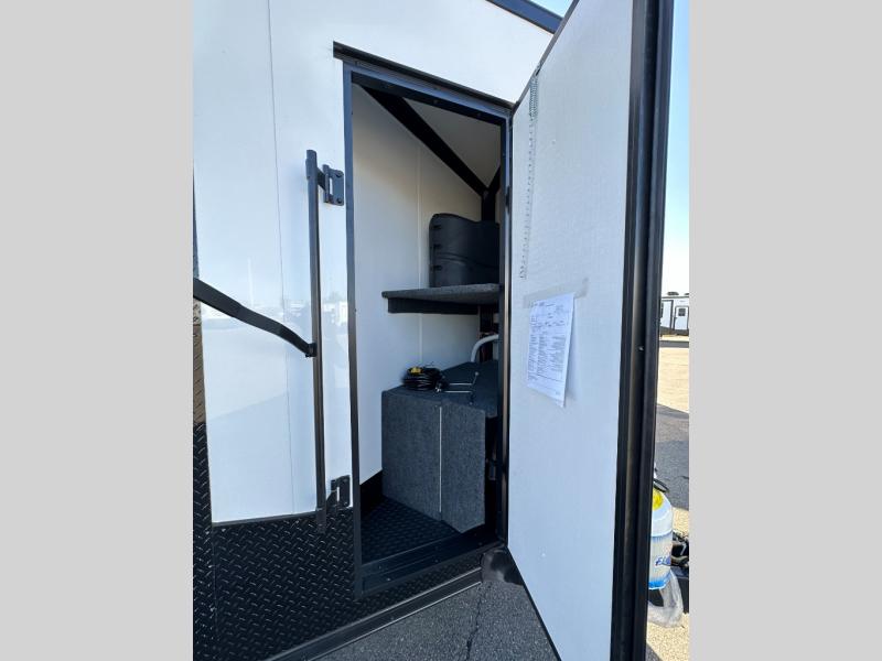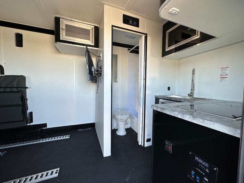 You are going to love taking this Nomad toy hauler out to the campsite! The front kitchen will remain out of the way of the rest of the trailer so that you can use the drop-in cooktop, large single-bowl sink, refrigerator, and microwave to create some delicious meals, and there is also a full bathroom with robe hooks and a medicine cabinet right next to the kitchen so that you can have your own amenities for your morning and evening routine. This trailer also has a front exterior storage location with a 24" x 72" door with bar lock, and this storage compartment spans the width of the trailer so that you can bring along some extra gear.
