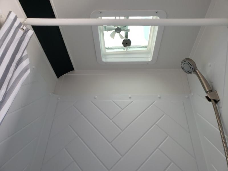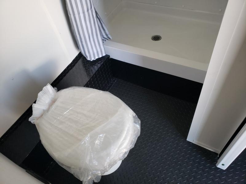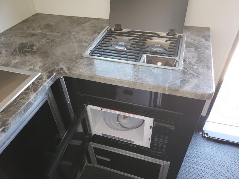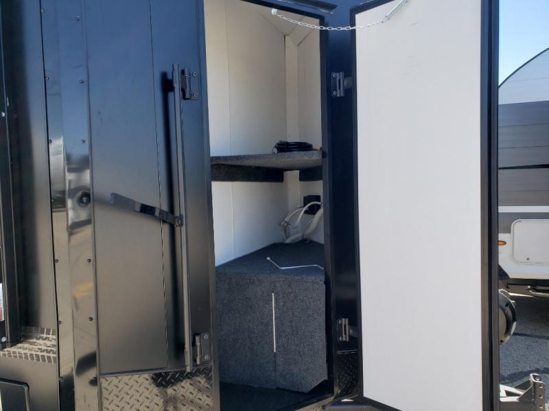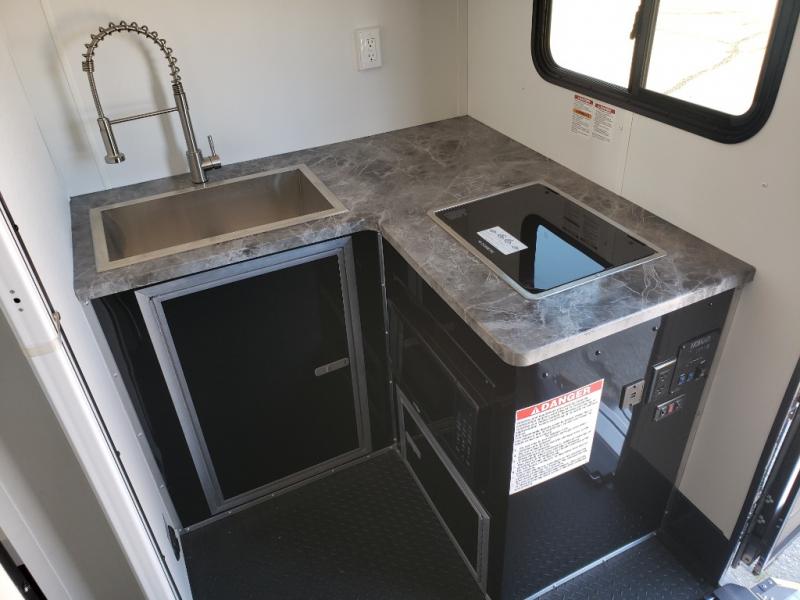 You are going to love taking this Nomad toy hauler out to the campsite! The front kitchen will remain out of the way of the rest of the trailer so that you can use the drop-in cooktop, large single-bowl sink, refrigerator, and microwave to create some delicious meals, and there is also a full bathroom with robe hooks and a medicine cabinet right next to the kitchen so that you can have your own amenities for your morning and evening routine. This trailer also has a front exterior storage location with a 24" x 72" door with bar lock, and this storage compartment spans the width of the trailer so that you can bring along some extra gear.