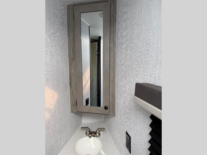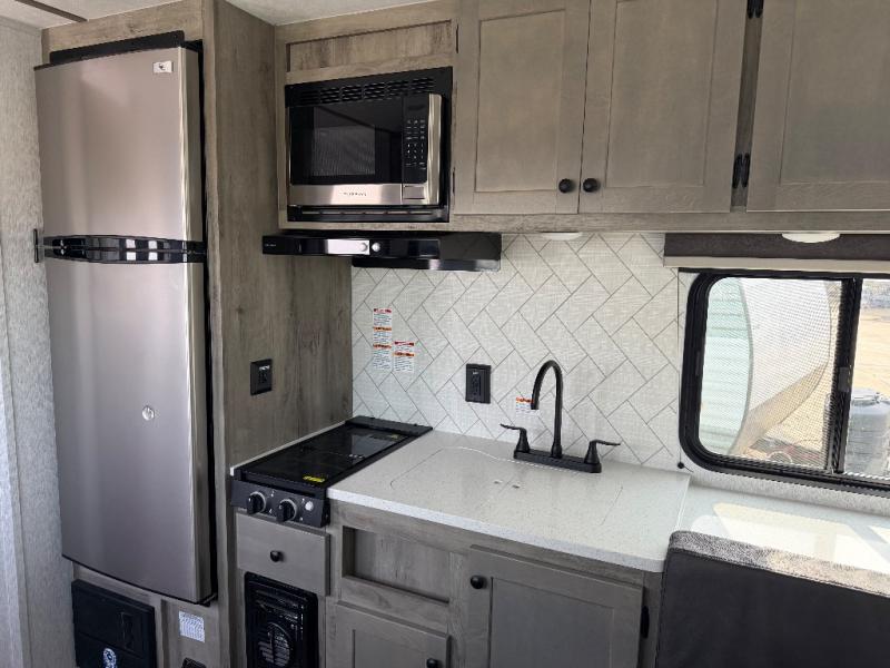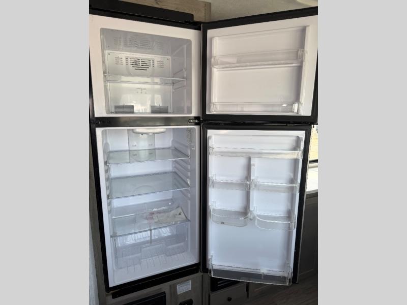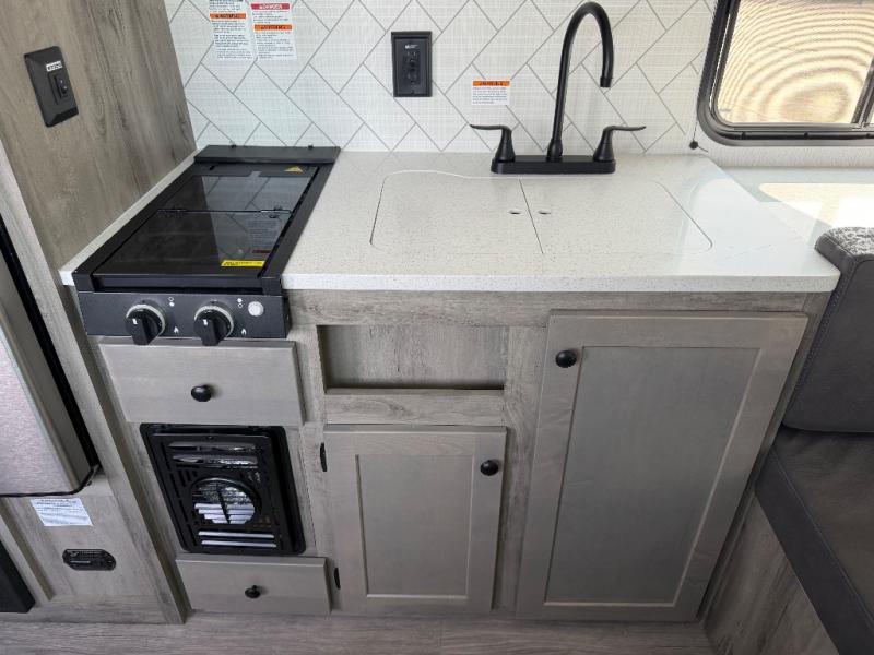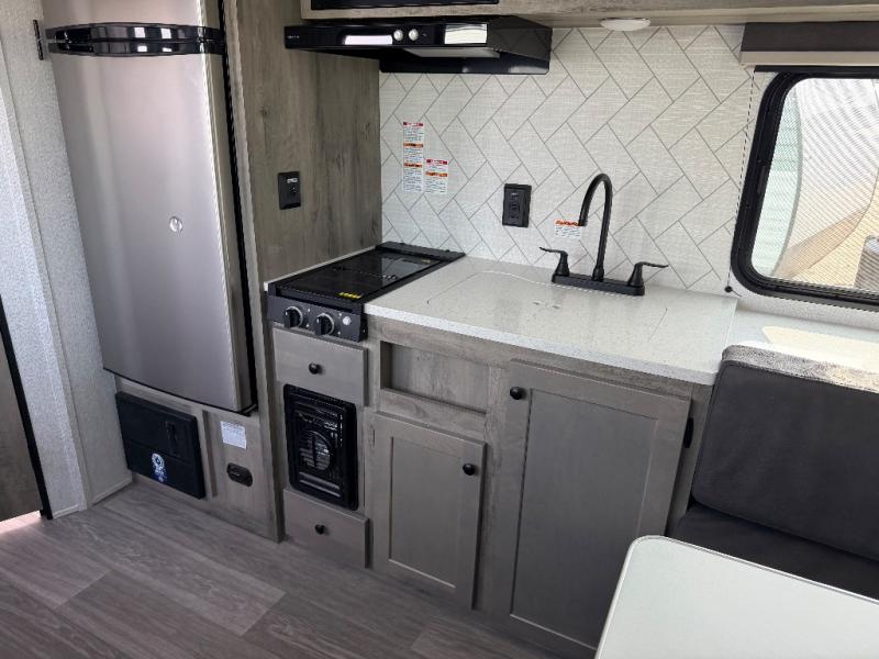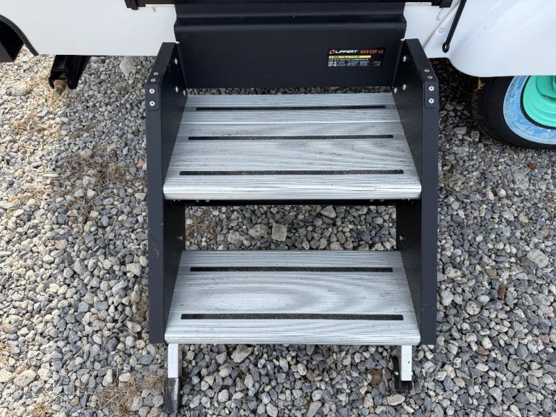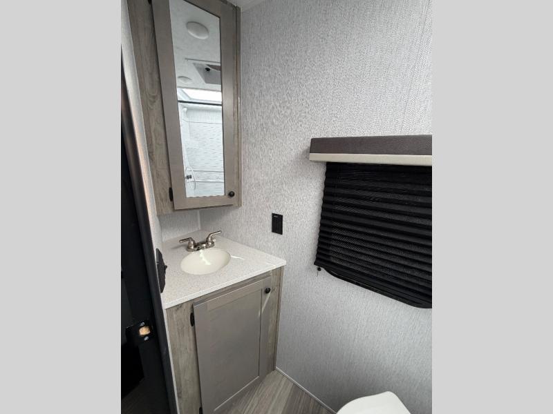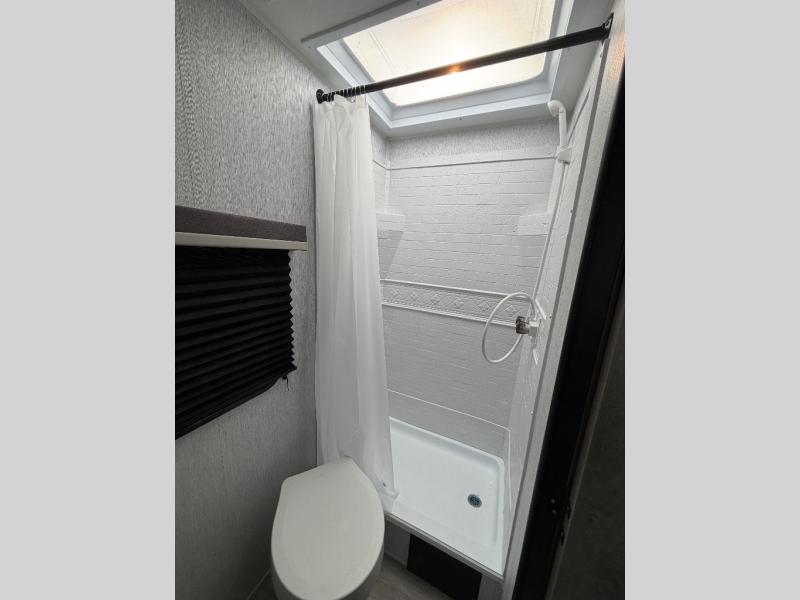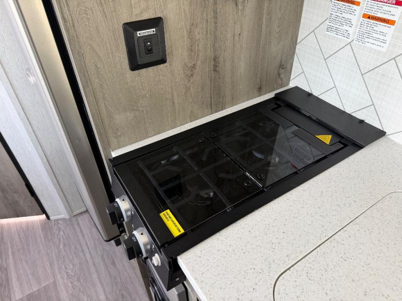 Step inside and discover a well-designed space that maximizes comfort and functionality in every corner. At the rear, you'll find a full bathroom, complete with a sink and overhead cabinet plus a 24" x 36" shower, allowing you to freshen up without relying on campground facilities. Moving to the center, the entertainment center provides a great spot to unwind, while the kitchen across the way is equipped with a 10.7 cu. ft. refrigerator, a two-burner cooktop, and ample overhead storage for your cooking essentials. Toward the front, a 41" dinette offers the perfect place to dine, relax, or plan your next adventure. Just across from it, fold-up steps lead to a cozy 48" x 74" bed, giving you a comfortable retreat to rest and recharge after a day of exploring.
