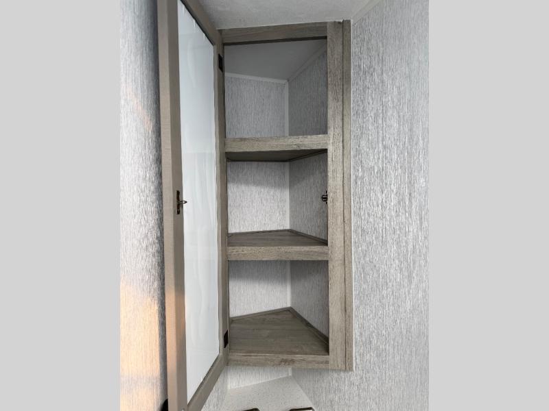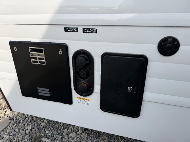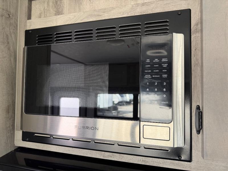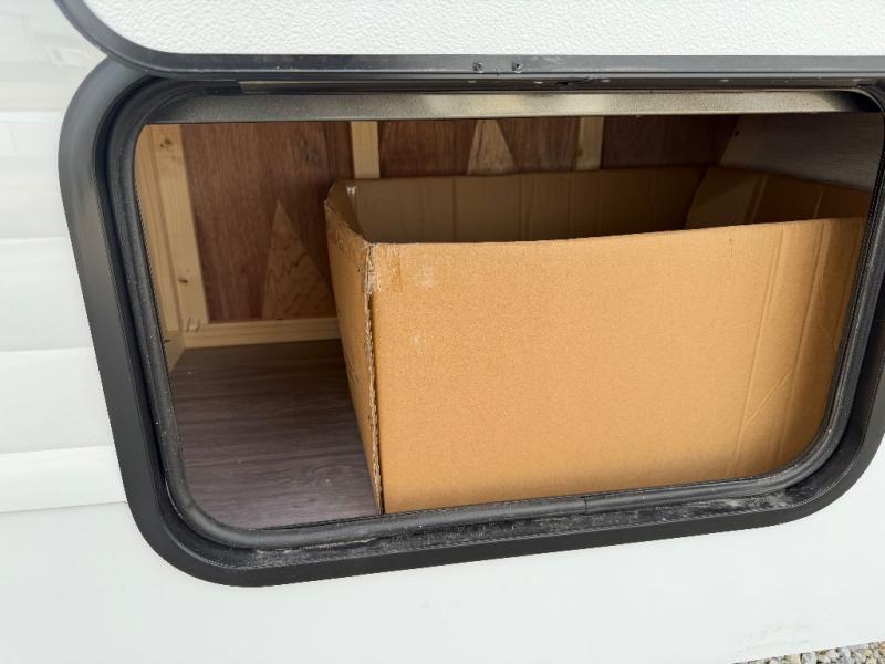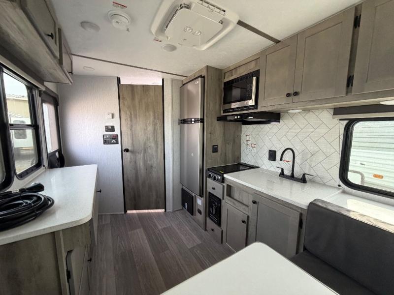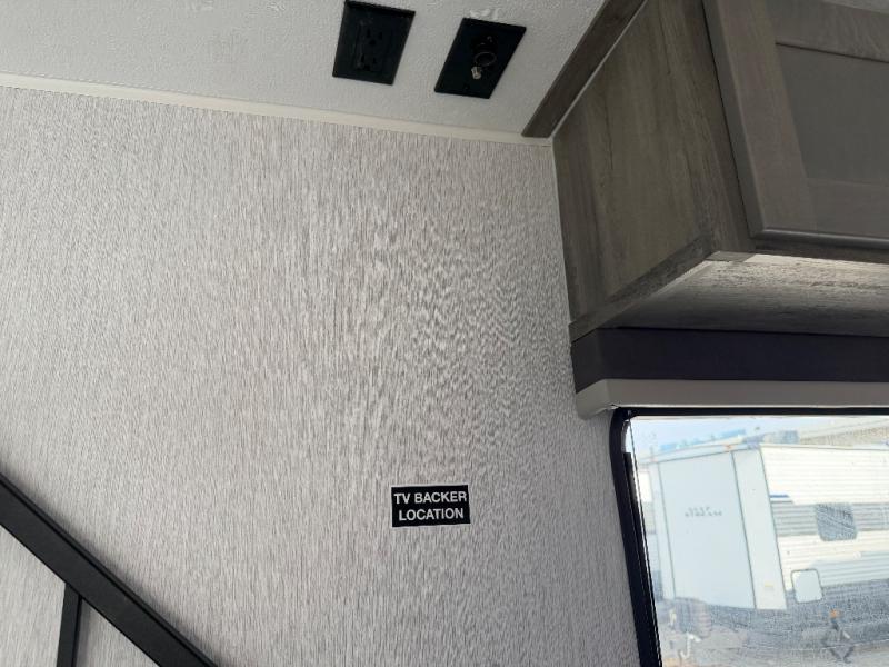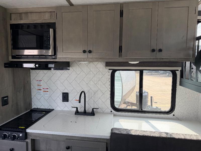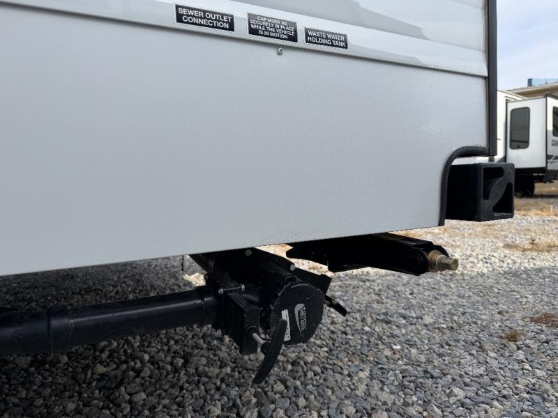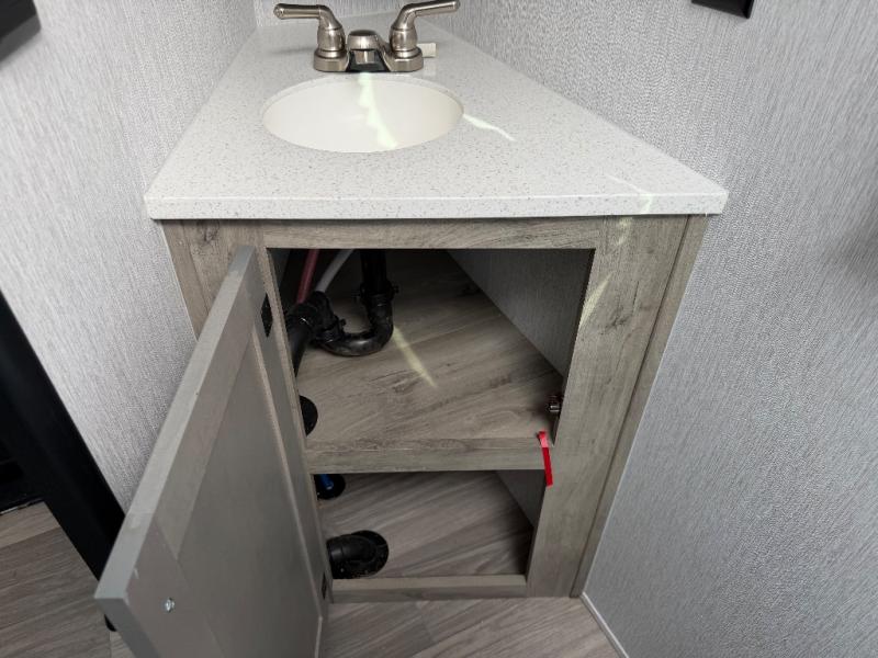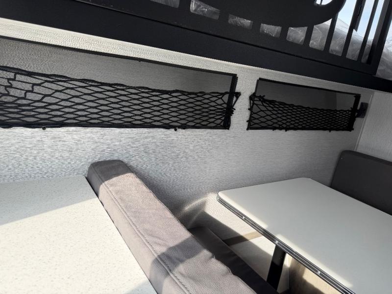 Step inside and discover a well-designed space that maximizes comfort and functionality in every corner. At the rear, you'll find a full bathroom, complete with a sink and overhead cabinet plus a 24" x 36" shower, allowing you to freshen up without relying on campground facilities. Moving to the center, the entertainment center provides a great spot to unwind, while the kitchen across the way is equipped with a 10.7 cu. ft. refrigerator, a two-burner cooktop, and ample overhead storage for your cooking essentials. Toward the front, a 41" dinette offers the perfect place to dine, relax, or plan your next adventure. Just across from it, fold-up steps lead to a cozy 48" x 74" bed, giving you a comfortable retreat to rest and recharge after a day of exploring.