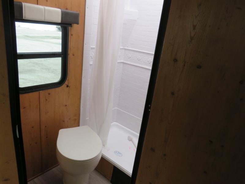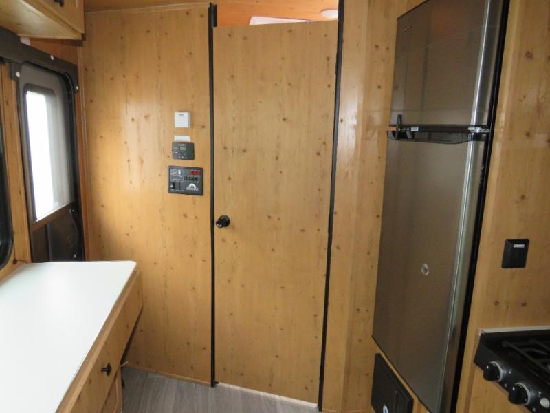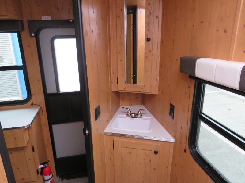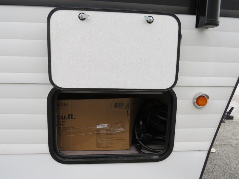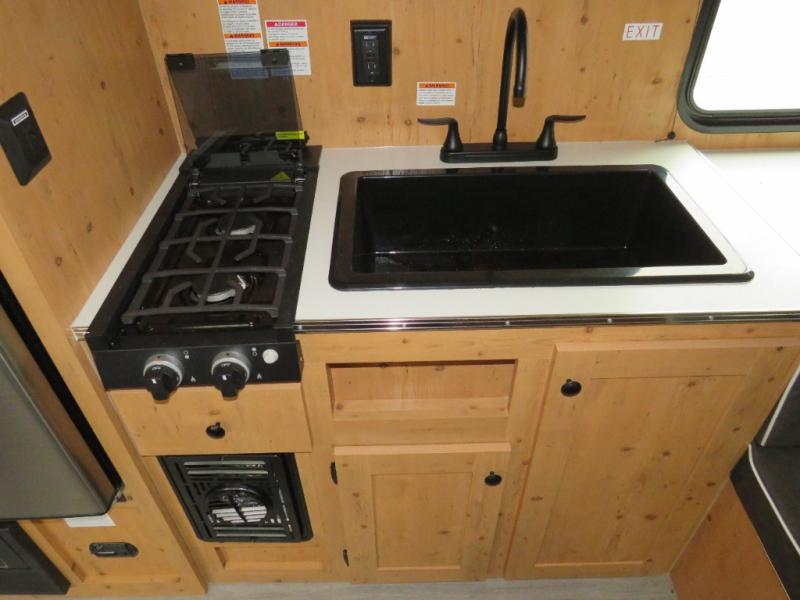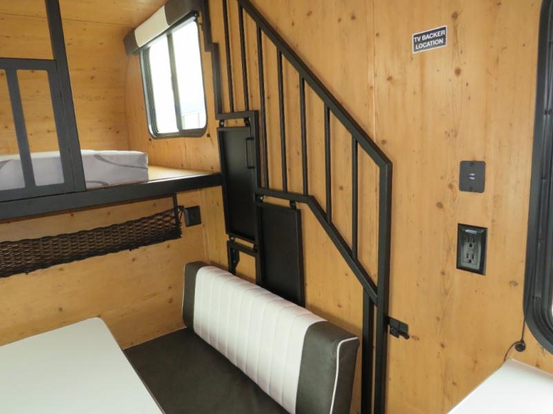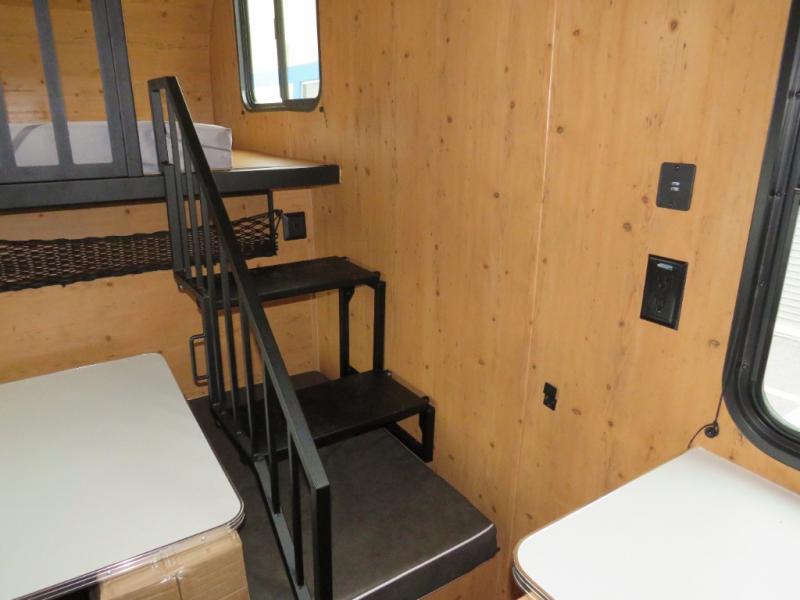 Step inside and discover a well-designed space that maximizes comfort and functionality in every corner. At the rear, you'll find a full bathroom, complete with a sink and overhead cabinet plus a 24" x 36" shower, allowing you to freshen up without relying on campground facilities. Moving to the center, the entertainment center provides a great spot to unwind, while the kitchen across the way is equipped with a 10.7 cu. ft. refrigerator, a two-burner cooktop, and ample overhead storage for your cooking essentials. Toward the front, a 41" dinette offers the perfect place to dine, relax, or plan your next adventure. Just across from it, fold-up steps lead to a cozy 48" x 74" bed, giving you a comfortable retreat to rest and recharge after a day of exploring.