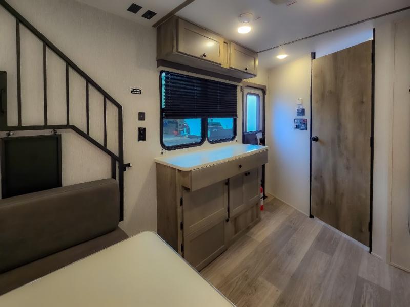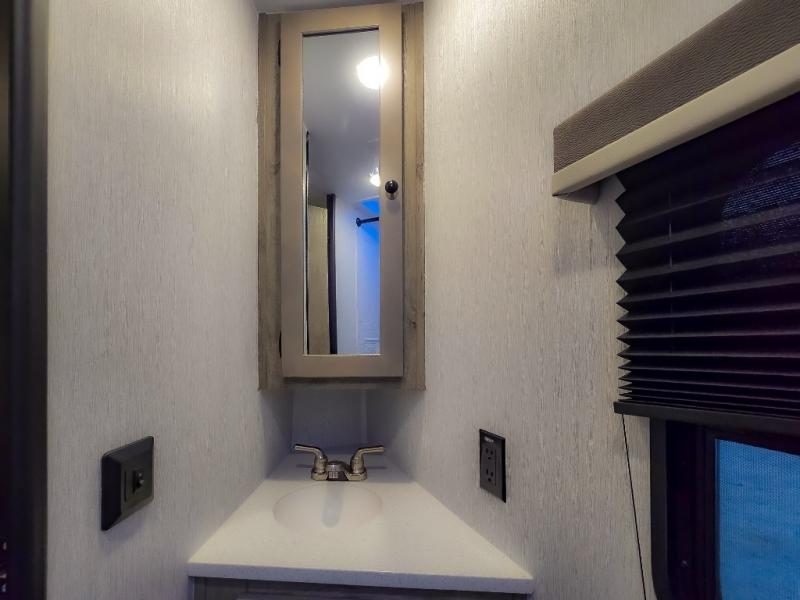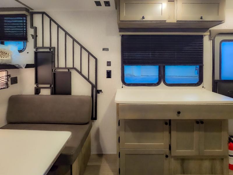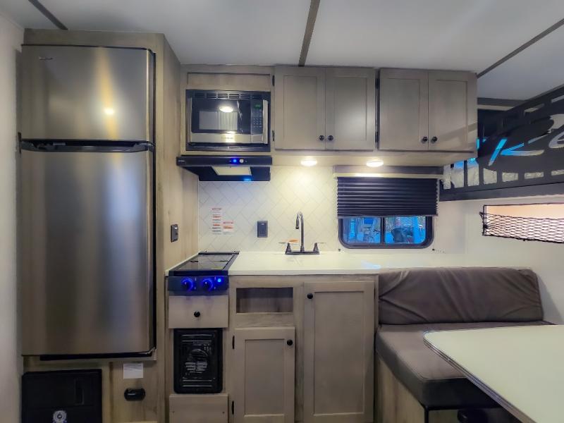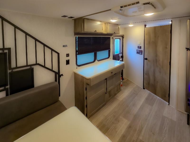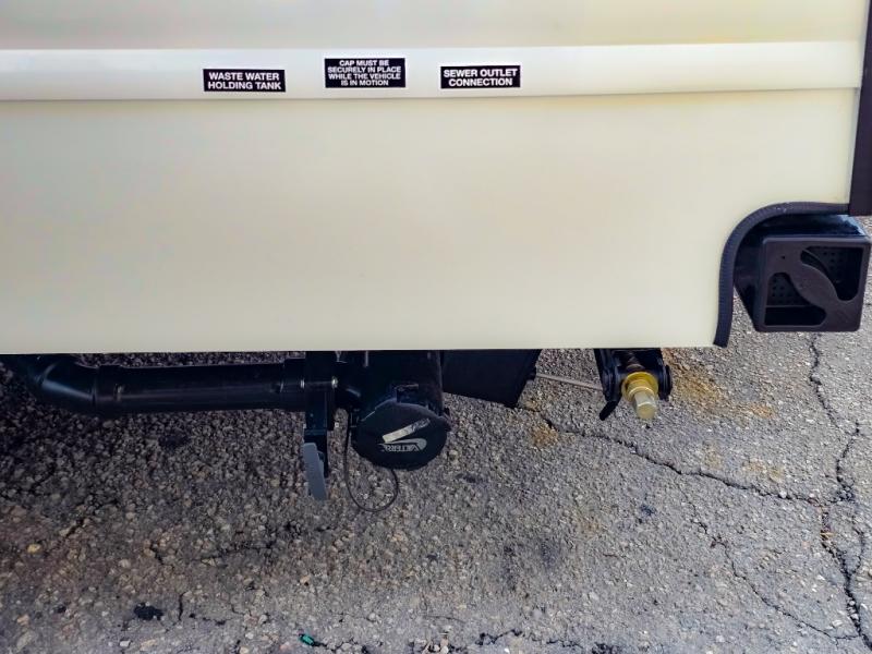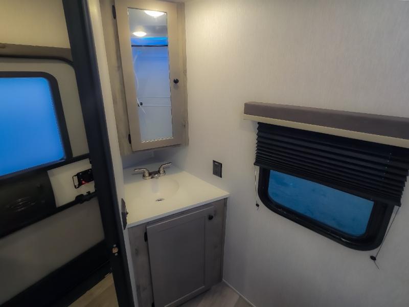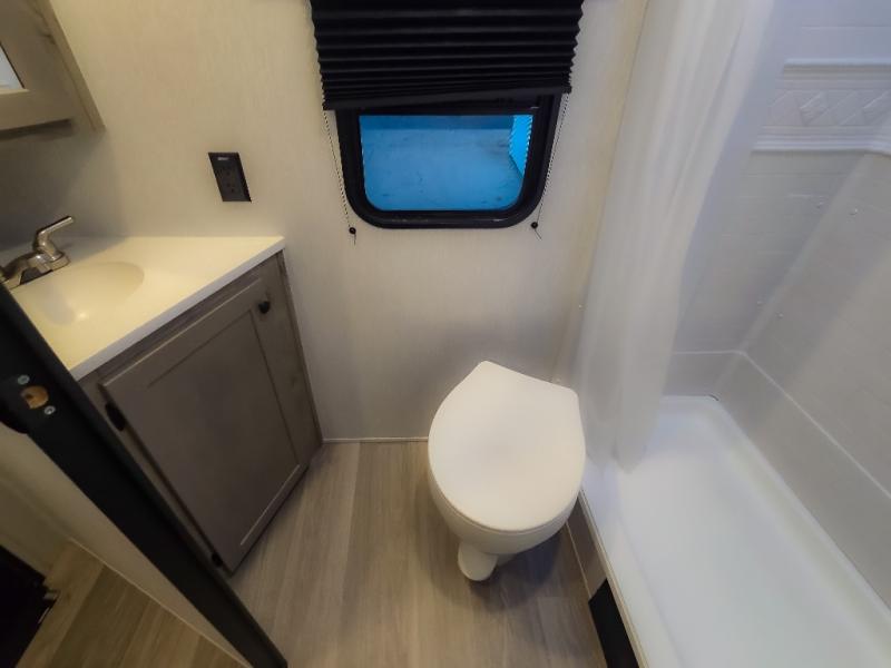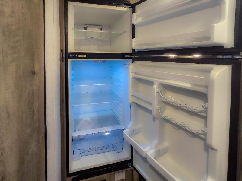 Step inside and discover a well-designed space that maximizes comfort and functionality in every corner. At the rear, you'll find a full bathroom, complete with a sink and overhead cabinet plus a 24" x 36" shower, allowing you to freshen up without relying on campground facilities. Moving to the center, the entertainment center provides a great spot to unwind, while the kitchen across the way is equipped with a 10.7 cu. ft. refrigerator, a two-burner cooktop, and ample overhead storage for your cooking essentials. Toward the front, a 41" dinette offers the perfect place to dine, relax, or plan your next adventure. Just across from it, fold-up steps lead to a cozy 48" x 74" bed, giving you a comfortable retreat to rest and recharge after a day of exploring.
