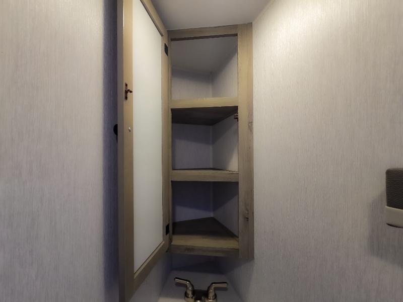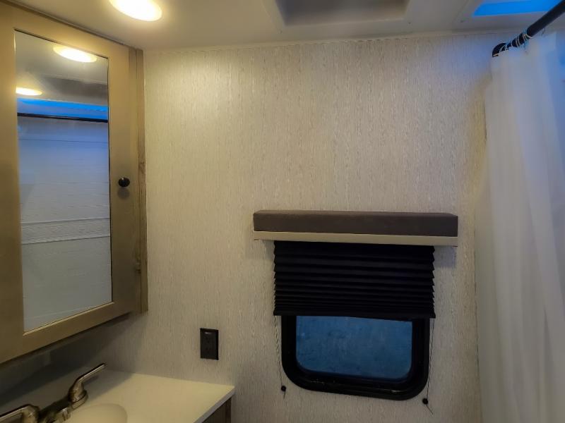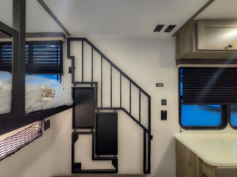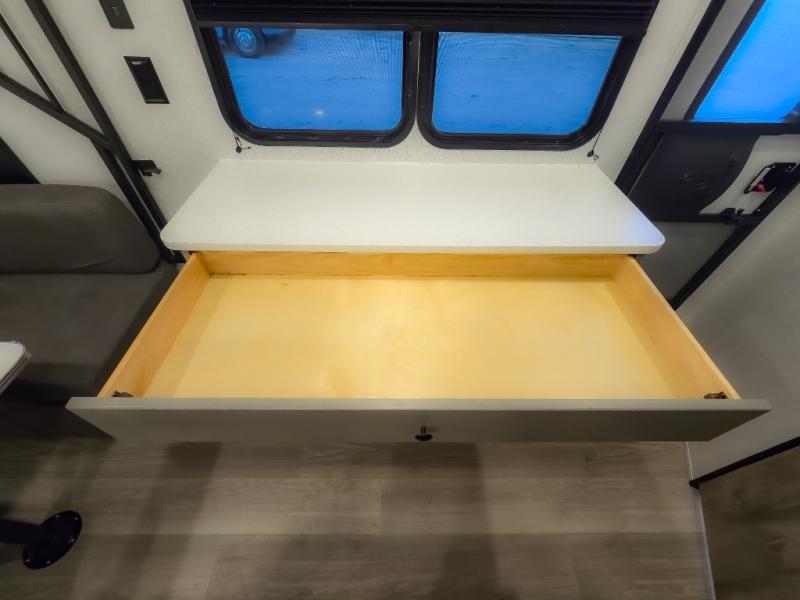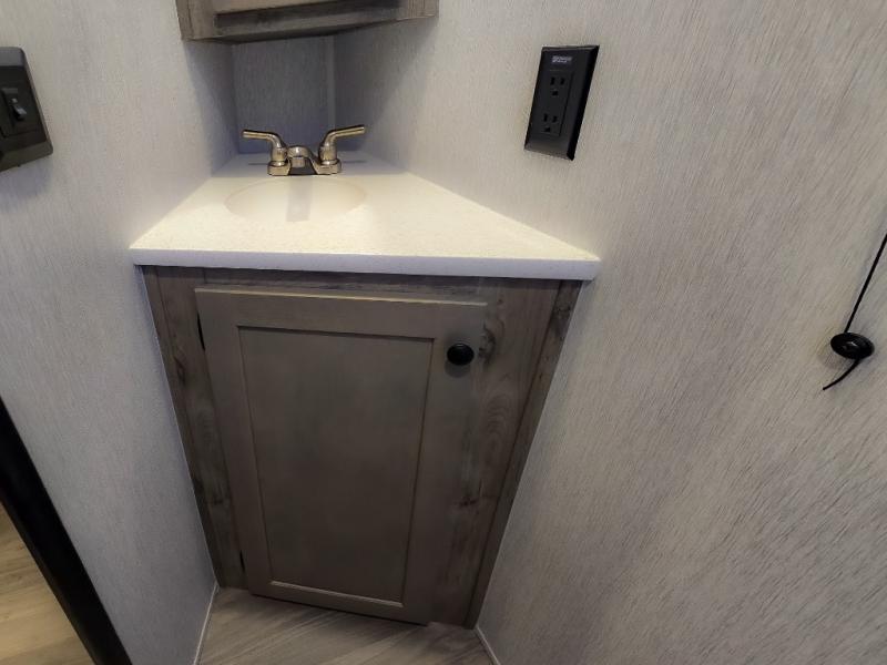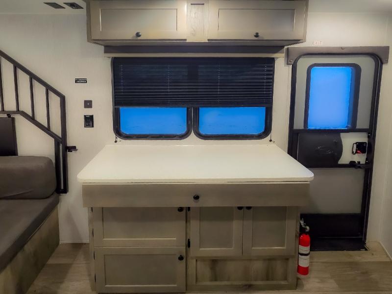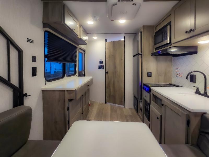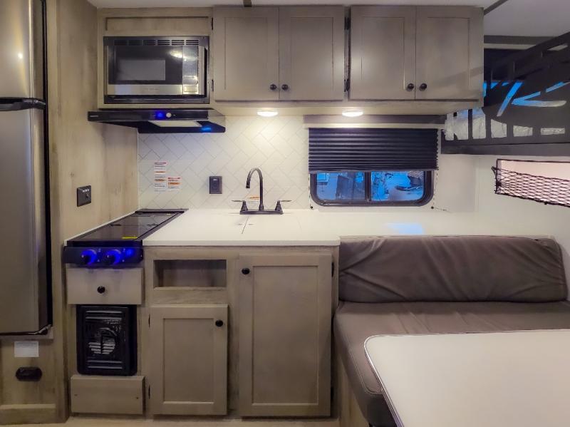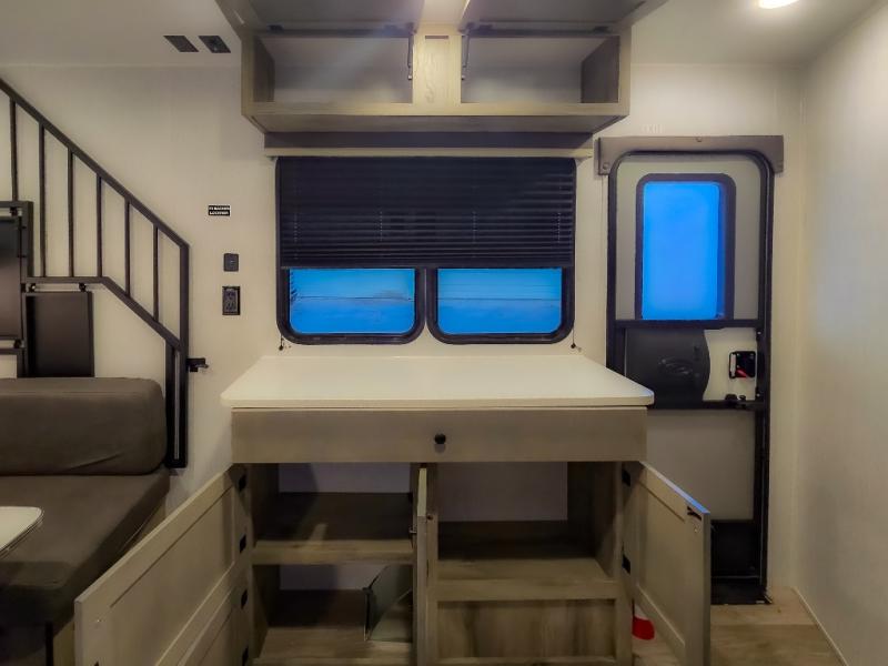 Step inside and discover a well-designed space that maximizes comfort and functionality in every corner. At the rear, you'll find a full bathroom, complete with a sink and overhead cabinet plus a 24" x 36" shower, allowing you to freshen up without relying on campground facilities. Moving to the center, the entertainment center provides a great spot to unwind, while the kitchen across the way is equipped with a 10.7 cu. ft. refrigerator, a two-burner cooktop, and ample overhead storage for your cooking essentials. Toward the front, a 41" dinette offers the perfect place to dine, relax, or plan your next adventure. Just across from it, fold-up steps lead to a cozy 48" x 74" bed, giving you a comfortable retreat to rest and recharge after a day of exploring.