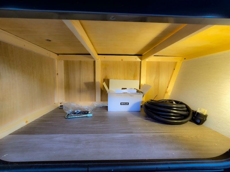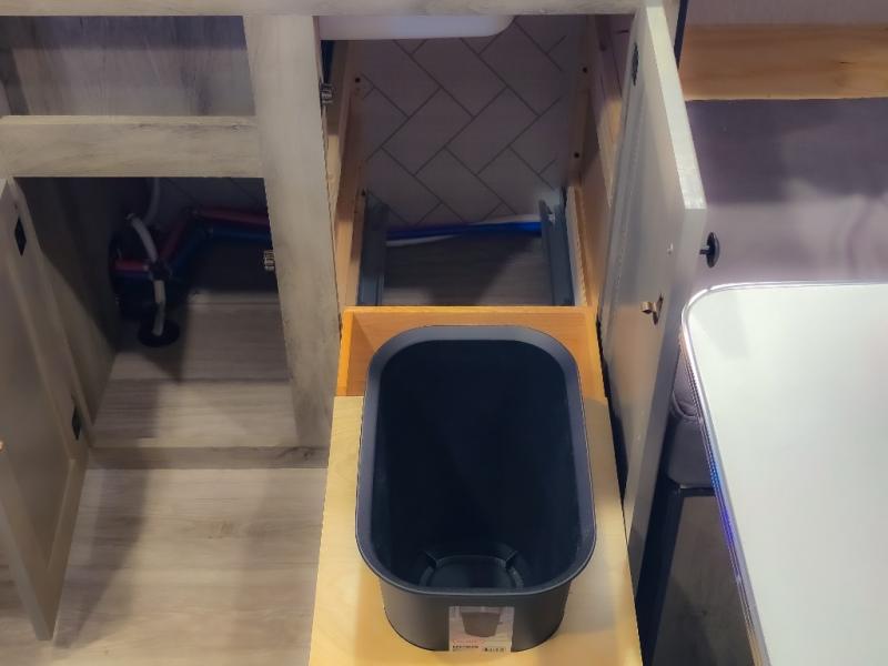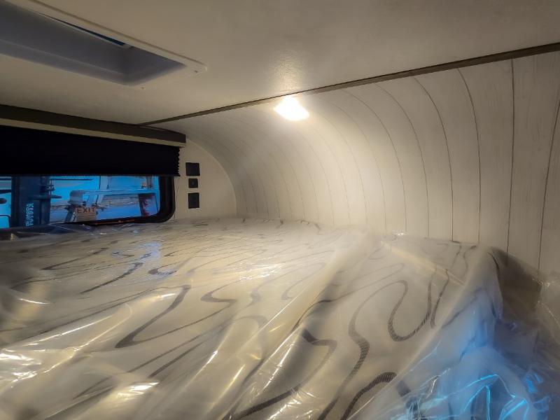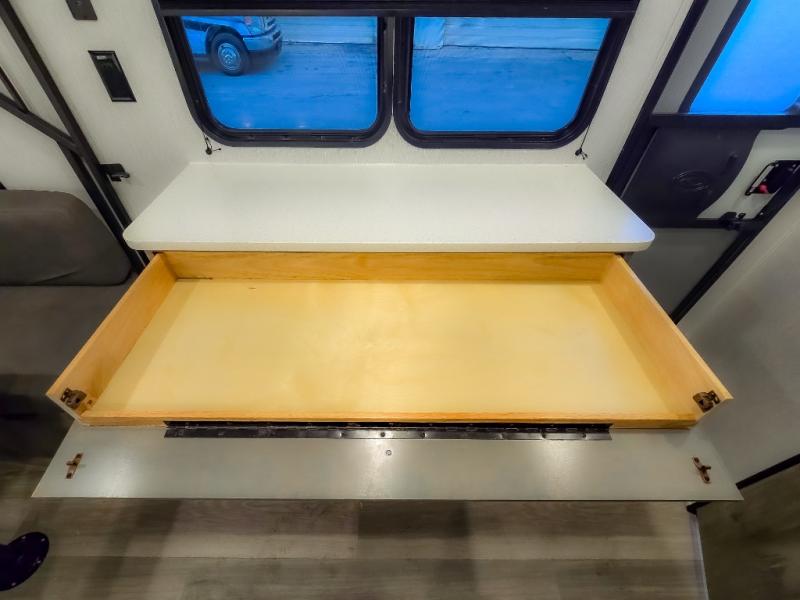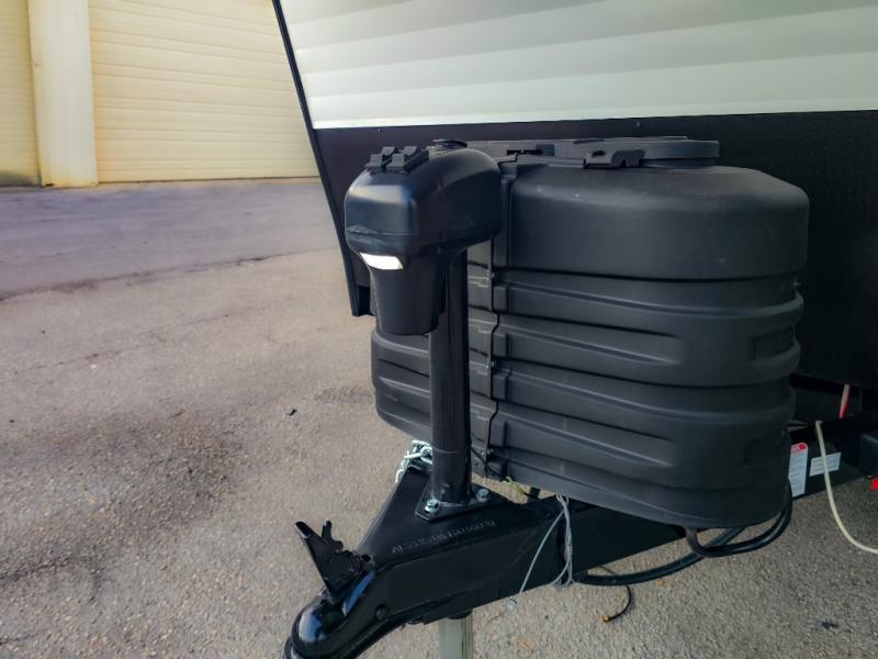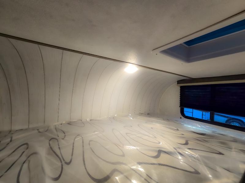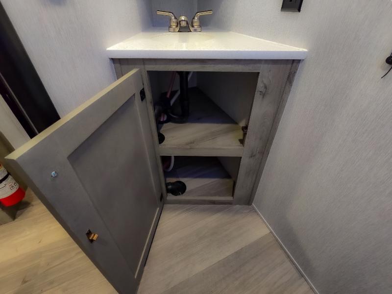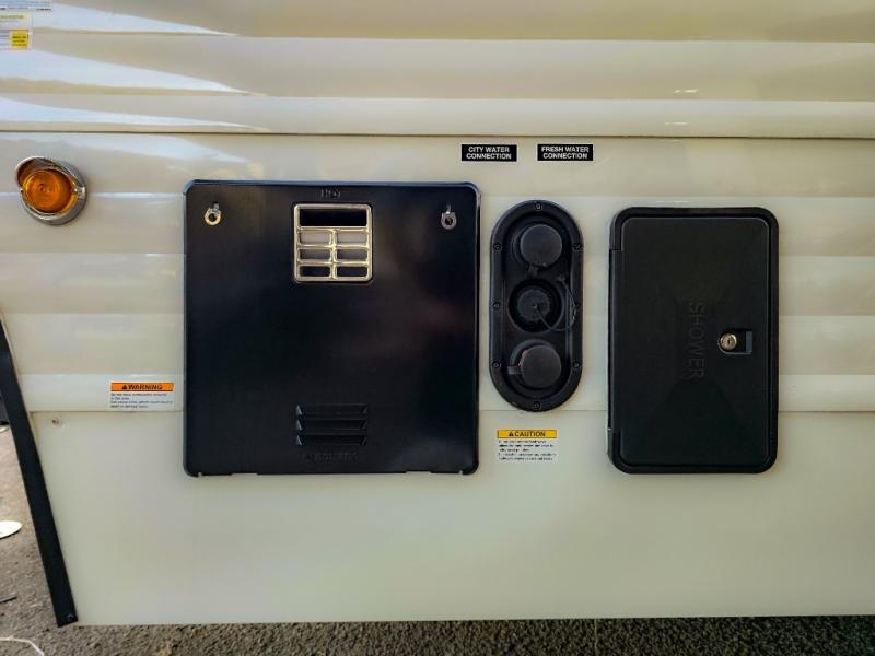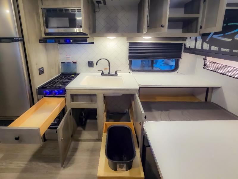 Step inside and discover a well-designed space that maximizes comfort and functionality in every corner. At the rear, you'll find a full bathroom, complete with a sink and overhead cabinet plus a 24" x 36" shower, allowing you to freshen up without relying on campground facilities. Moving to the center, the entertainment center provides a great spot to unwind, while the kitchen across the way is equipped with a 10.7 cu. ft. refrigerator, a two-burner cooktop, and ample overhead storage for your cooking essentials. Toward the front, a 41" dinette offers the perfect place to dine, relax, or plan your next adventure. Just across from it, fold-up steps lead to a cozy 48" x 74" bed, giving you a comfortable retreat to rest and recharge after a day of exploring.