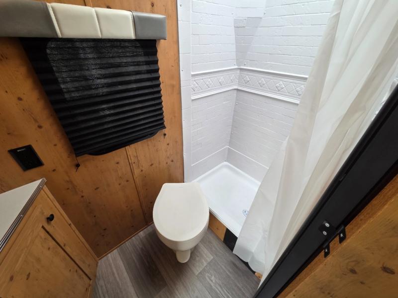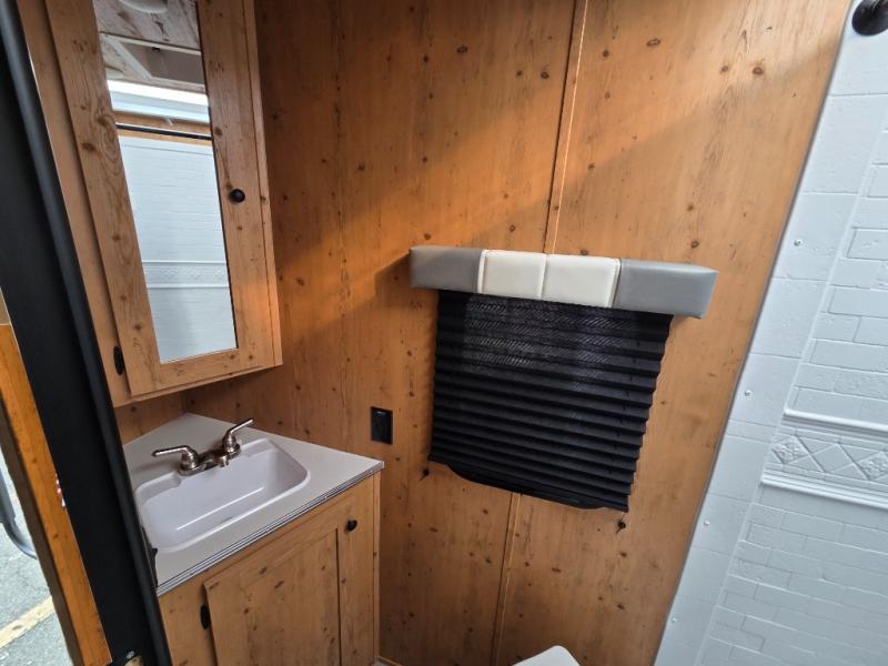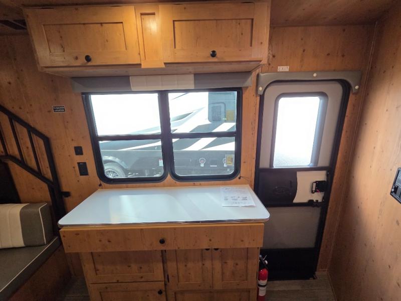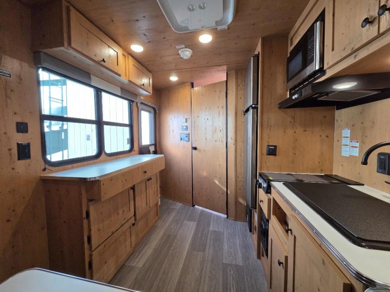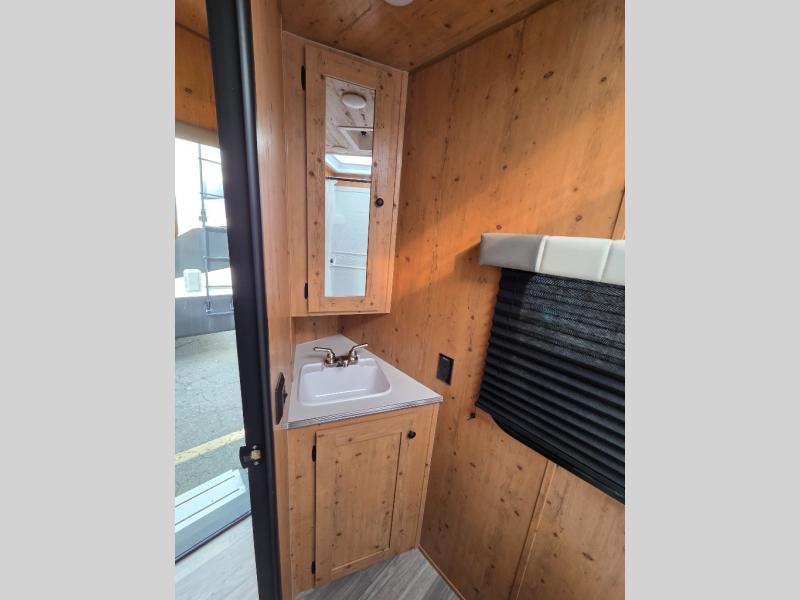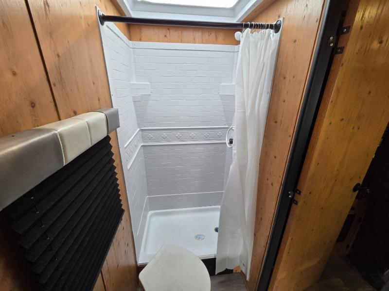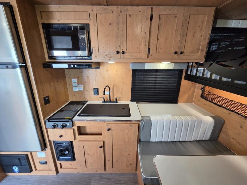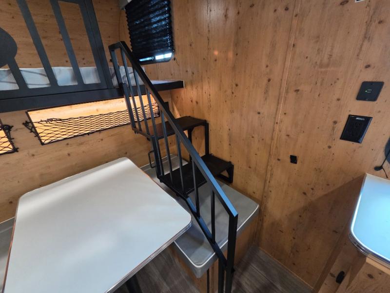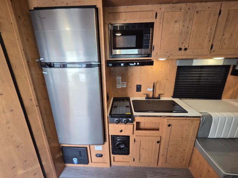 Step inside and discover a well-designed space that maximizes comfort and functionality in every corner. At the rear, you'll find a full bathroom, complete with a sink and overhead cabinet plus a 24" x 36" shower, allowing you to freshen up without relying on campground facilities. Moving to the center, the entertainment center provides a great spot to unwind, while the kitchen across the way is equipped with a 10.7 cu. ft. refrigerator, a two-burner cooktop, and ample overhead storage for your cooking essentials. Toward the front, a 41" dinette offers the perfect place to dine, relax, or plan your next adventure. Just across from it, fold-up steps lead to a cozy 48" x 74" bed, giving you a comfortable retreat to rest and recharge after a day of exploring.