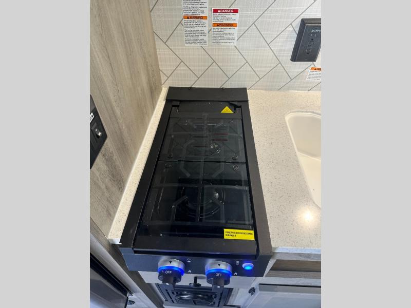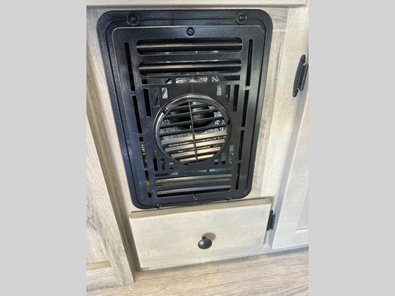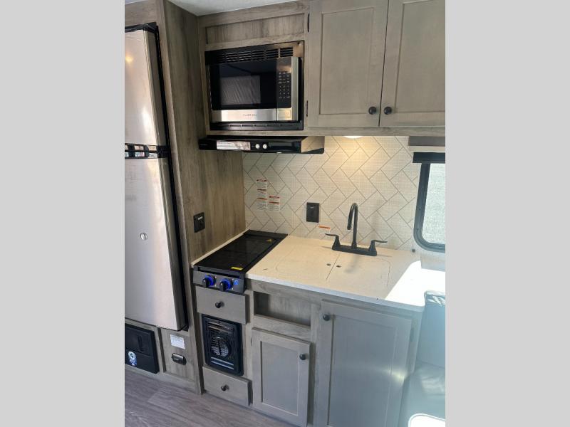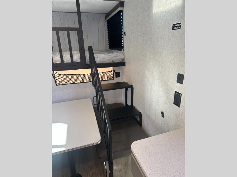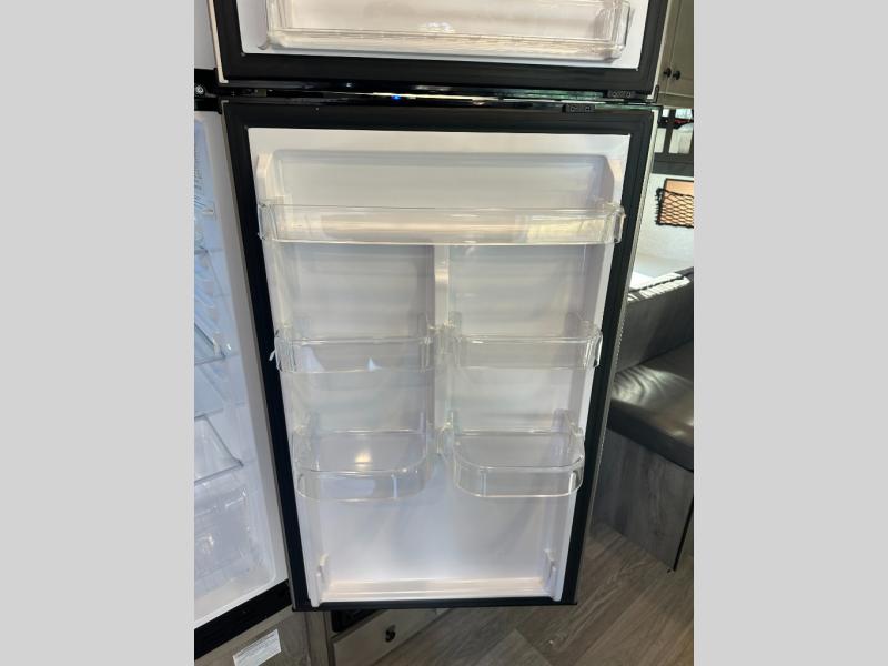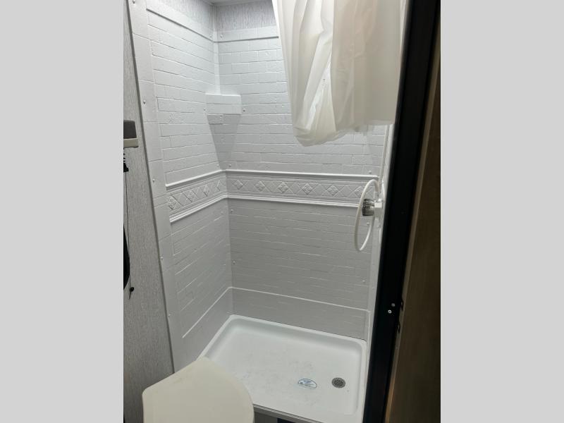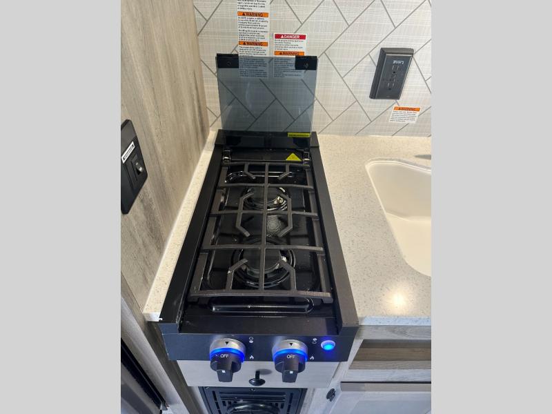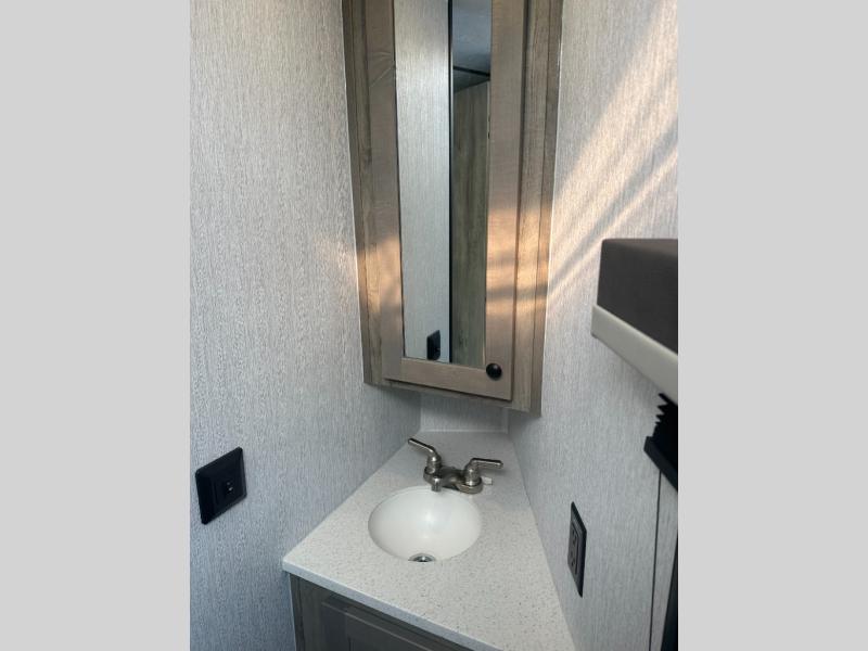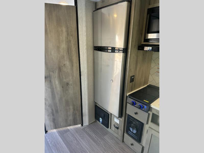 Step inside and discover a well-designed space that maximizes comfort and functionality in every corner. At the rear, you'll find a full bathroom, complete with a sink and overhead cabinet plus a 24" x 36" shower, allowing you to freshen up without relying on campground facilities. Moving to the center, the entertainment center provides a great spot to unwind, while the kitchen across the way is equipped with a 10.7 cu. ft. refrigerator, a two-burner cooktop, and ample overhead storage for your cooking essentials. Toward the front, a 41" dinette offers the perfect place to dine, relax, or plan your next adventure. Just across from it, fold-up steps lead to a cozy 48" x 74" bed, giving you a comfortable retreat to rest and recharge after a day of exploring.