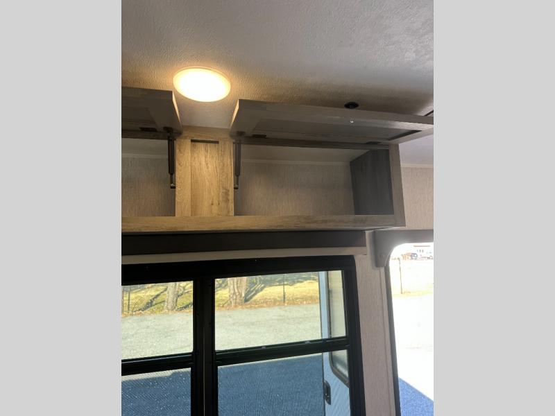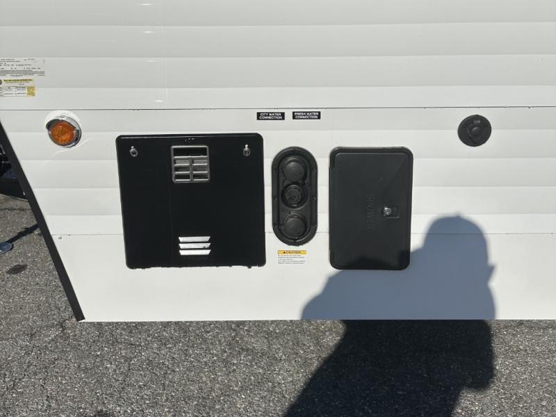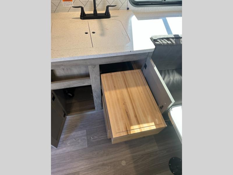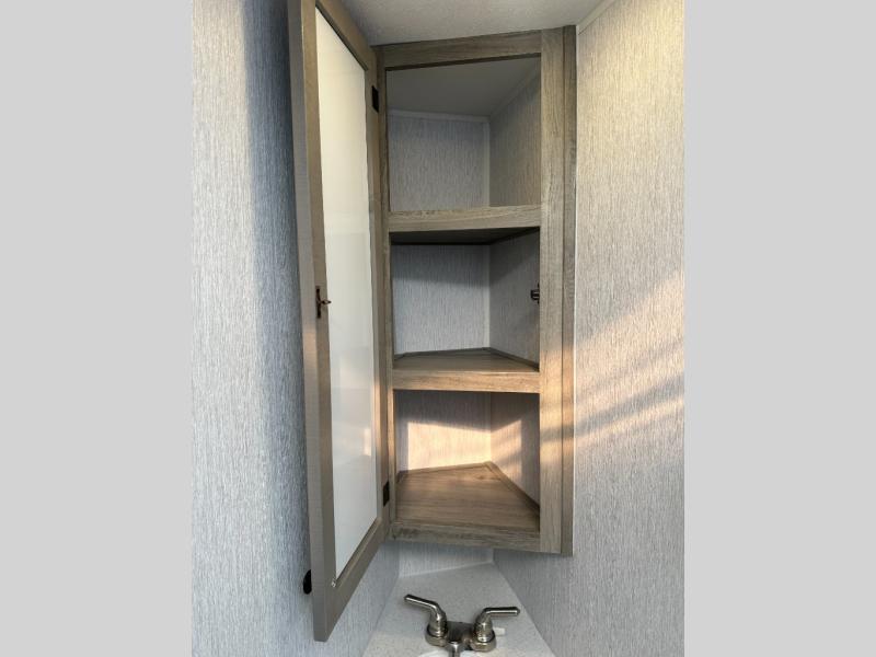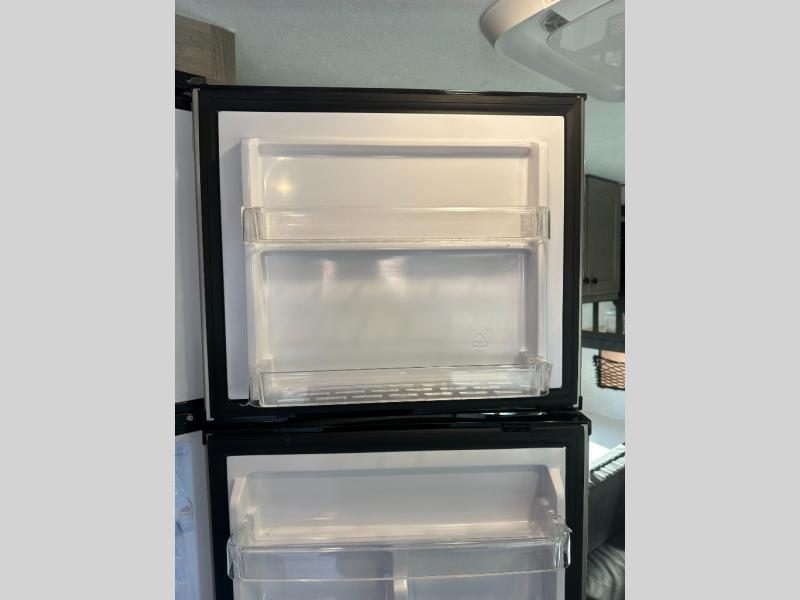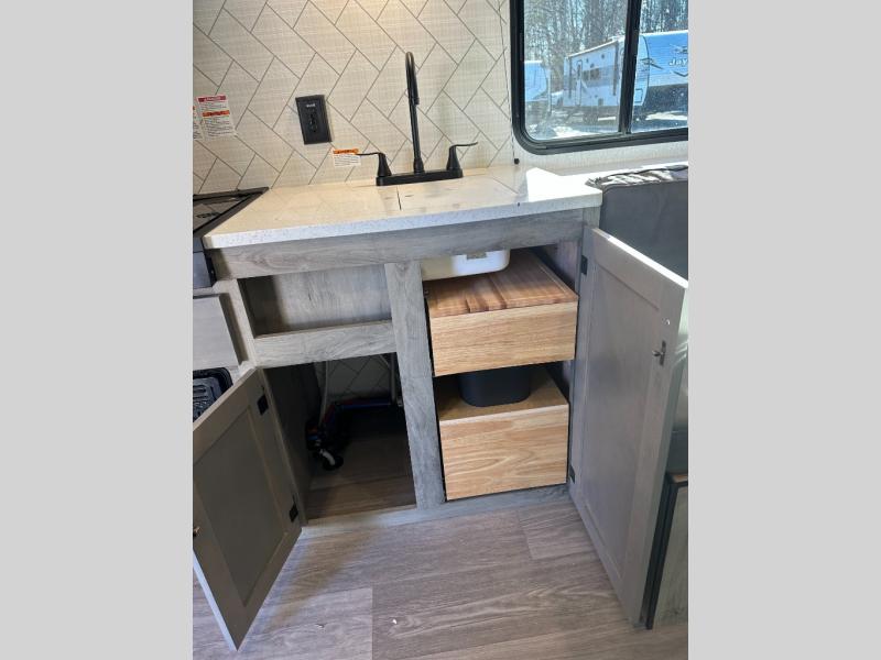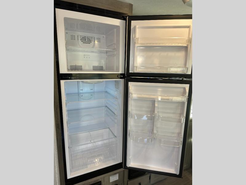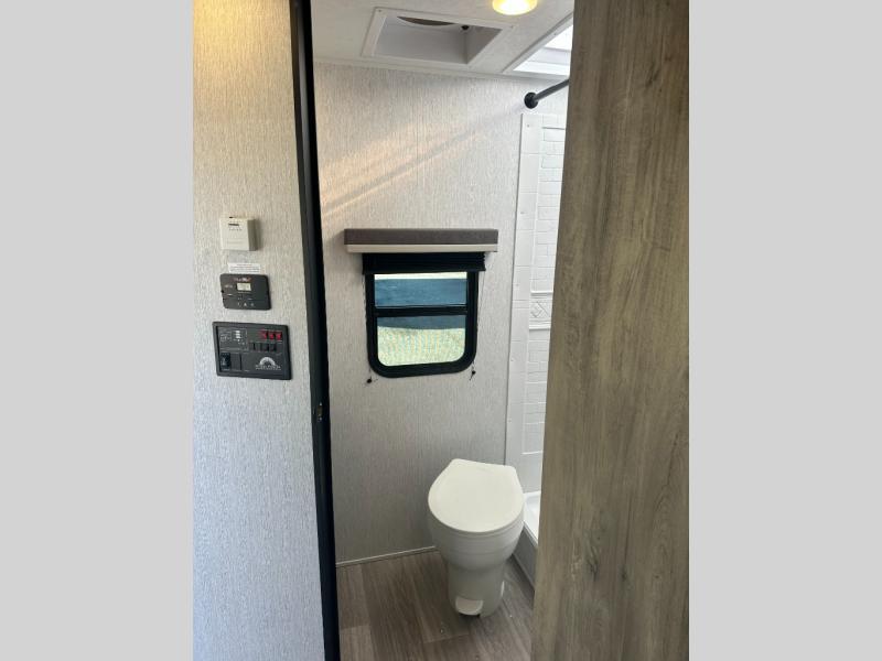 Step inside and discover a well-designed space that maximizes comfort and functionality in every corner. At the rear, you'll find a full bathroom, complete with a sink and overhead cabinet plus a 24" x 36" shower, allowing you to freshen up without relying on campground facilities. Moving to the center, the entertainment center provides a great spot to unwind, while the kitchen across the way is equipped with a 10.7 cu. ft. refrigerator, a two-burner cooktop, and ample overhead storage for your cooking essentials. Toward the front, a 41" dinette offers the perfect place to dine, relax, or plan your next adventure. Just across from it, fold-up steps lead to a cozy 48" x 74" bed, giving you a comfortable retreat to rest and recharge after a day of exploring.