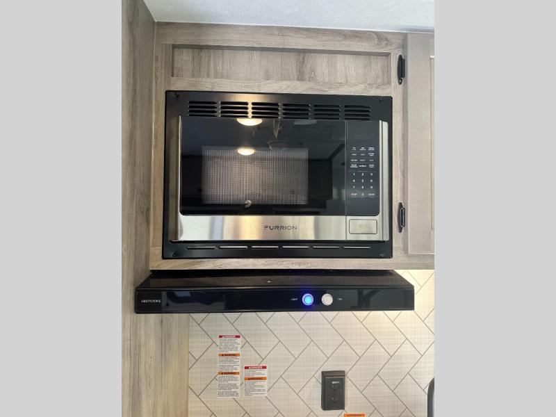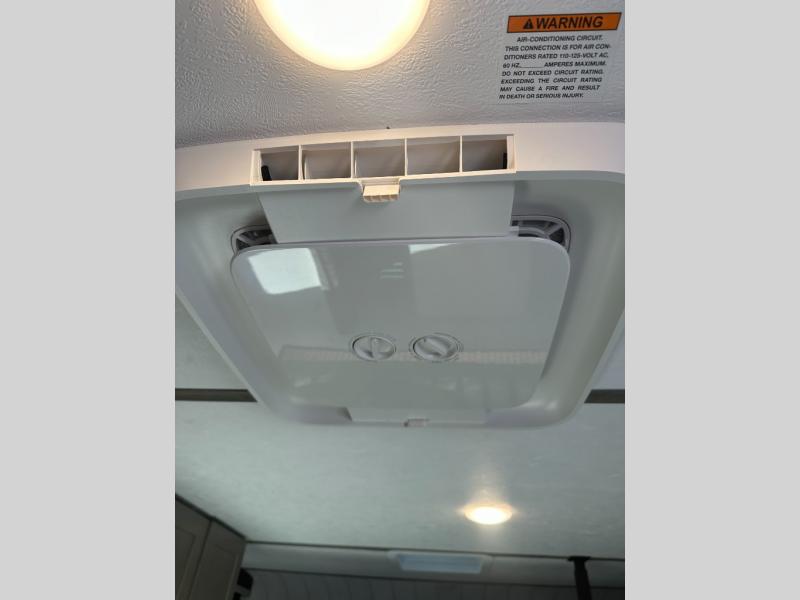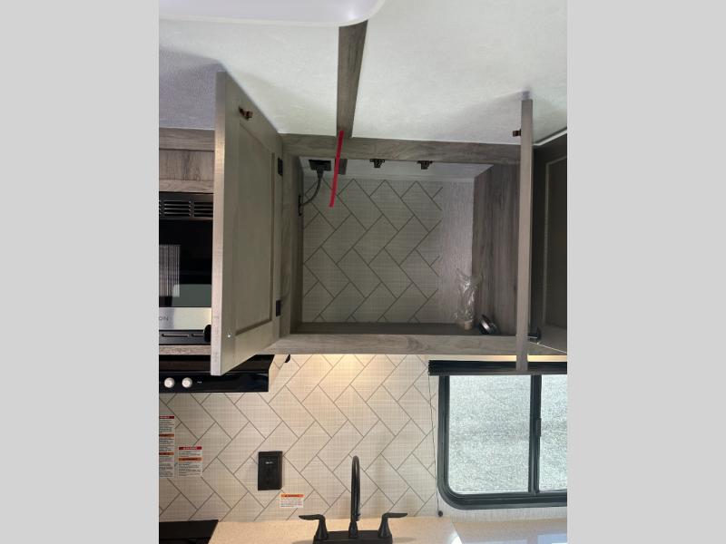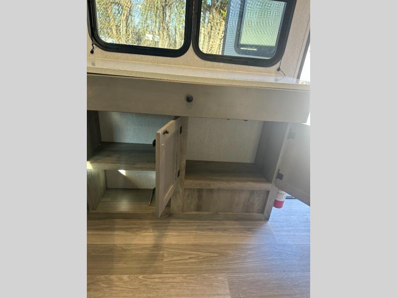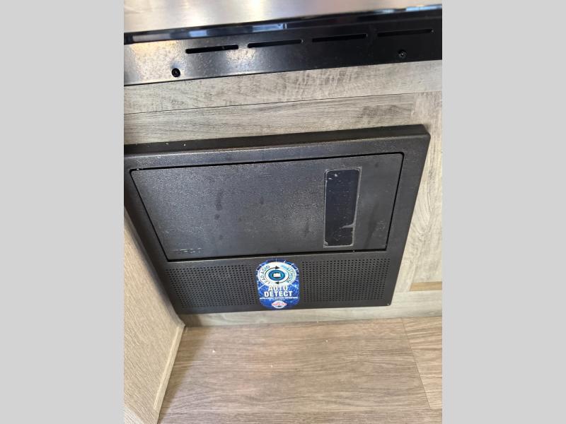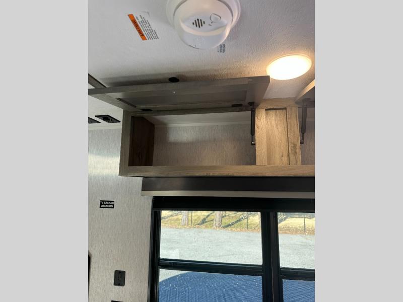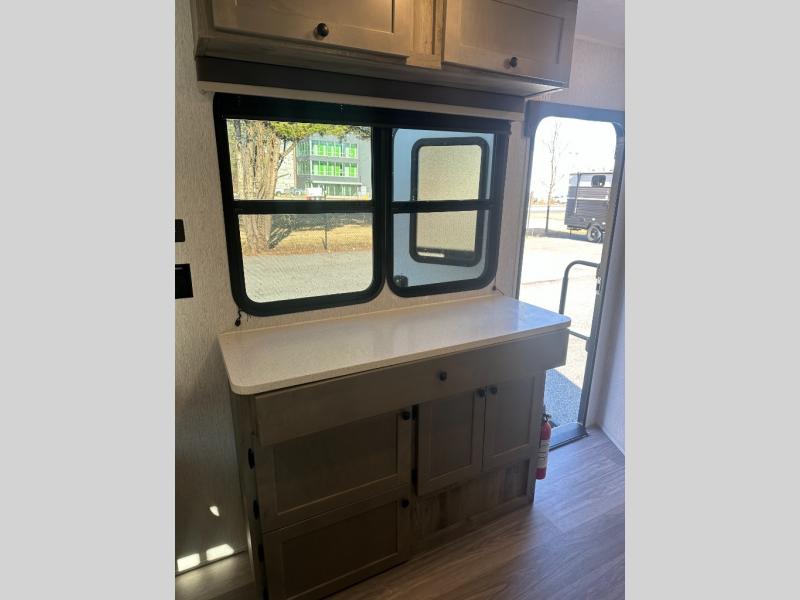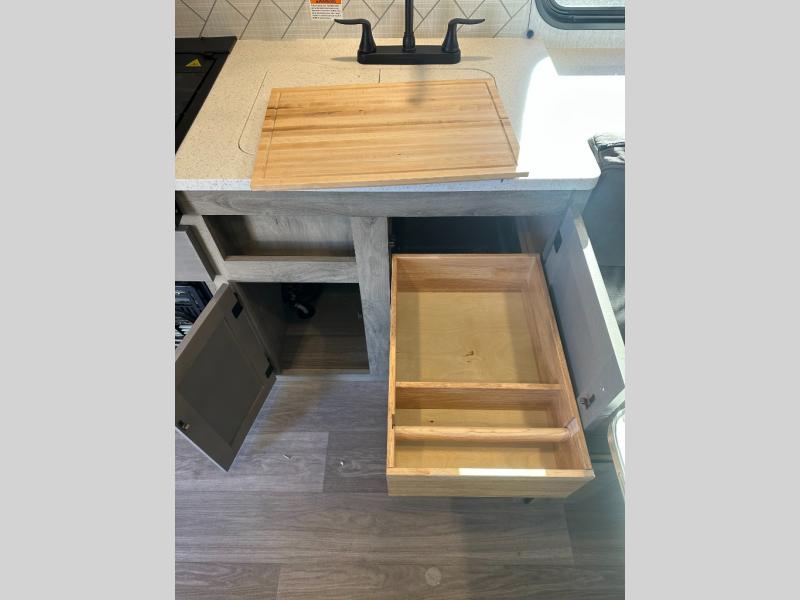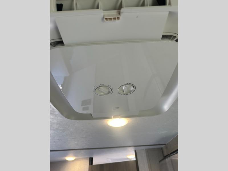 Step inside and discover a well-designed space that maximizes comfort and functionality in every corner. At the rear, you'll find a full bathroom, complete with a sink and overhead cabinet plus a 24" x 36" shower, allowing you to freshen up without relying on campground facilities. Moving to the center, the entertainment center provides a great spot to unwind, while the kitchen across the way is equipped with a 10.7 cu. ft. refrigerator, a two-burner cooktop, and ample overhead storage for your cooking essentials. Toward the front, a 41" dinette offers the perfect place to dine, relax, or plan your next adventure. Just across from it, fold-up steps lead to a cozy 48" x 74" bed, giving you a comfortable retreat to rest and recharge after a day of exploring.