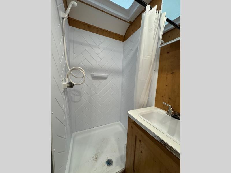At the front of the trailer, a spacious 60" x 74" bed provides a cozy retreat where you can unwind and enjoy a restful night’s sleep. Moving toward the center, the booth dinette offers a comfortable space to dine or relax, while the 56" sofa across, adds additional seating for lounging or entertaining. In the rear corner, the kitchen comes fully equipped with a 10.7 cu. ft. refrigerator to keep your groceries fresh, a three-burner cooktop, and a microwave, giving you everything you need to cook in comfort. Opposite the kitchen, the full bathroom includes a 30" x 36" shower, allowing you to freshen up in privacy without relying on campground facilities. Thoughtfully designed and efficiently arranged, this layout offers the perfect balance of comfort, convenience, and home-like functionality.