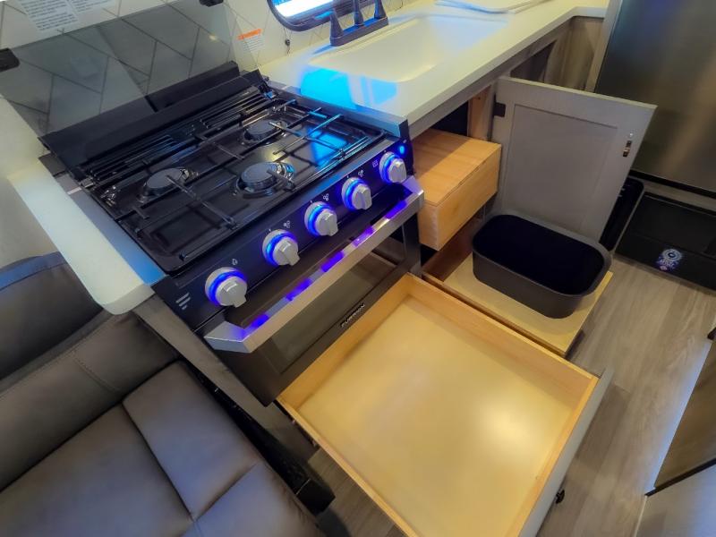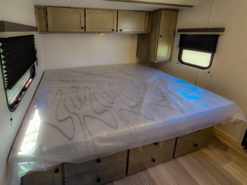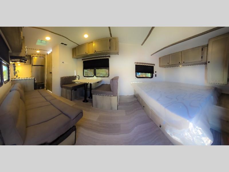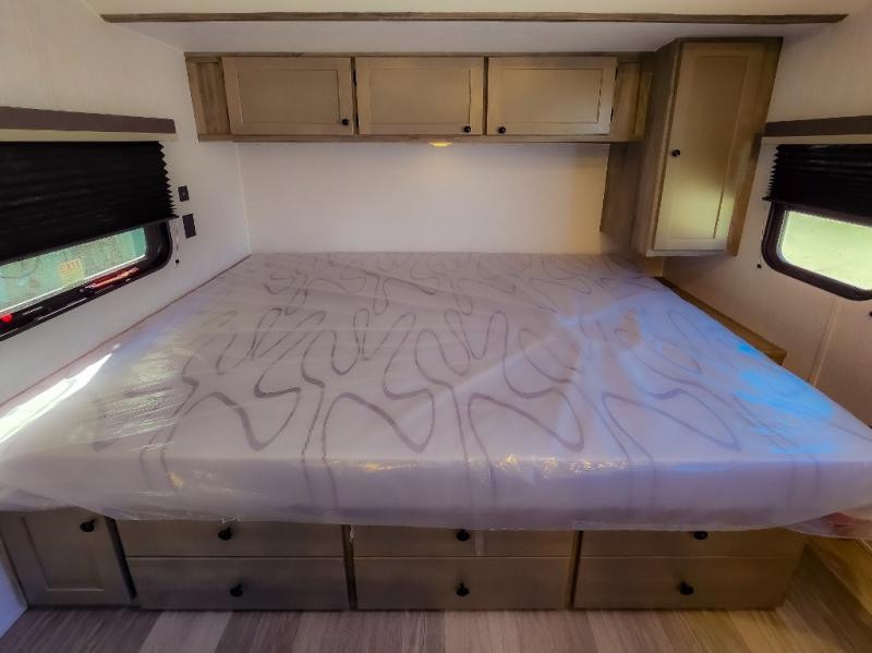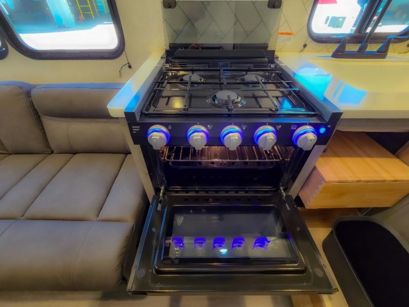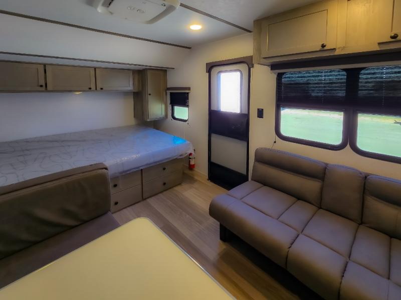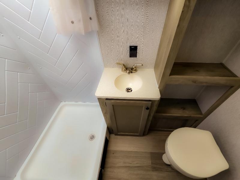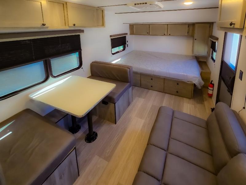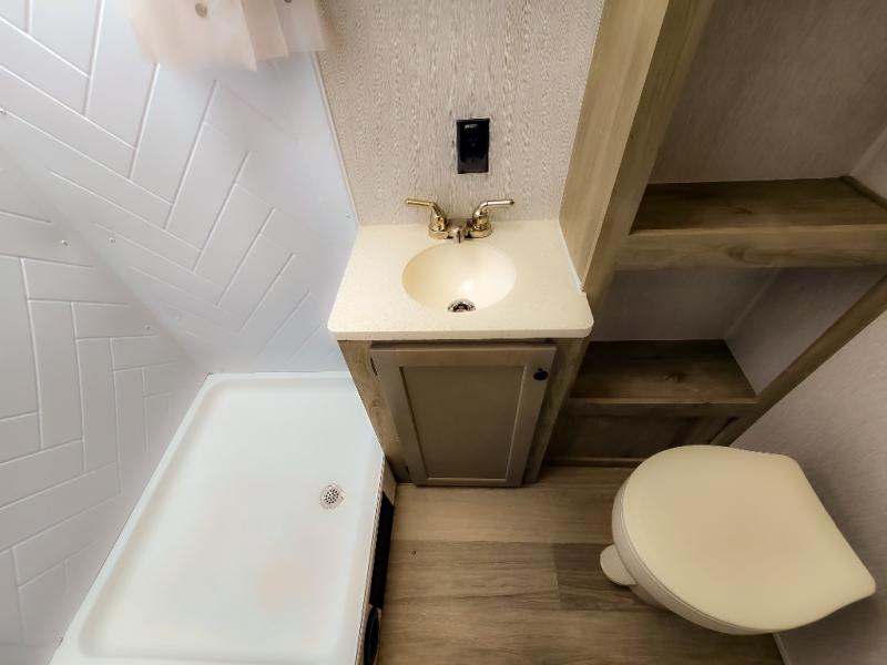 At the front of the trailer, a spacious 60" x 74" bed provides a cozy retreat where you can unwind and enjoy a restful night’s sleep. Moving toward the center, the booth dinette offers a comfortable space to dine or relax, while the 56" sofa across, adds additional seating for lounging or entertaining. In the rear corner, the kitchen comes fully equipped with a 10.7 cu. ft. refrigerator to keep your groceries fresh, a three-burner cooktop, and a microwave, giving you everything you need to cook in comfort. Opposite the kitchen, the full bathroom includes a 30" x 36" shower, allowing you to freshen up in privacy without relying on campground facilities. Thoughtfully designed and efficiently arranged, this layout offers the perfect balance of comfort, convenience, and home-like functionality.