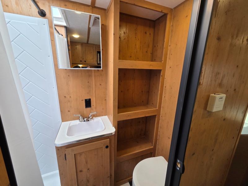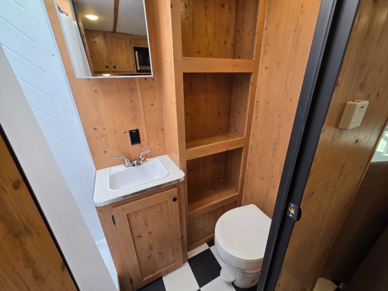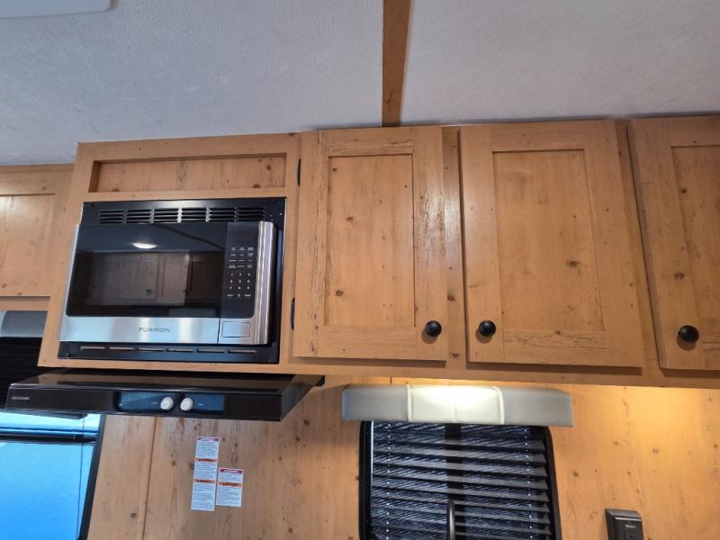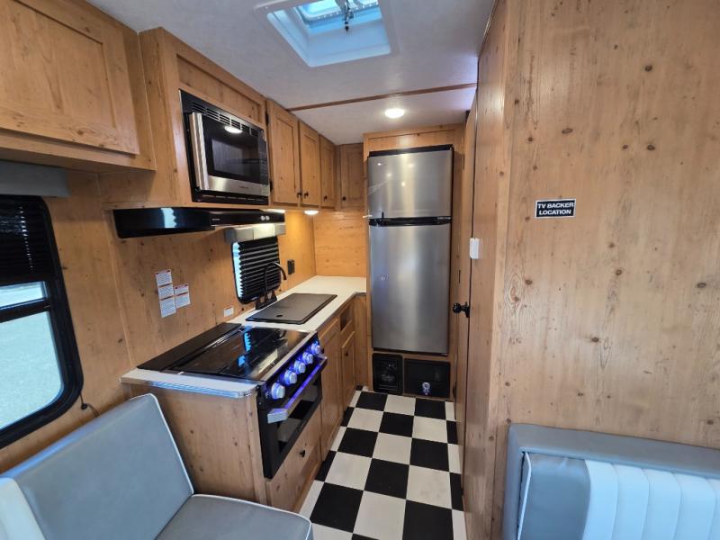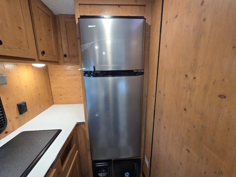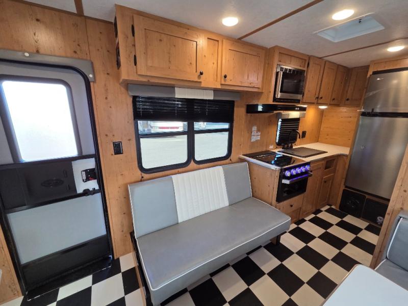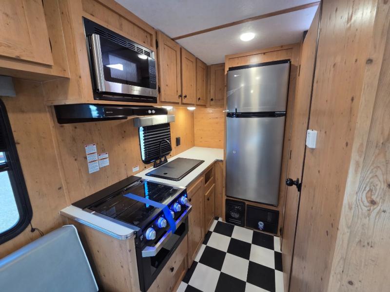 At the front of the trailer, a spacious 60" x 74" bed provides a cozy retreat where you can unwind and enjoy a restful night’s sleep. Moving toward the center, the booth dinette offers a comfortable space to dine or relax, while the 56" sofa across, adds additional seating for lounging or entertaining. In the rear corner, the kitchen comes fully equipped with a 10.7 cu. ft. refrigerator to keep your groceries fresh, a three-burner cooktop, and a microwave, giving you everything you need to cook in comfort. Opposite the kitchen, the full bathroom includes a 30" x 36" shower, allowing you to freshen up in privacy without relying on campground facilities. Thoughtfully designed and efficiently arranged, this layout offers the perfect balance of comfort, convenience, and home-like functionality.