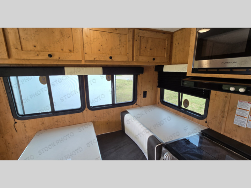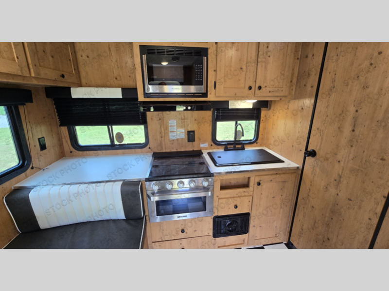 Starting at the rear of the trailer, the inviting main living area features a cozy booth dinette where you can enjoy meals, relax, or plan your next adventure. Just across, the 10.7 cu. ft. refrigerator keeps your groceries fresh and easily accessible, while the kitchen area includes a three-burner cooktop, microwave, and plenty of interior storage for cookware and essentials, making it easy to prepare meals on the go. Moving toward the center, the walk-through bathroom offers convenience and comfort with a 30" x 36" shower and a linen closet for storing towels and toiletries. At the front, the private bedroom provides a peaceful retreat with a 60" x 74" bed and overhead cabinets ideal for stowing clothing and camping gear. Thoughtfully arranged and packed with practical features, this layout combines functionality and comfort for every journey.