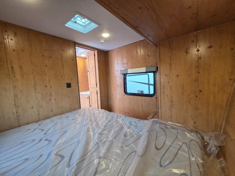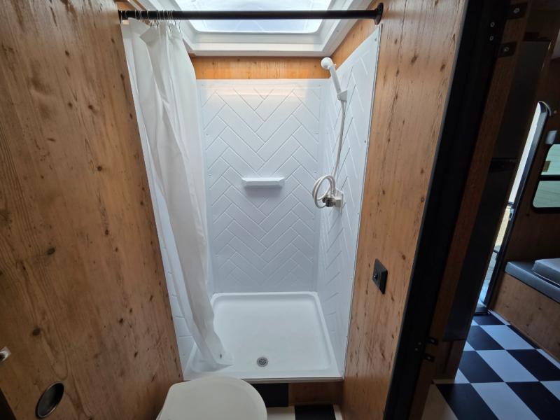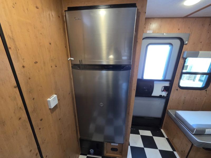Starting at the rear of the trailer, the inviting main living area features a cozy booth dinette where you can enjoy meals, relax, or plan your next adventure. Just across, the 10.7 cu. ft. refrigerator keeps your groceries fresh and easily accessible, while the kitchen area includes a three-burner cooktop, microwave, and plenty of interior storage for cookware and essentials, making it easy to prepare meals on the go. Moving toward the center, the walk-through bathroom offers convenience and comfort with a 30" x 36" shower and a linen closet for storing towels and toiletries. At the front, the private bedroom provides a peaceful retreat with a 60" x 74" bed and overhead cabinets ideal for stowing clothing and camping gear. Thoughtfully arranged and packed with practical features, this layout combines functionality and comfort for every journey.