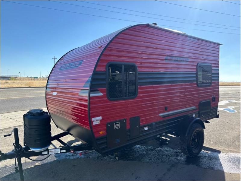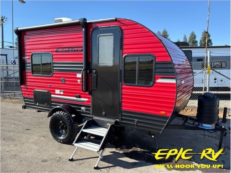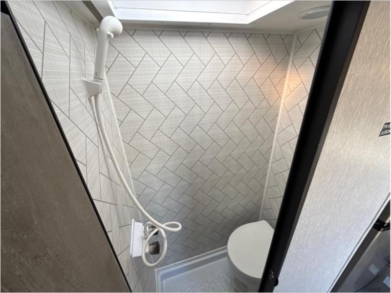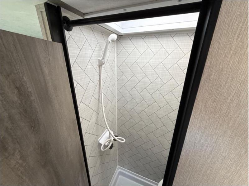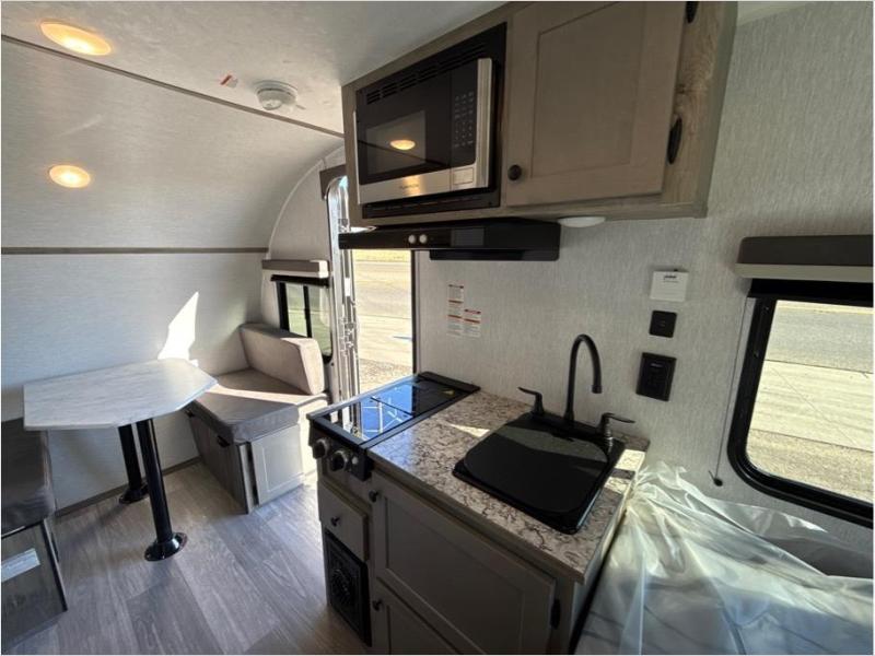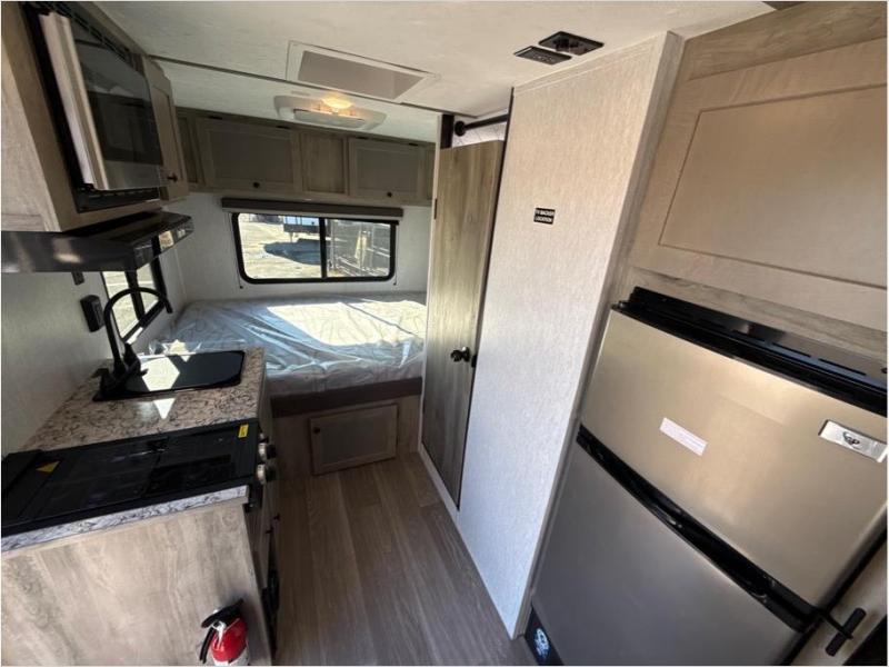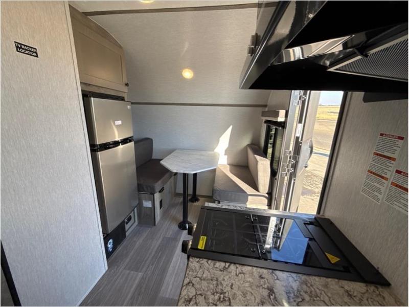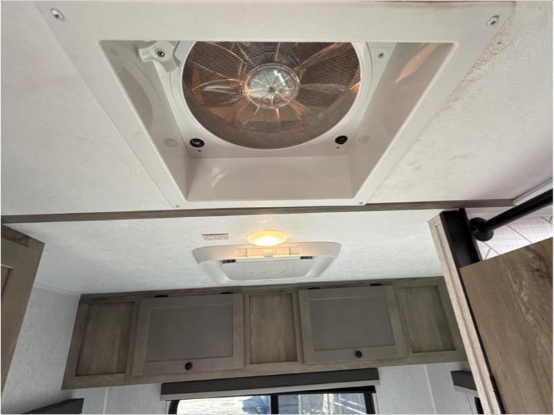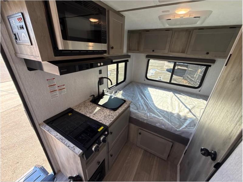 This travel trailer is comfy and accommodating because it comes with a wet bath, so you don't have to use the camp's facilities! There is a small kitchen on the interior that comes with a two-burner stove top, a double door refrigerator, and a microwave so that you can cook dinner without having to start a fire, and since it is indoors, you will be able to keep the bugs away while you prepare something delicious to eat. If you need to rinse off some gear, the outside shower will be especially useful, and if you need to charge your devices, use the USB ports. You will also find a Winegard HDTV antenna on this model.