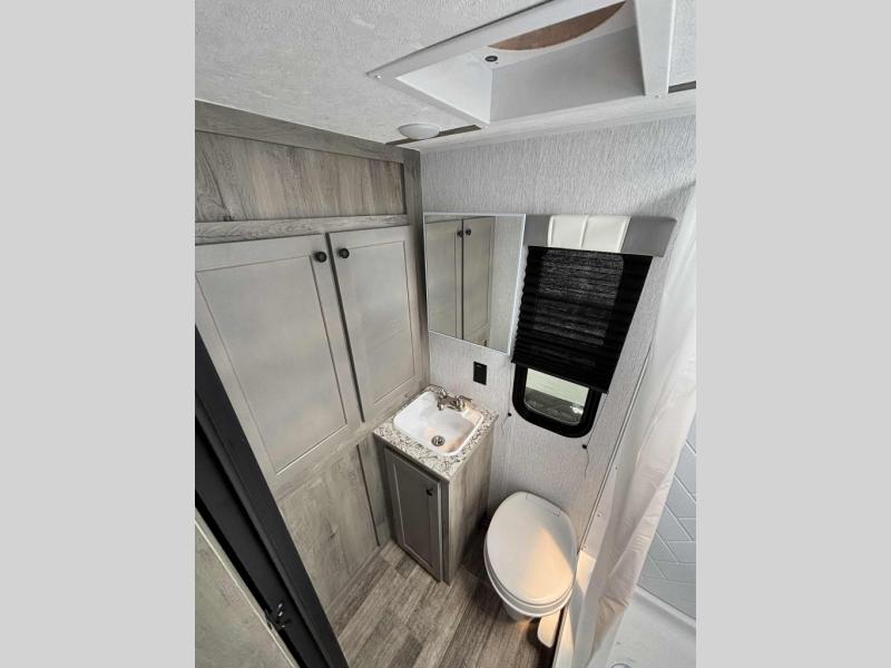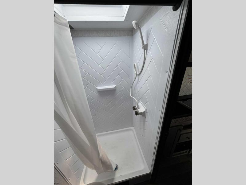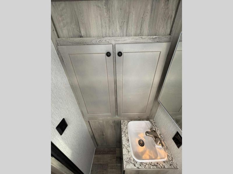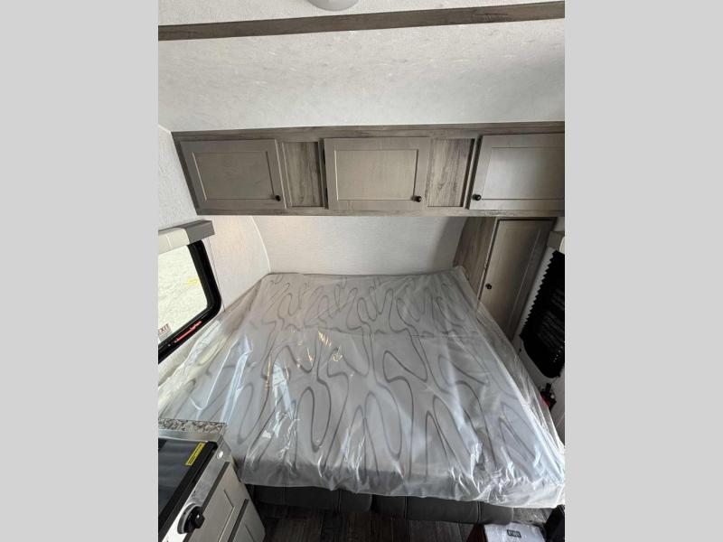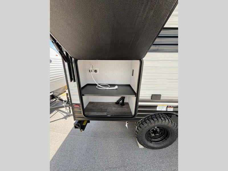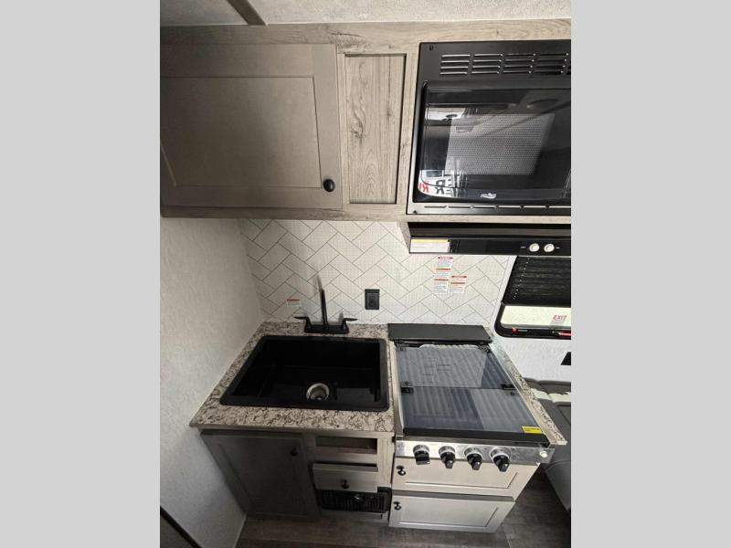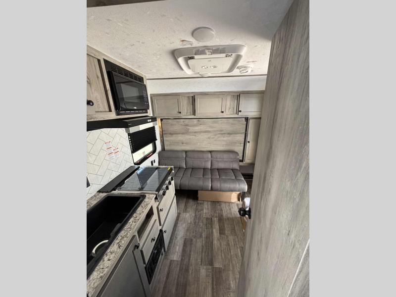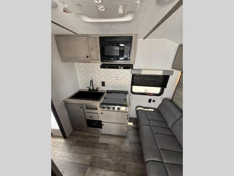 This compact travel trailer will be perfect for trips to the lake. Since there is a front Murphy bed, you won't have to sleep on an air mattress, and the convenient rear full bathroom lets you freshen up each day. Breakfast can be made on either the three burner cooktop, warmed up in the microwave oven, or even at the outside kitchen. When you're ready to wind down at night, you can grab a book and head to the sofa for a relaxing evening!