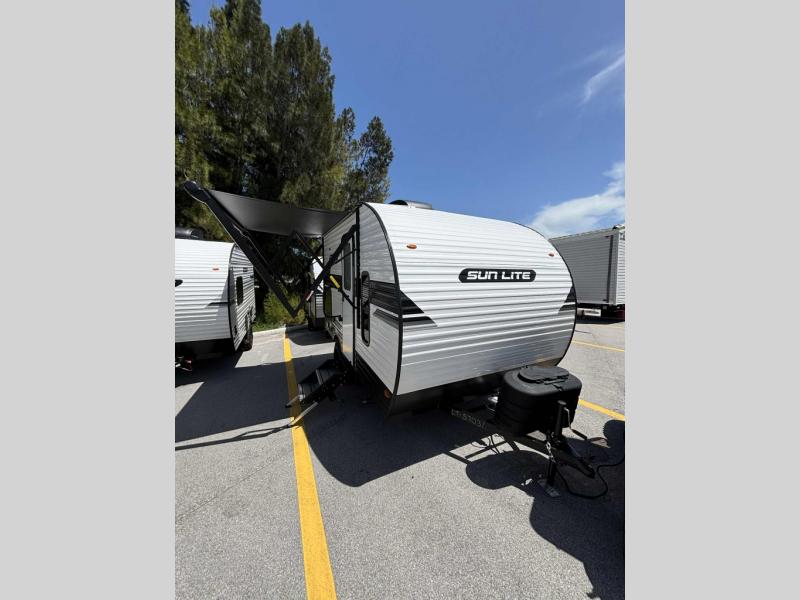 You can trust the build and enjoy your experience with any one of these Sunset Park RV Sun Lite travel trailers! Their aerodynamic profile is not only easy to haul, but also saves on fuel. They are built to withstand years of traveling even though they are lightweight with a diamond plate rock guard, a one piece PVC roof membrane, Dexter Spring-Leaf axles, and tinted safety glass windows. Some comfort standards you are sure to enjoy are the two-burner stove top range with hood, light and fan, plus the refrigerator and microwave, and an outside shower to help keep the dirt outdoors where it belongs.