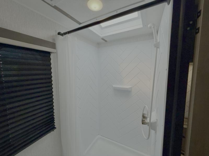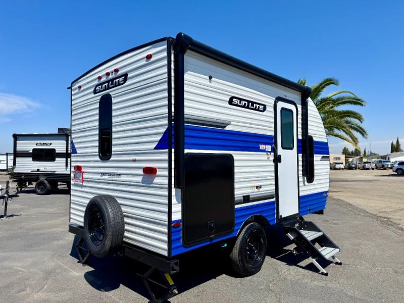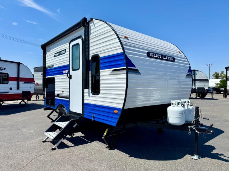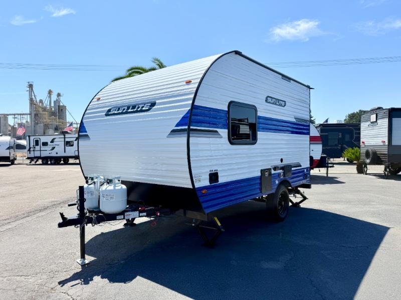 NEW Sun Lite 14RB with Rear Bath! Electric-propane water heater, 190W Solar! Exterior: White/Blue
