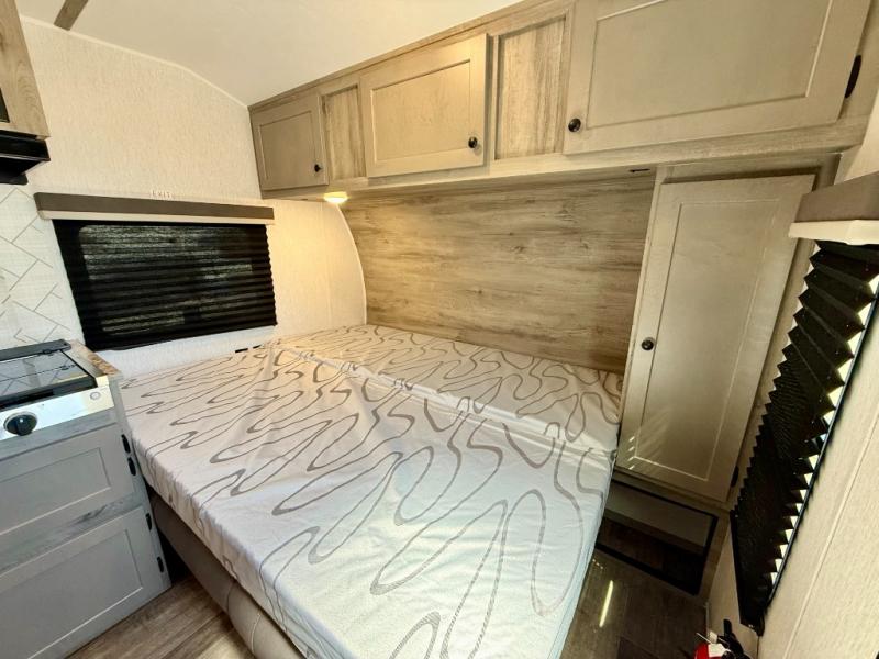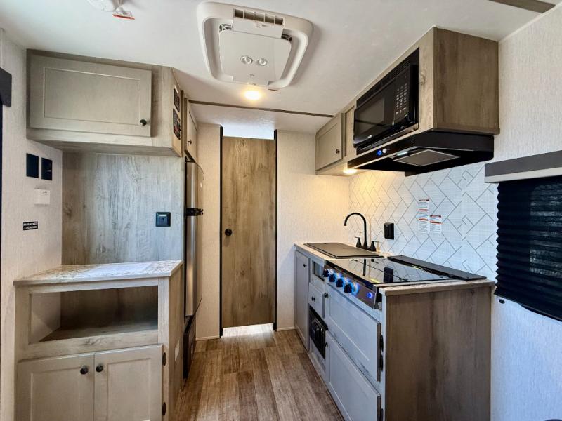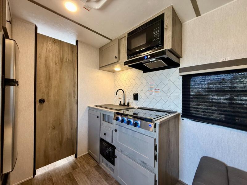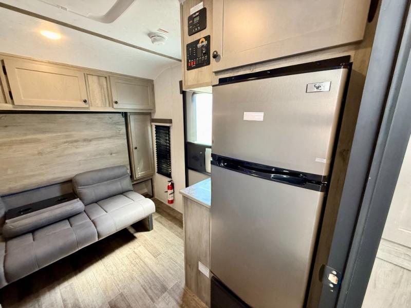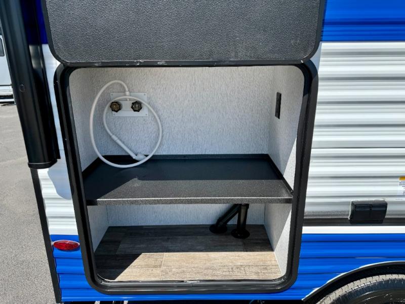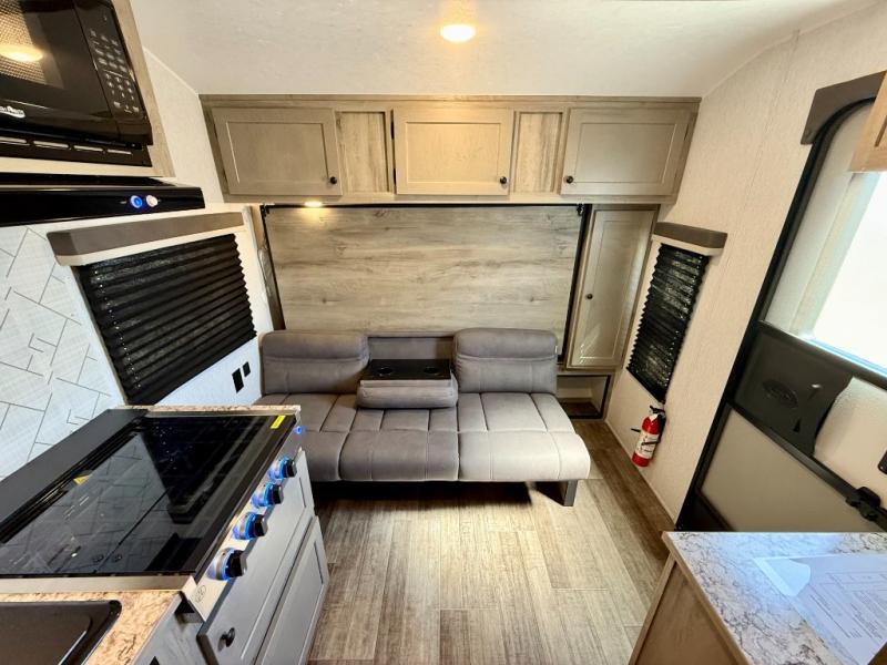 This compact travel trailer will be perfect for trips to the lake. Since there is a front Murphy bed, you won't have to sleep on an air mattress, and the convenient rear full bathroom lets you freshen up each day. Breakfast can be made on either the three burner cooktop, warmed up in the microwave oven, or even at the outside kitchen. When you're ready to wind down at night, you can grab a book and head to the sofa for a relaxing evening!