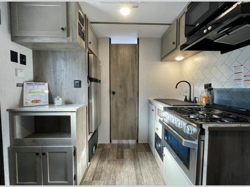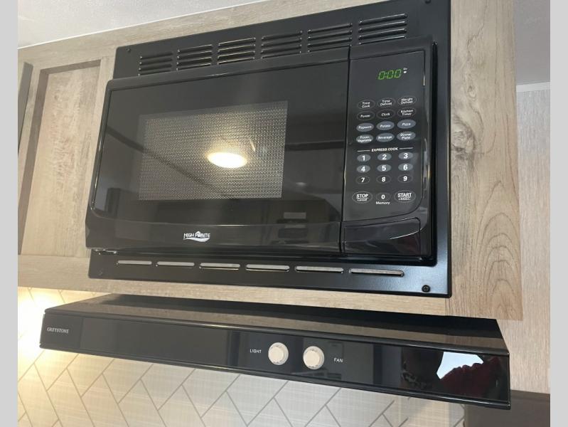 This compact travel trailer will be perfect for trips to the lake. Since there is a front Murphy bed, you won't have to sleep on an air mattress, and the convenient rear full bathroom lets you freshen up each day. Breakfast can be made on either the three burner cooktop, warmed up in the microwave oven, or even at the outside kitchen. When you're ready to wind down at night, you can grab a book and head to the sofa for a relaxing evening!